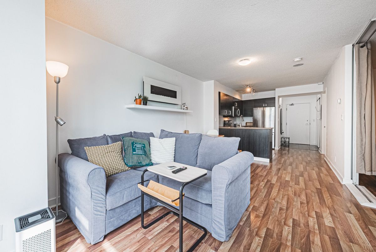 FULLY FURNISHED Stunning 1+1 Bedroom at the highly sought after Apex at Cityplace. Featuring a spacious den that can effortlessly double as a home office or second bedroom. This bright south-facing unit offers breathtaking views of the CN Tower and Rogers Centre. The updated kitchen and appliances create a modern and sleek atmosphere. The washroom features an updated vanity and toilet, ensuring a fresh and contemporary feel. This turnkey unit is ready for you to move in and enjoy. Take advantage of the wonderful amenities offered and experience the vibrant shopping and dining scene just steps away. Don't miss the opportunity to make this exceptional condo your new home.