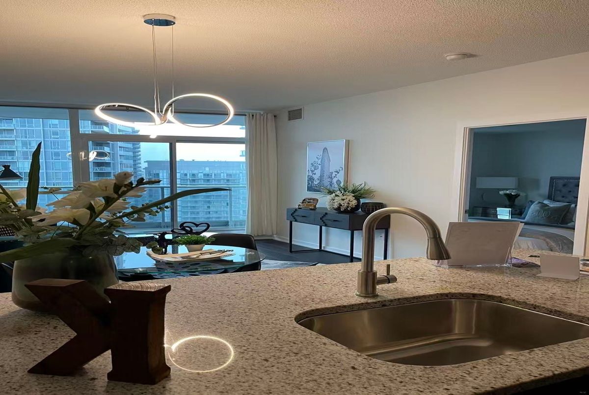 Modern Emerald City Condo with 9' Ceilings and Sun-Filled South-West Exposure!Bright and spacious open-concept layout with plenty of natural light throughout. The large den is versatile-perfect as a home office or easily used as a second bedroom. Enjoy a modern kitchen with granite countertops and a large private balcony (105 sqf), ideal for relaxing or entertaining.Situated in one of the most convenient locations in North York: Fairview Mall is right across the street, and you're just steps to Don Mills Subway Station, TTC, restaurants, shops, T&T Supermarket, and quick access to Hwy 401 & 404.Exceptional building amenities include a 24-hour concierge, indoor swimming pool, full fitness centre, party room, and more.