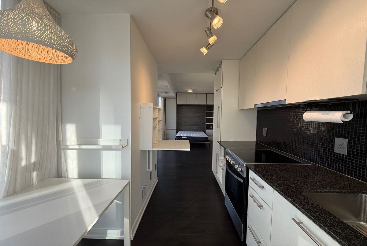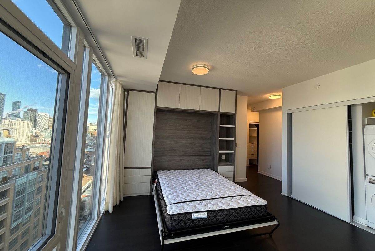 Experience urban living at its finest at The Luxurious Fabrik Condos, located in the prestigious Fashion District at Richmond & Spadina. This bright, inviting unit offers 9 ft ceilings, a full wall of windows, and an open north & west city view. Smartly designed with a built-in Murphy bed wall unit, the layout maximizes space and storage, creating a modern, efficient living experience perfect for professionals.Enjoy a sleek kitchen with S/S stove, range hood, microwave, in-cabinet fridge & dishwasher, plus stacked washer/dryer, curtains & ELFs. The space feels warm, quaint, and surprisingly spacious with its clean lines and thoughtful design.Live in one of Toronto's most vibrant neighbourhoods-steps to Queen West, boutique shopping, cafes, restaurants, nightlife, and everyday conveniences like Loblaws, City Market, LCBO & Shoppers. A true transit paradise with streetcars at your door and quick access to the Financial District, King West, OCAD, and the Entertainment District. Walk to TIFF, Grange Park, and countless galleries and landmarks.Fabrik offers excellent amenities including concierge, a stunning rooftop terrace with BBQs, gym, visitor parking, and stylish common spaces. The building is boutique, well-managed, safe, and known for its welcoming atmosphere.An ideal home for someone seeking a modern, comfortable space in the heart of everything.