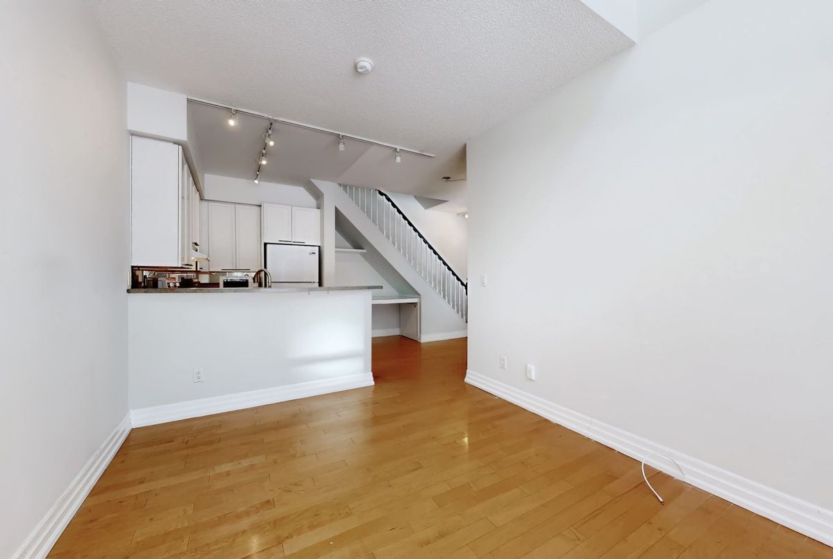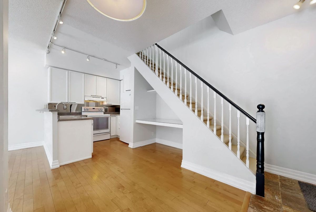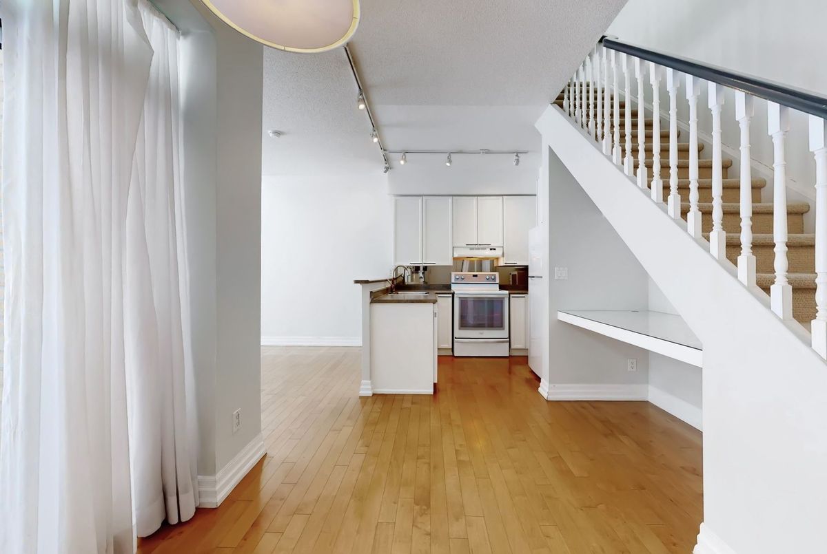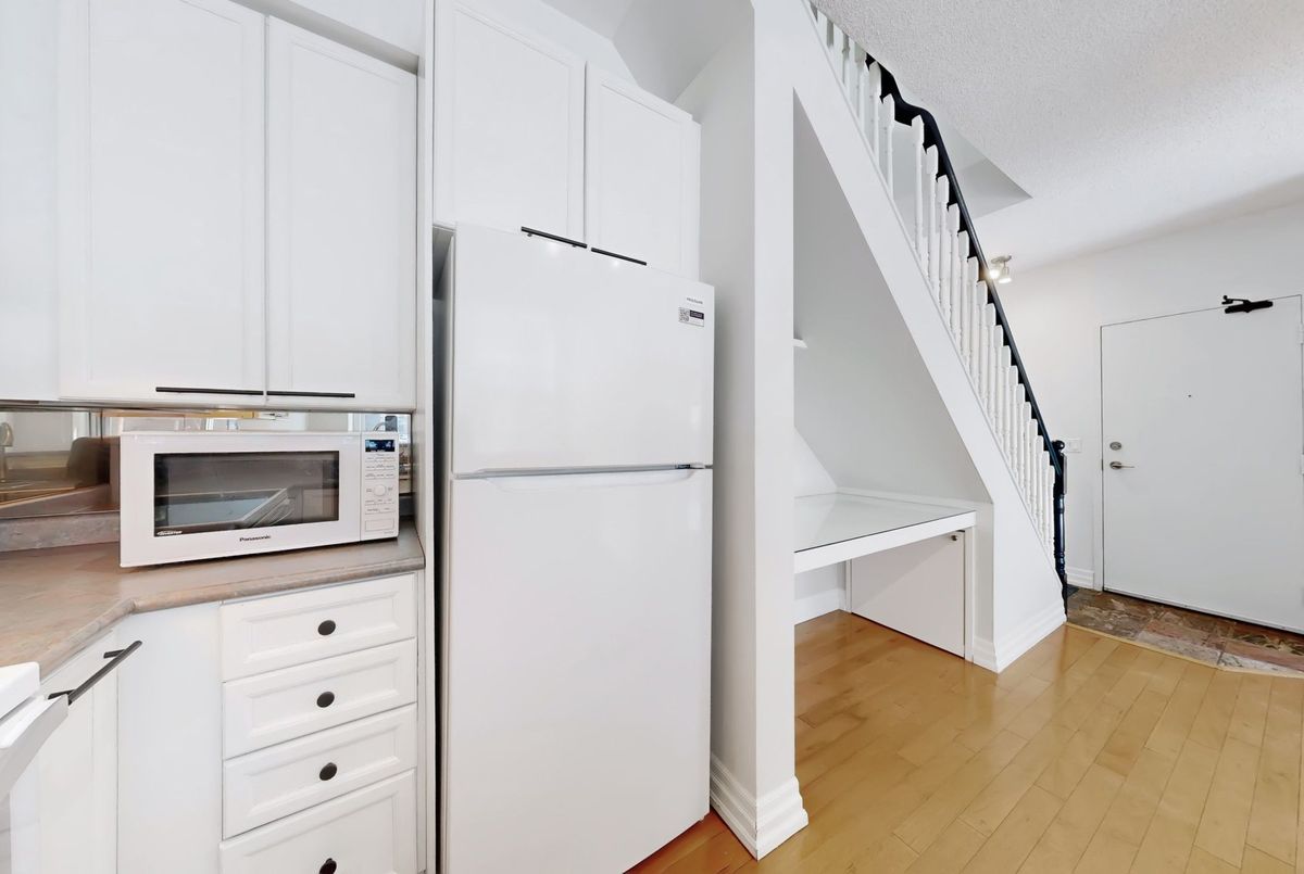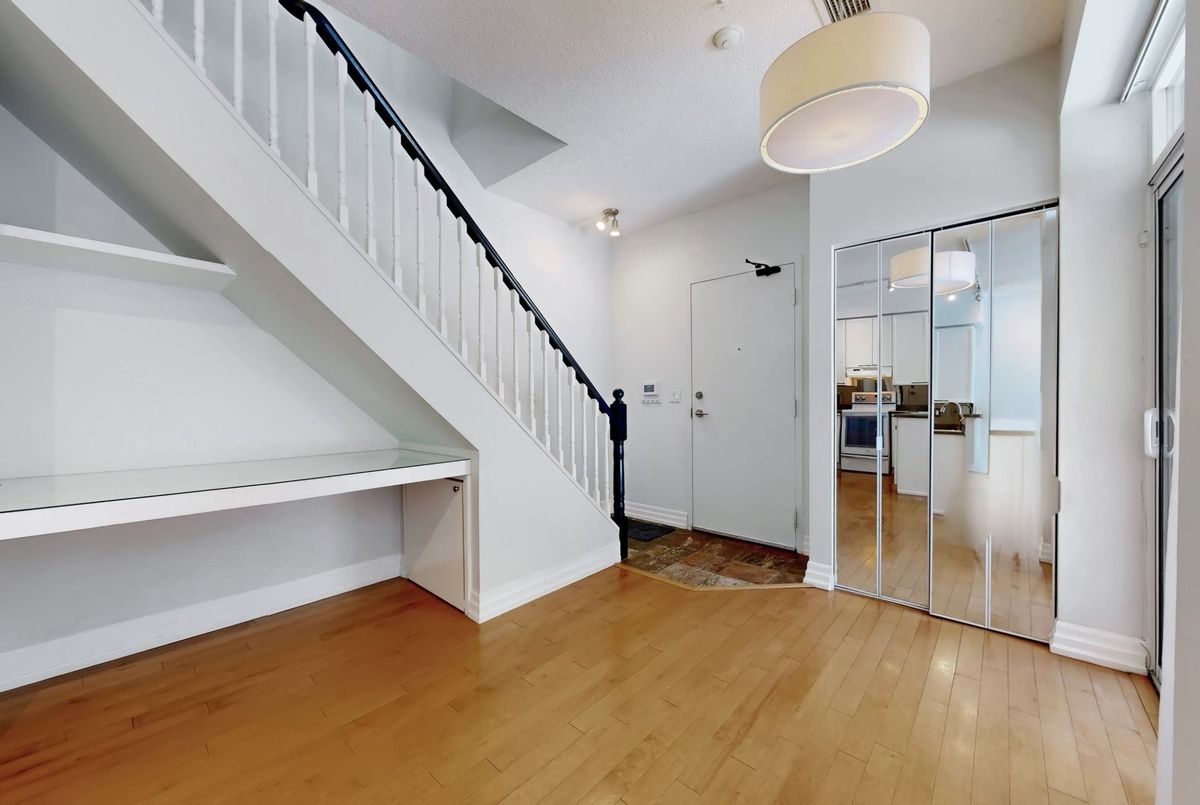 St. Lawrence Market Neighbourhood! Discover a rare two-level townhome (837 sq.ft) that offers a unique loft-like feel with two walkouts to a spacious private patio (539 sq.ft-BBQ allowed), a bright living area with 19 ft ceilings and floor-to-ceiling windows, a separate dining space and a built-in desk for a home office, ideally located across from St. Lawrence Market and minutes from the financial district and Union Station. With lots of windows, the interior offers lots of natural light. The kitchen is open concept with a breakfast bar, while the main floor features hardwood floors. The second floor includes a spacious bedroom, which will easily accommodate a king-sized bed plus space for a home office, two closets plus an ensuite washroom. Amenities include a concierge, gym, party room and stunning rooftop gardens with barbecues. Steps to local restaurants, cafes, shops and more. Easy access to the Gardiner Expressway and DVP. Walk score 100, transit 100, bike 98!