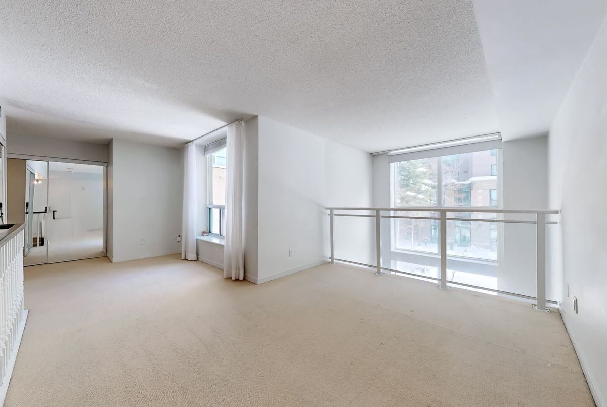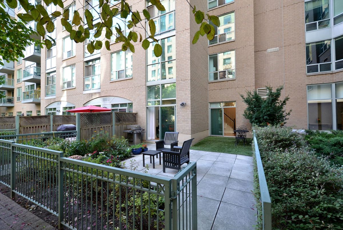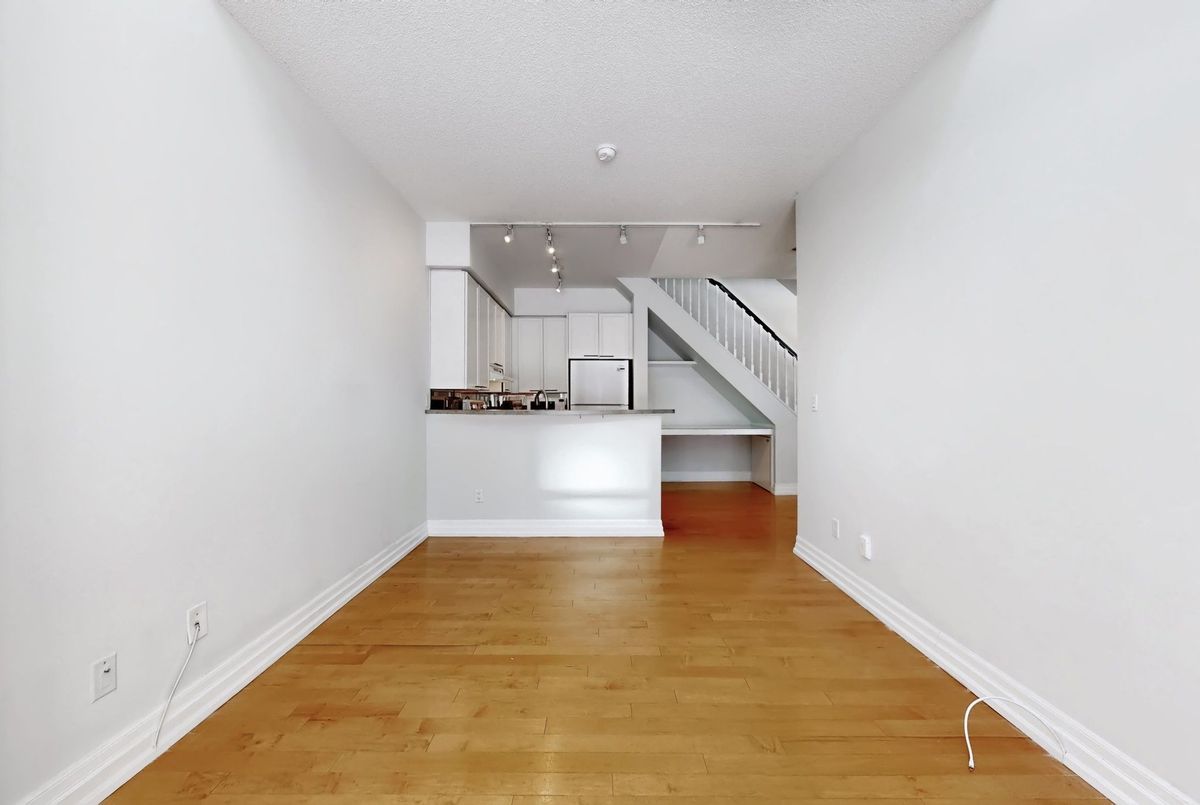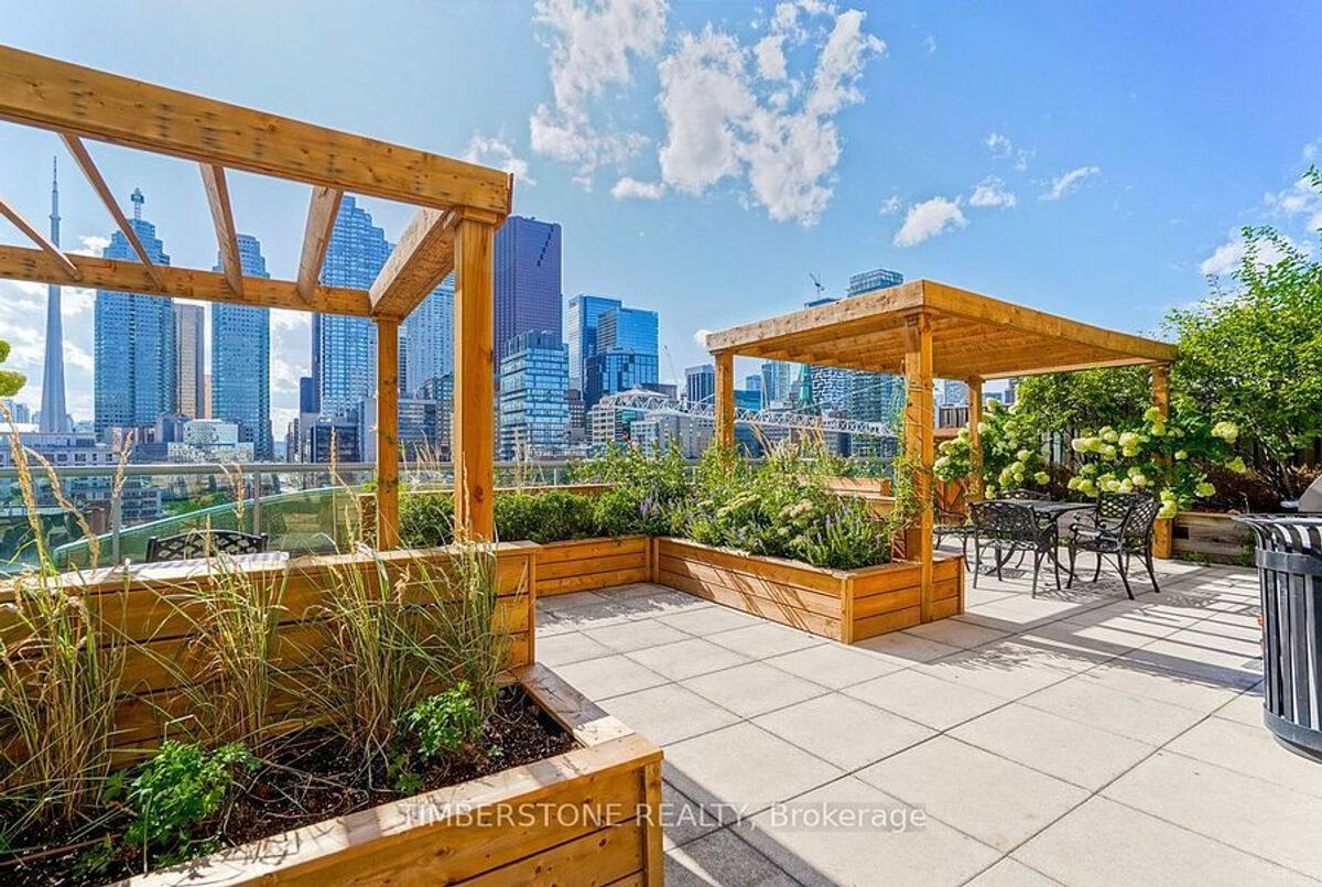St. Lawrence Market Neighbourhood! Discover a rare two-level townhome (837 sq.ft) that offers a unique loft-like feel with two walkouts to a spacious private patio (539 sq.ft-BBQ allowed), a bright living area with 19 ft ceilings and floor-to-ceiling windows, a separate dining space and a built-in desk for a home office, ideally located across from St. Lawrence Market and minutes from the financial district and Union Station. With lots of windows, the interior offers lots of natural light. The kitchen is open concept with a breakfast bar, while the main floor features hardwood floors. The second floor includes a spacious bedroom, which will easily accommodate a king-sized bed plus space for a home office, two closets plus an ensuite washroom. Amenities include a concierge, gym, party room and stunning rooftop gardens with barbecues. Steps to local restaurants, cafes, shops and more. Easy access to the Gardiner Expressway and DVP. Walk score 100, transit 100, bike 98!