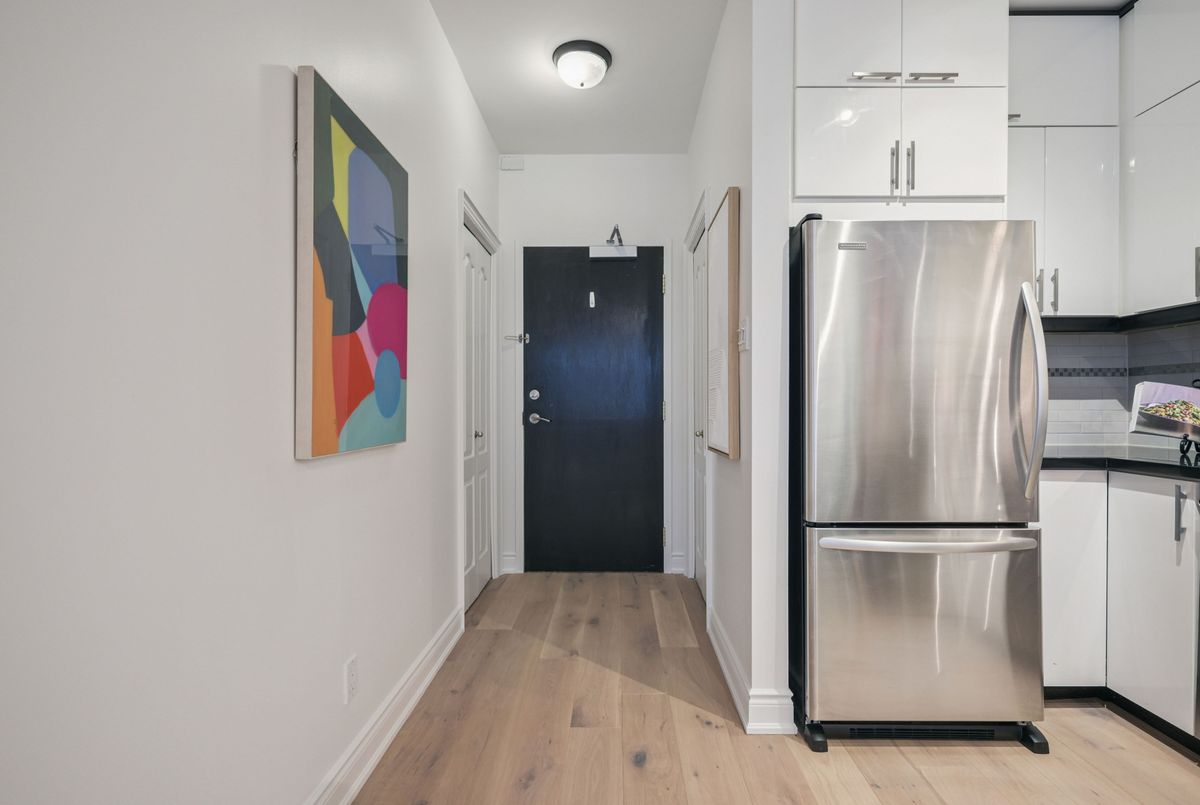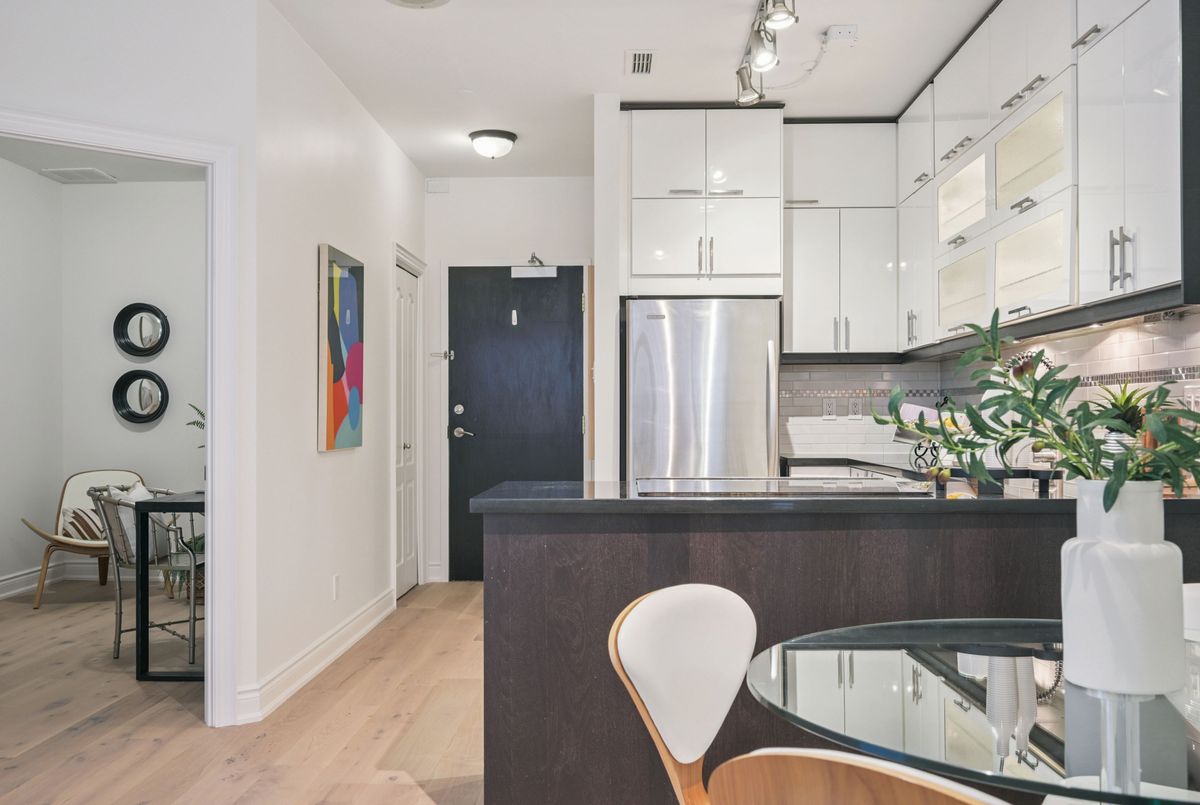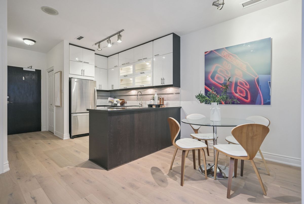 Urban sophistication meets boutique living at 393 King Street West. Nestled in the heart of Toronto's vibrant Entertainment District, this fully reimagined 1 Bedroom + Full-Size Den residence delivers style, comfort, and an unparalleled downtown lifestyle. Inside, the suite has been thoughtfully transformed with brand-new engineered flooring, a hotel-chic-inspired bathroom, and an updated modern kitchen featuring sleek stacked cabinetry, a peninsula with a full-size range, and clean, contemporary finishes. The generous full-size den-complete with a door-offers true versatility as a home office, guest room, or private creative space. Wake up each morning to iconic views of the CN Tower, and step outside to endless convenience. From world-class dining and entertainment to cultural landmarks, theatres, sports venues, and the TTC at your doorstep, this location offers the best of Toronto living at your fingertips. Located within a well-established 12-storey boutique mid-rise, The 393 on King blends style with security and comfort. Known for its rouge-tinted windows and inviting brick podium, the building offers thoughtful amenities including a fitness centre, billiards lounge, and a rooftop deck perfect for unwinding after a busy day. Whether you're seeking a stylish urban retreat or a smart investment in one of Toronto's most exciting neighbourhoods, this beautifully updated suite at 393 King Street West is the perfect place to call home.