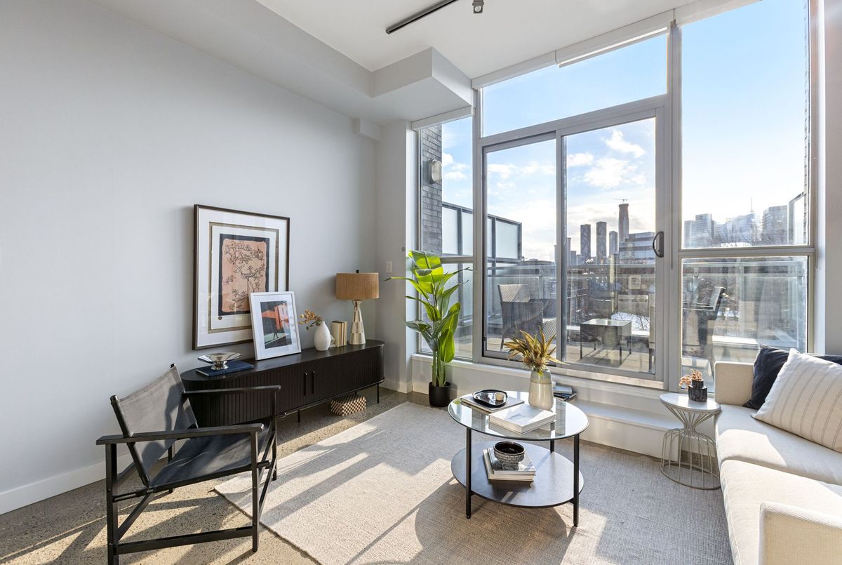 Modern loft living. Unbeatable location. Exceptional views. Welcome to stylish, urban living in the heart of Corktown! This stunning junior 1- bedroom loft offers the perfect blend of modern design and everyday functionality. Soaring ceilings and expansive west-facing windows flood the space with natural light and showcase breathtaking sunset views over the city. Step out onto your private terrace (complete with a gas hookup for BBQ) - an ideal spot for morning coffee, evening drinks, or simply unwinding while taking in the skyline. The sun-drenched kitchen is designed to impress, featuring mostly full-size stainless steel appliances, ample cabinetry, and plenty of prep space - perfect for cooking and entertaining. The open-concept layout maximizes every square foot, while the defined sleeping area offers comfort and privacy. This loft includes a 4-piece washroom, generous storage throughout, plus the convenience of a full-sized stacked washing machine and dryer. Building amenities include: gym, party room, rooftop terrace and meeting room! Commuting is a breeze, being close to several transit lines, and just minutes to the Don Valley Parkway (DVP). Enjoy being steps from some of the city's best shops, cafes, and restaurants!