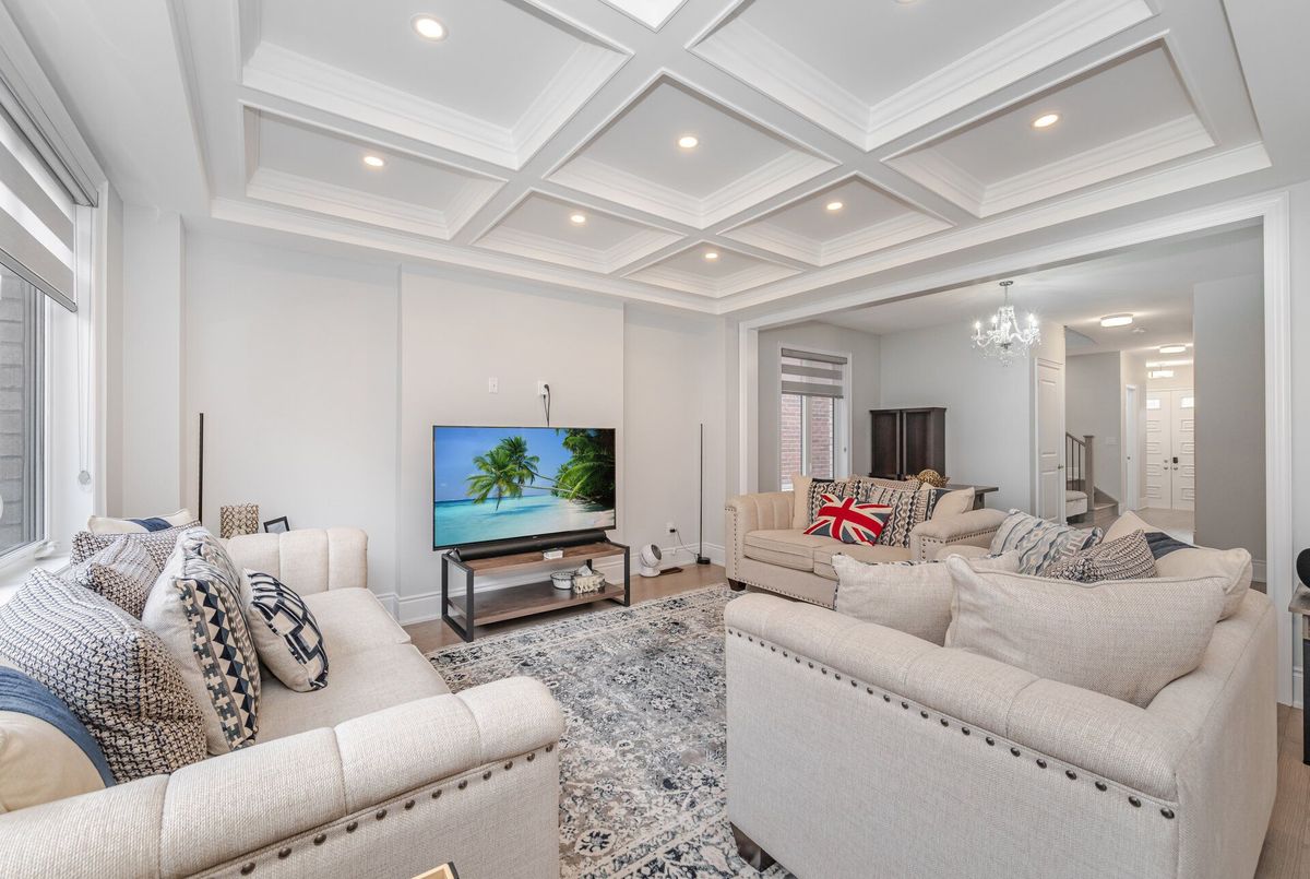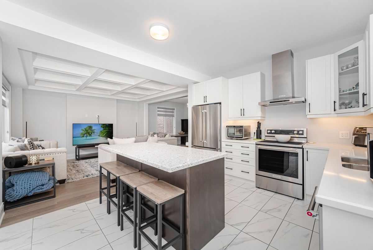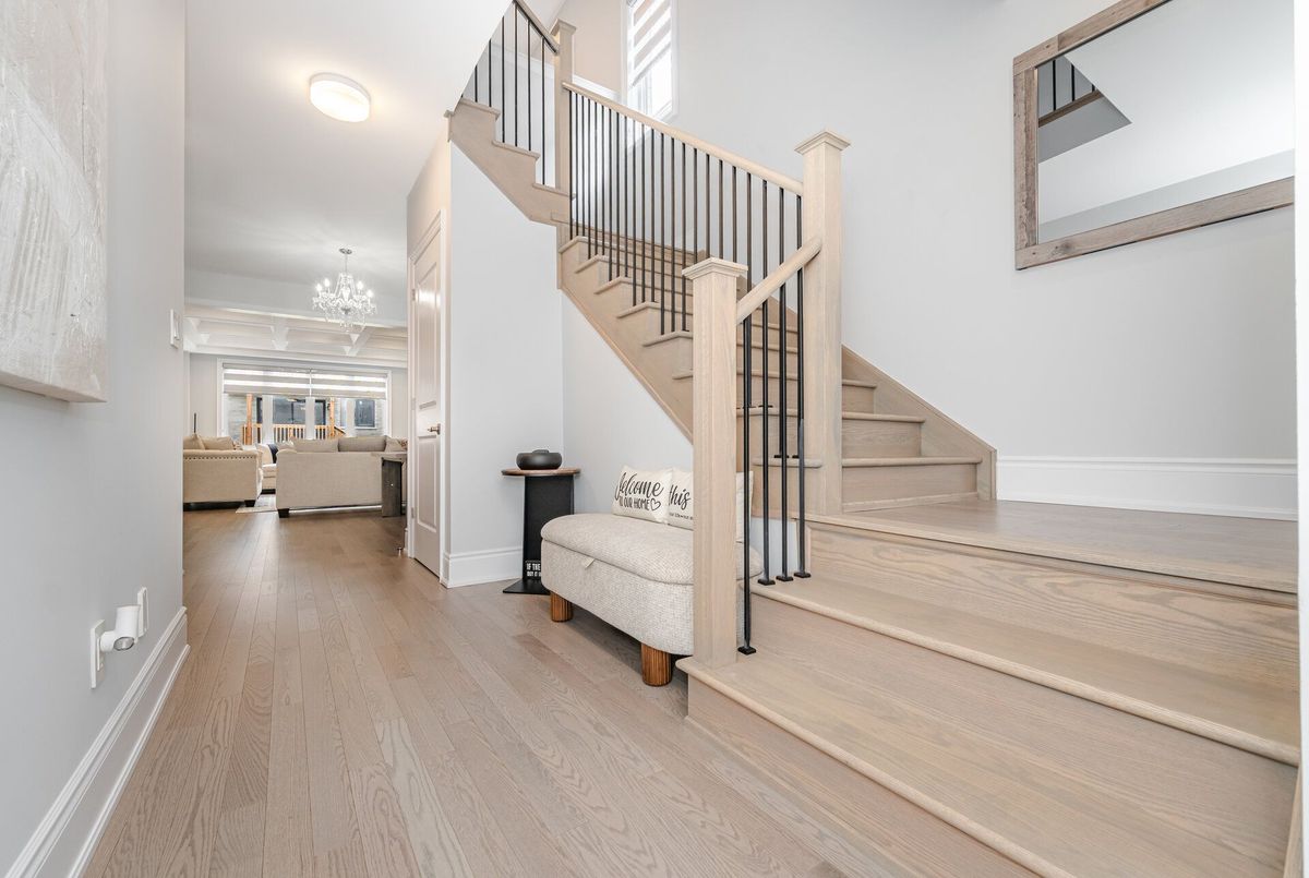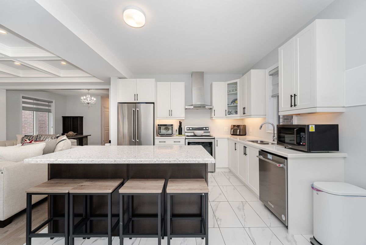 Luxury living in Midhurst Community with a grand front double door entry leading to a carpet-free, super-clean interior boasting high-end finishes, quartz countertops, sun-filled rooms, a cozy family room with fireplace and coffered ceiling, modern roll-up window blinds, a sleek kitchen with central island, hardwood floors throughout, a main-floor office, soaring 9-foot ceilings on both levels, basement separate entrance door, garage door openers with built-in cameras, a primary bedroom with a 6-piece ensuite, an upper-level entertaining den, a separate laundry room and move-in-ready perfection just steps from Hickling recreational trails, a golf club and Snow Valley ski resort.