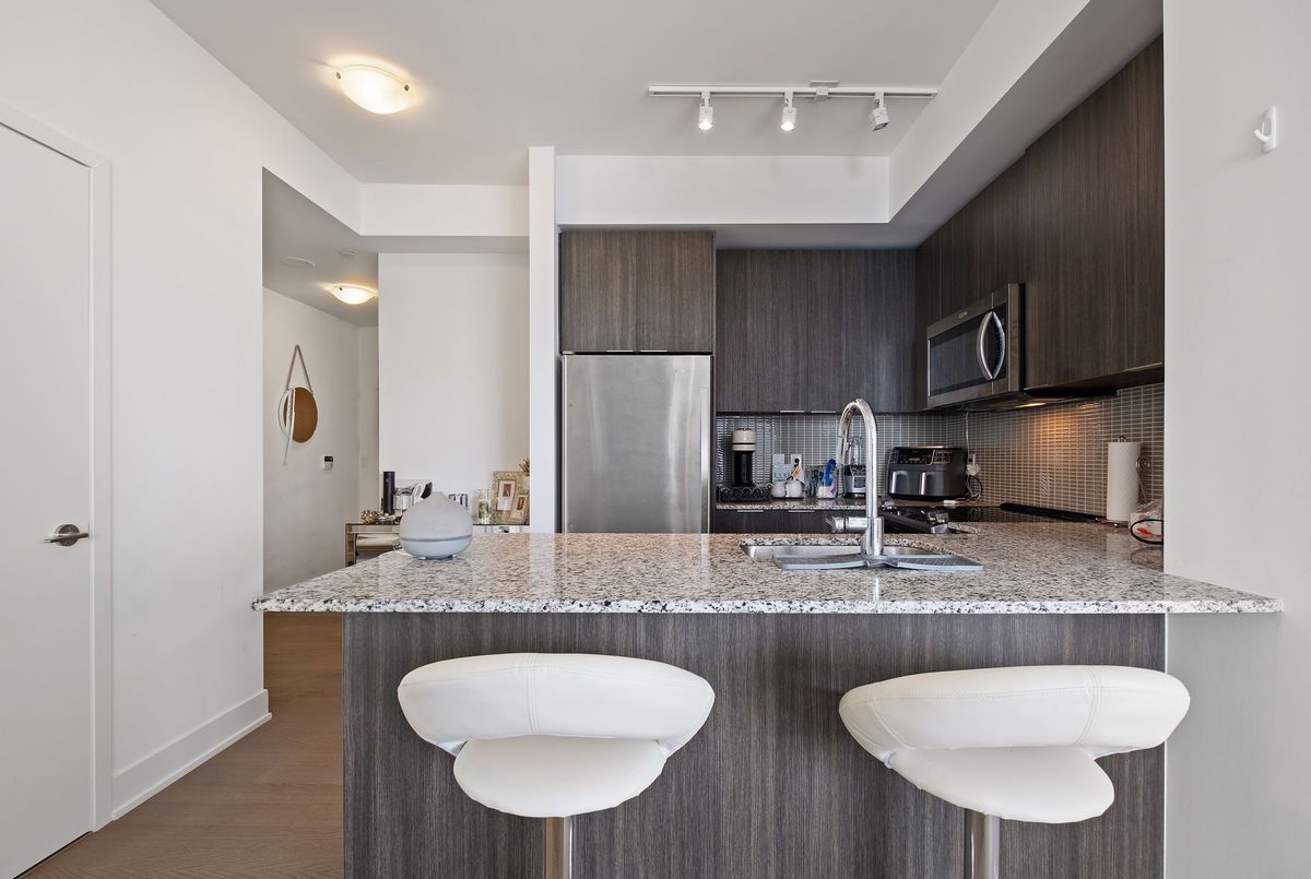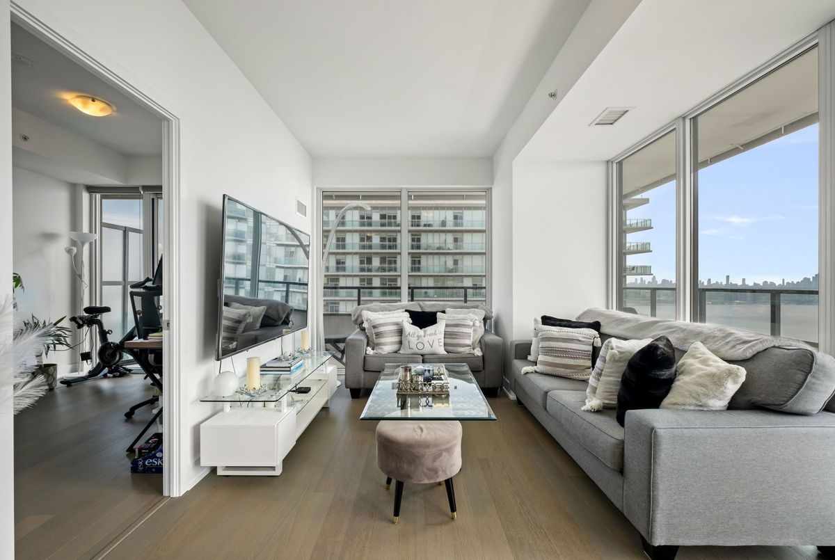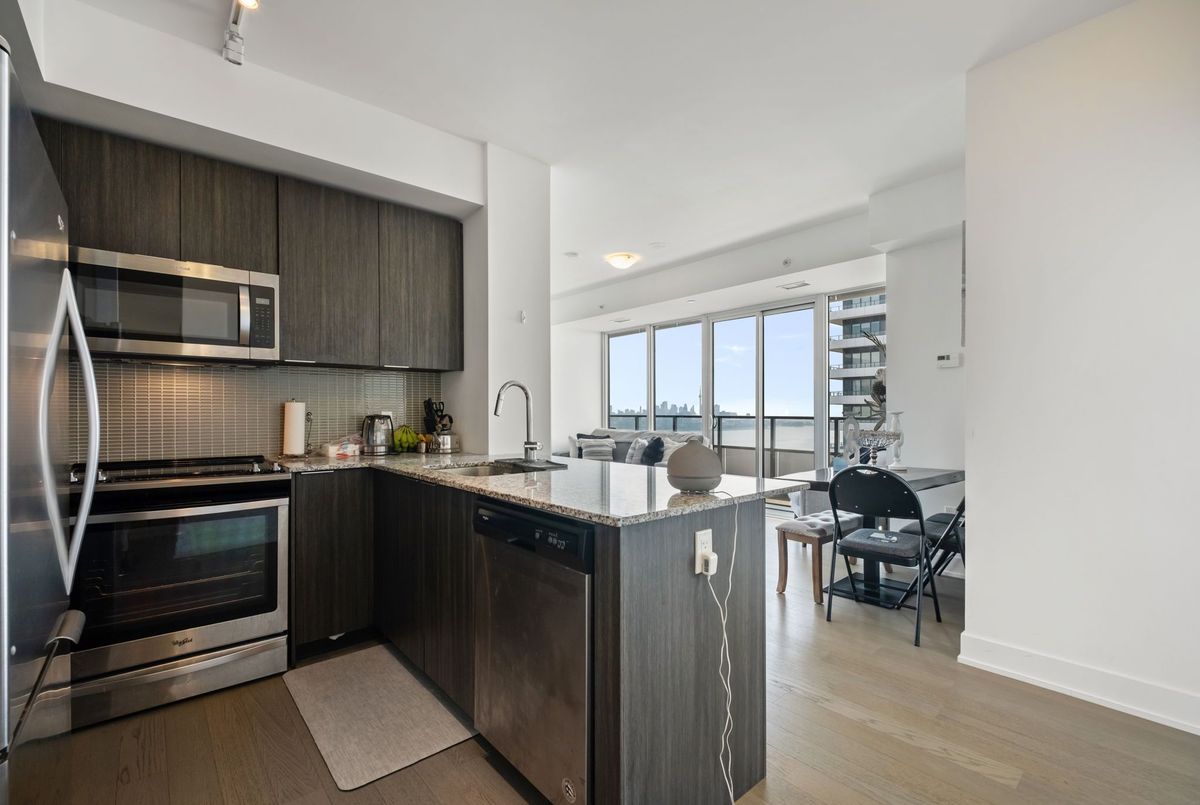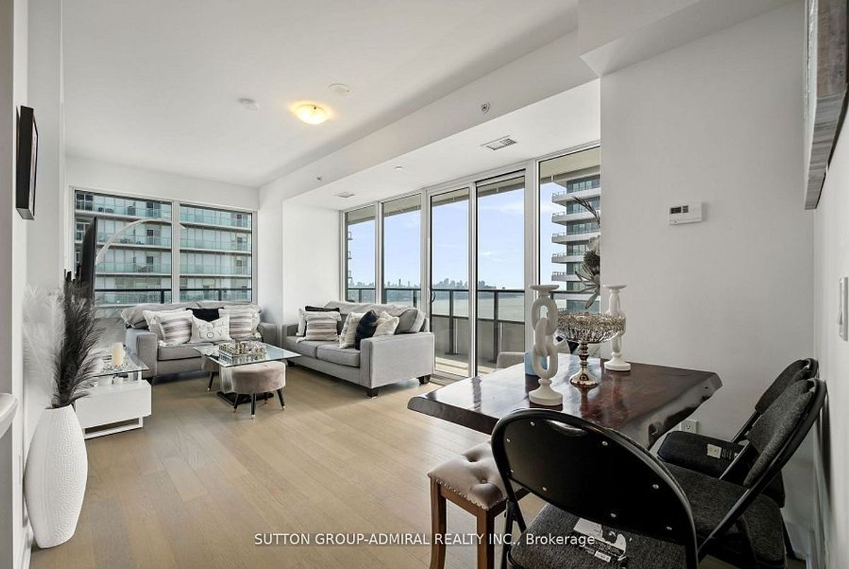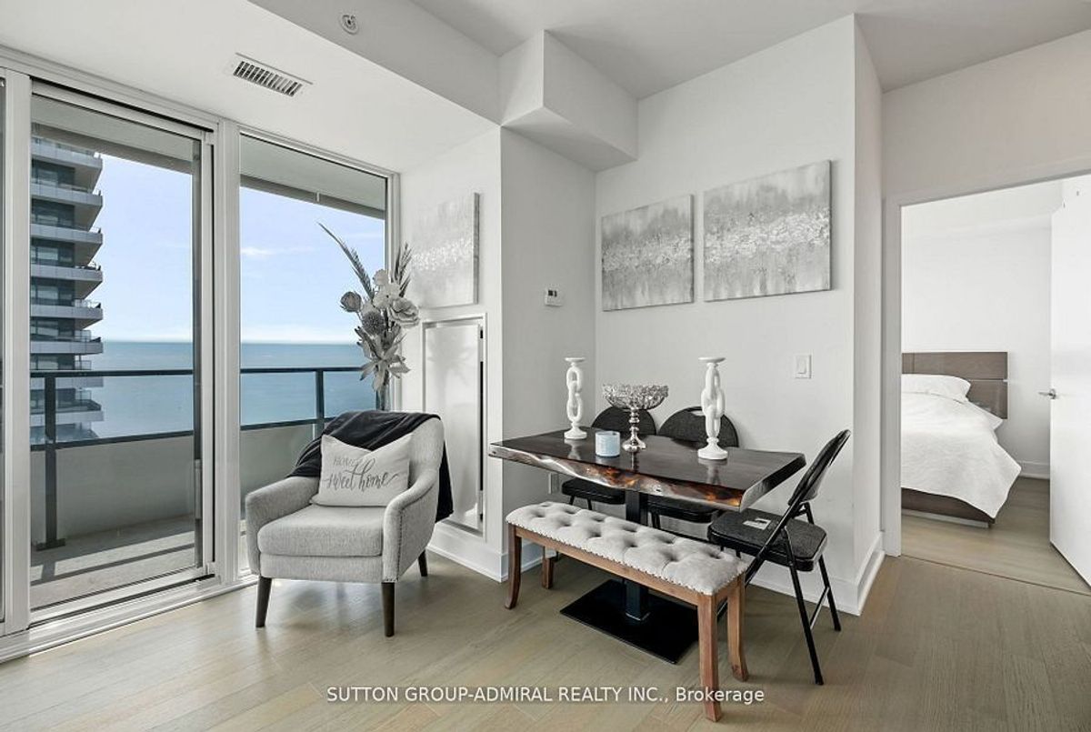 Stunning 2-bedroom, 2-bathroom corner unit in the prestigious Waterfront Sky Tower. This bright and spacious condo features high-end modern finishes, including granite countertops, engineered hardwood flooring, and stainless steel appliances. With 9-foot ceilings and upgraded window coverings, every detail is designed for luxury. Enjoy breathtaking, unobstructed views of the lake, marina, and the Toronto skyline from the expansive wrap-around balcony. The building offers top-tier amenities such as a state-of-the-art gym, yoga room, indoor pool and hot tub, outdoor terrace, games room, party room, visitor parking, and 24-hour concierge service **EXTRAS** Appliances (Fridge, cooktop, oven, Dishwasher, Microwave) Washer And Dryer, All Light Fixtures included Storage Locker and parking included