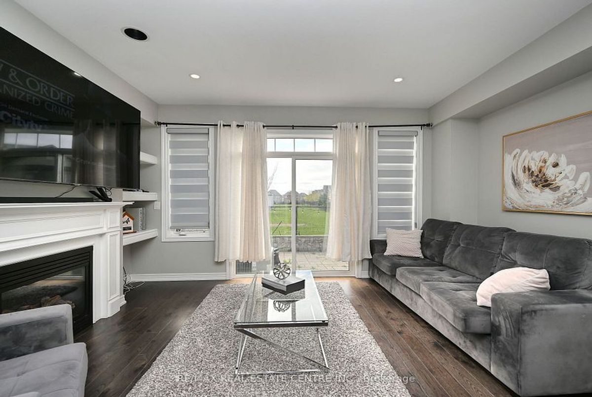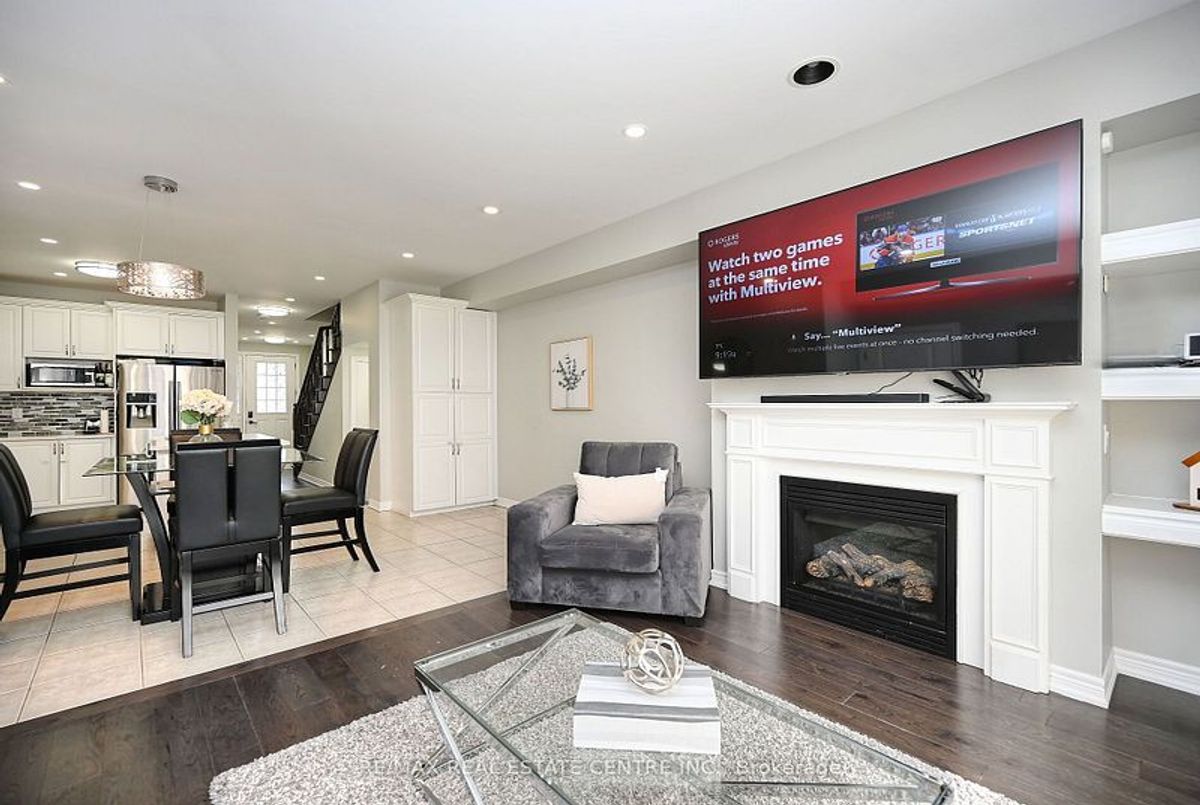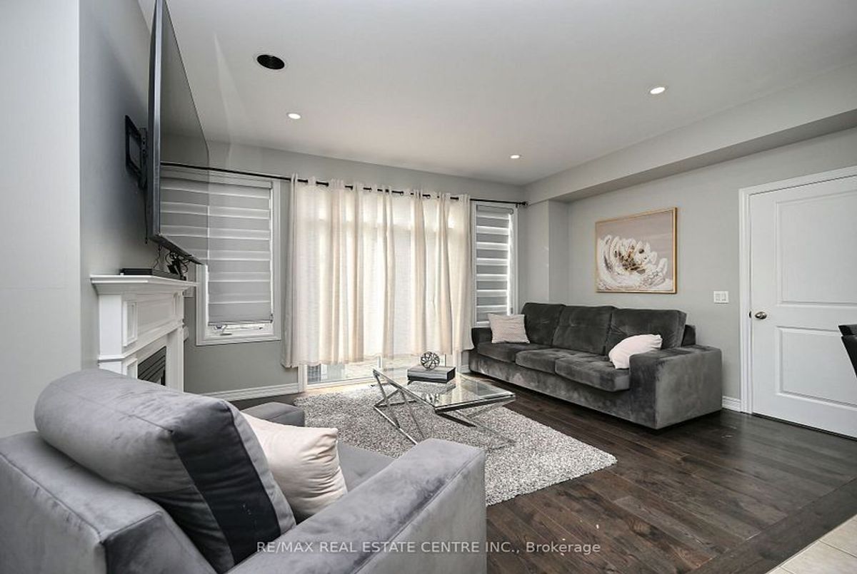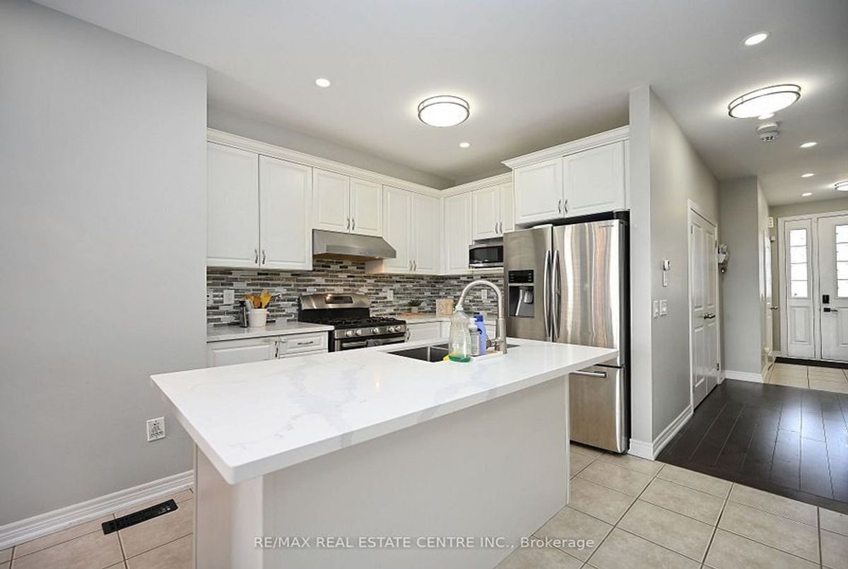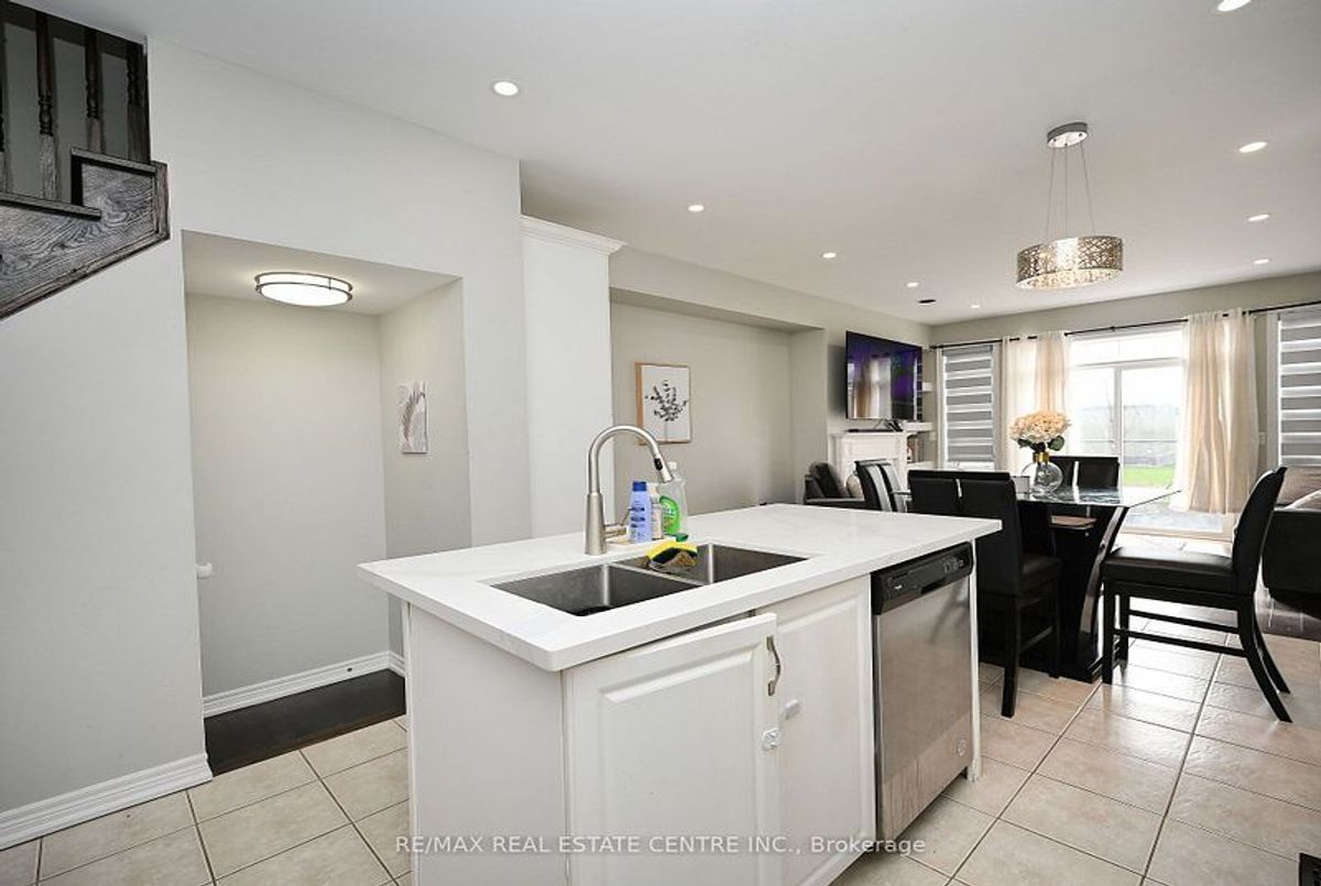 This well-maintained 3-bedroom, 2-storey freehold townhouse in the Mount Pleasant community features 9-foot smooth ceilings on the main floor, pot lights, and an open-concept layout. The kitchen includes a glass mosaic backsplash, porcelain tile flooring, a large centre island with quartz countertops, and stainless steel appliances. The living room has a gas fireplace, built-in niche, and walkout to a stone patio with no home behind. Upstairs offers laminate flooring throughout, a stained oak staircase, and a primary bedroom with a 6-piece ensuite featuring double sinks, granite countertop, soaker tub, glass shower, and a walk-in closet. Two additional bedrooms share a 4-piece bathroom with granite counter. The basement is unfinished and ready for future use.