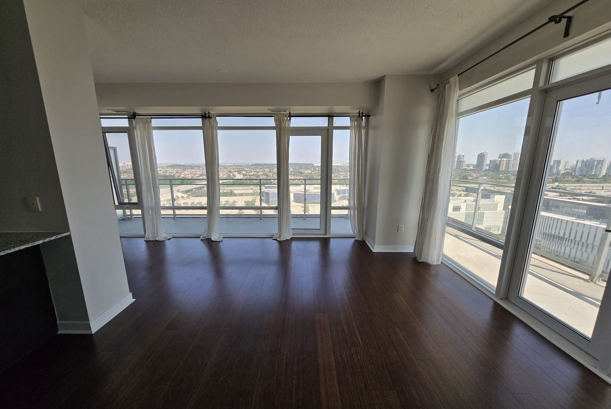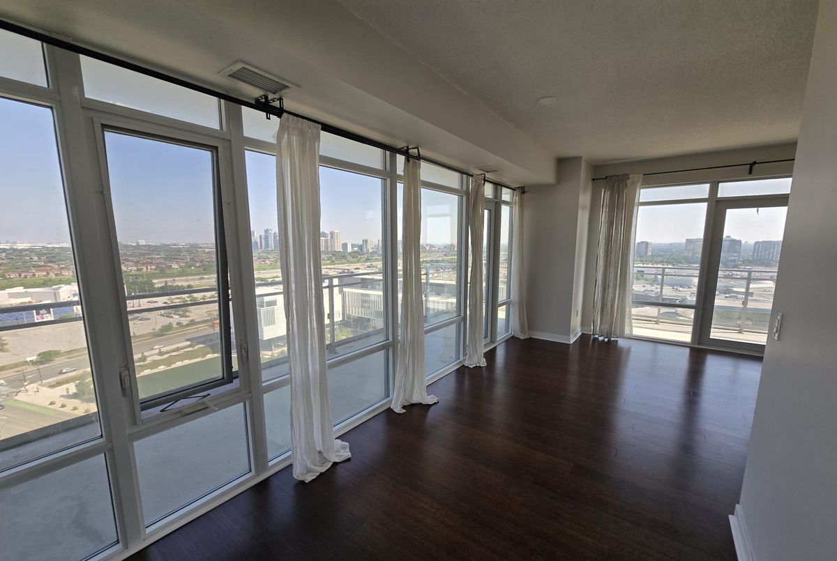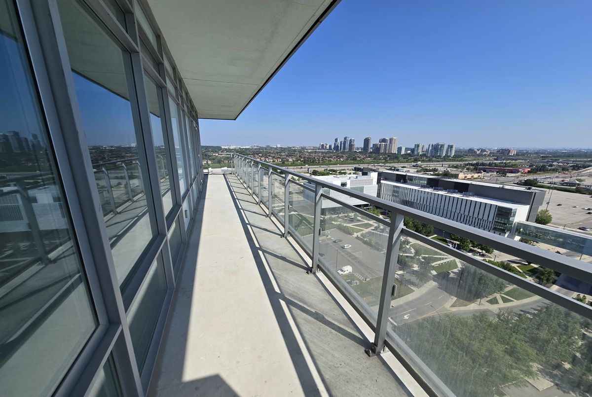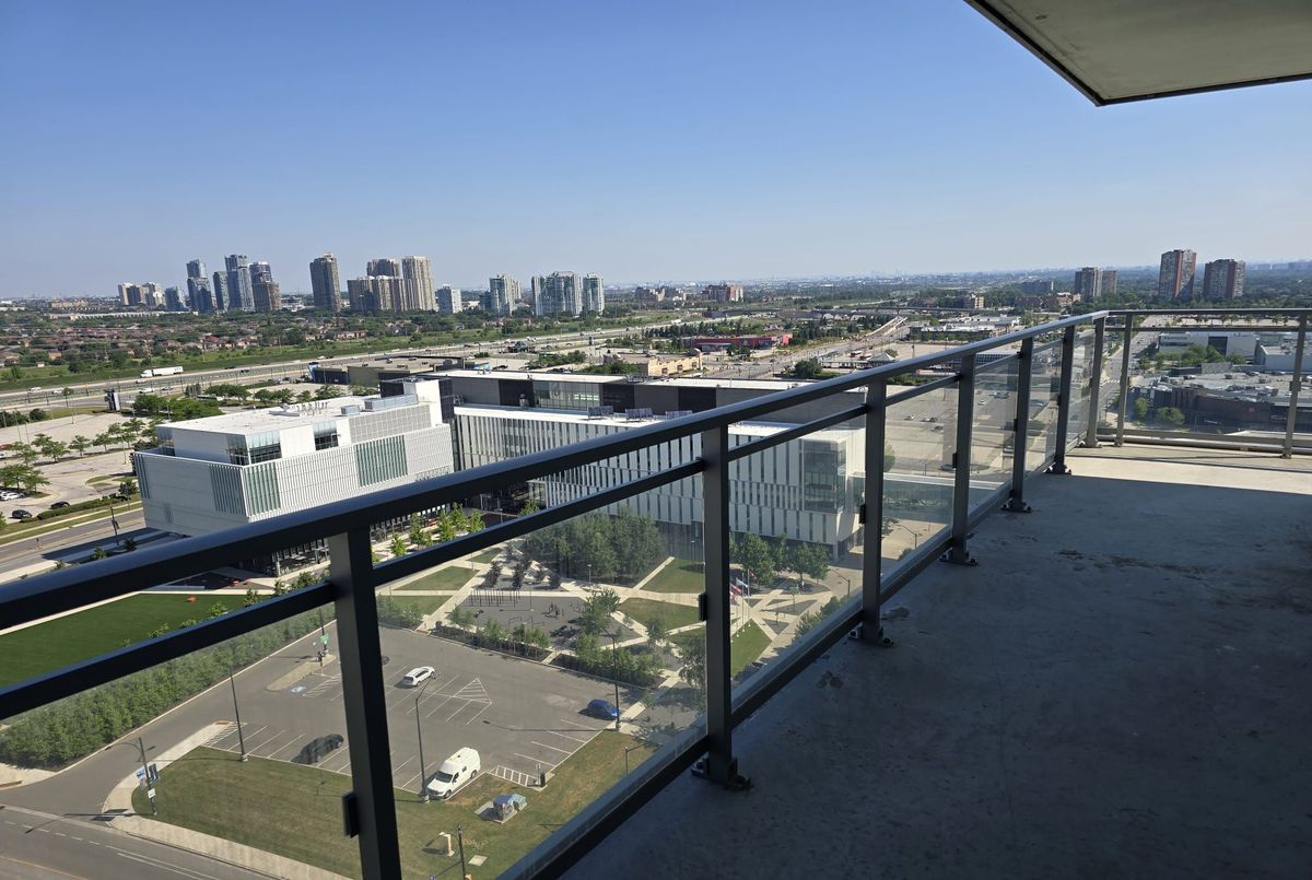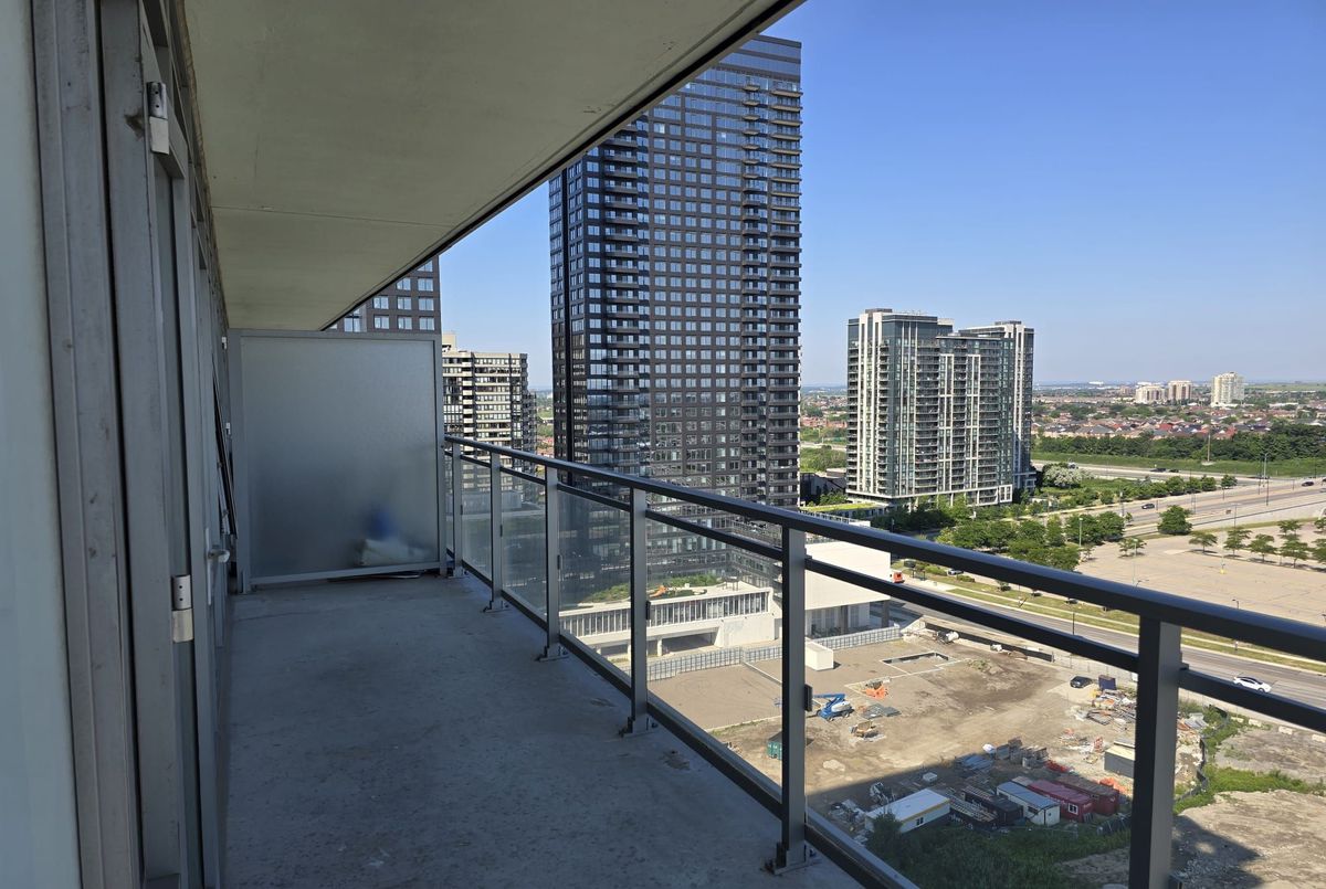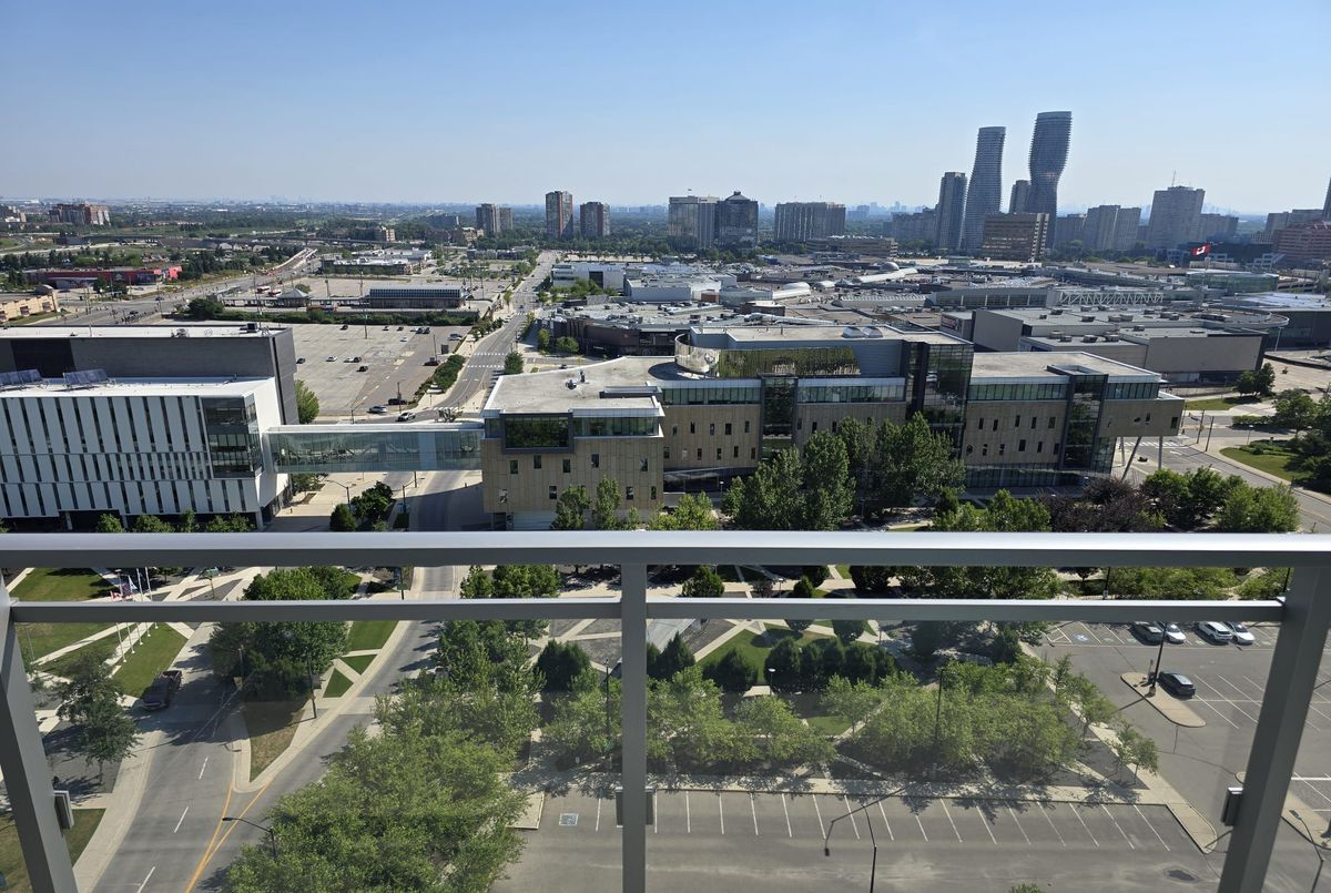 Immaculate and elegant 1 Bed + Den with 2 Baths, 716 square feet of living space + over 300 sq ft. Balcony, Corner Unit nestled on the 17th. Floor. of an Excellent building located in the Downtown Mississauga (the City Centre). Built in 2012. ***A great investment property or for enjoying yourself***. ***Located just across Sheridan College Campus***. Comes with immense wrap around balcony offering stunning panoramic unobstructed North/ Easterly view. Enjoy both the sunrise and the sunset. This Beauty is bright like crystal complemented with 9 ft. Ceiling. Floor to ceiling windows all over. Great Open concept Layout. Generous sized Master Bed is appointed with its own private 4 Pc Bath. Large Den can be put to a number of uses. Modern Kitchen features stainless Steel Appliances and a lot of closets. Hardwood Floors add texture and luxury to this elegant place. 2 Pc Bath in the foyer is also a great feature. Ensuite Front Loader Laundry. Comes with one underground parking and one owned locker. Freshly Painted in a beautiful Neutral color. Updated Light fixtures. Unbeatable city centre Location. Close to all amenities. Just across from Sheridan College. steps to Public Transit. A few minutes walk to Square One Mall, Library, celebration square, Restaurants and much much more. Shows A+++. Please do yourself a favor by visiting it asap. This place offers an unmatched clear view from the entire apartment. A great home for fresh starters, students, professionals, retirees and all. Priced to Sell. Freshly painted.