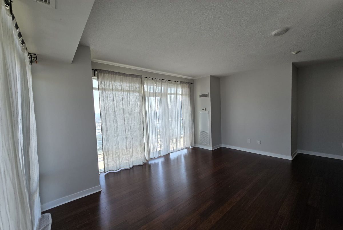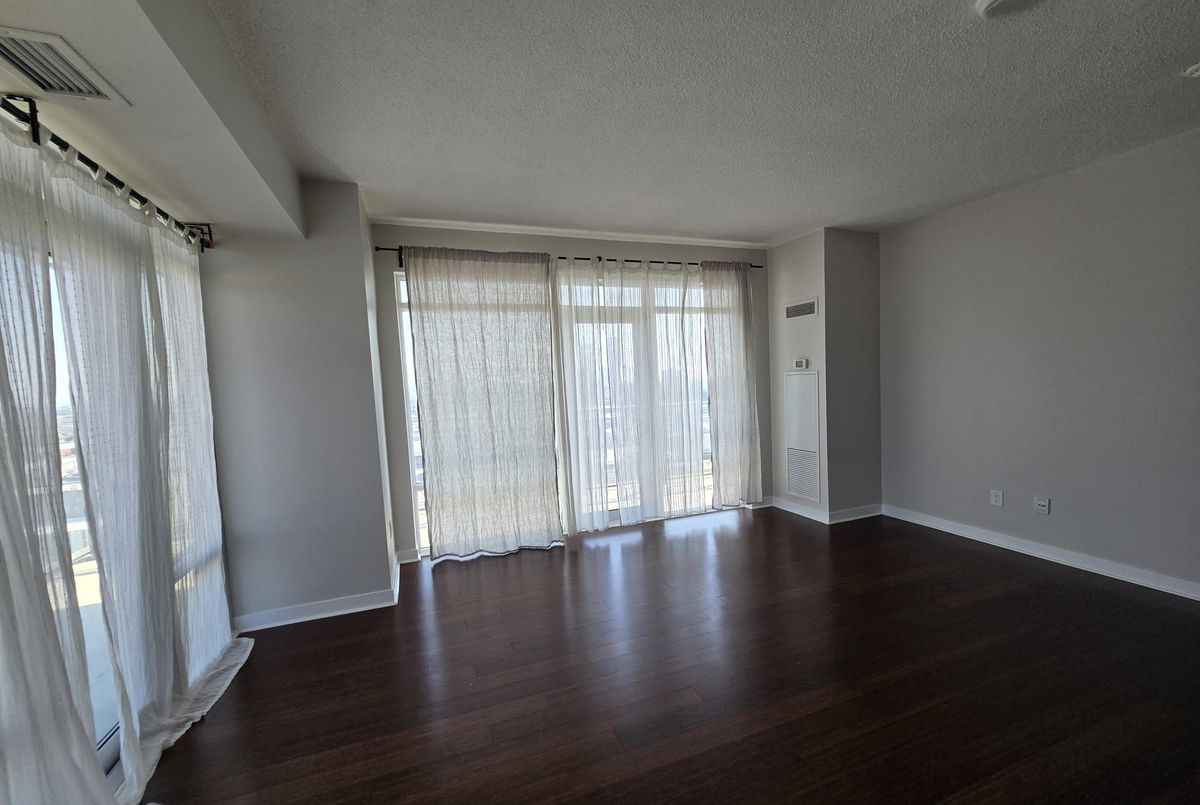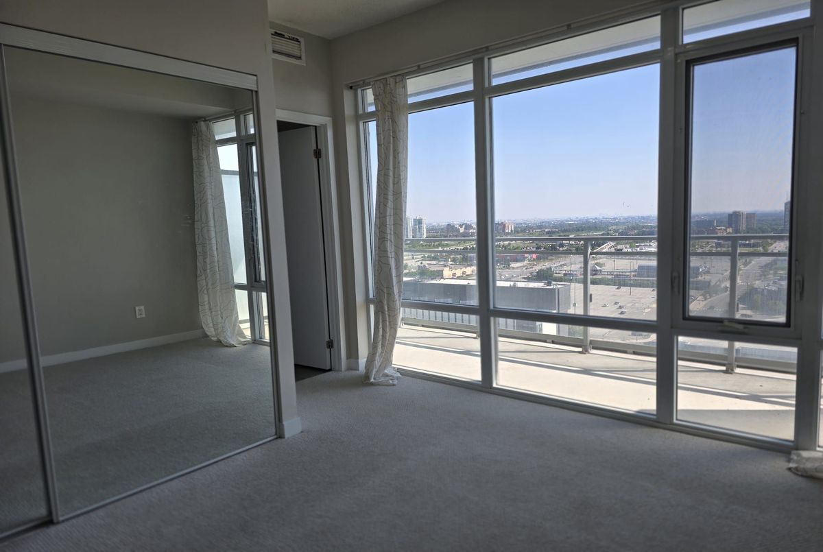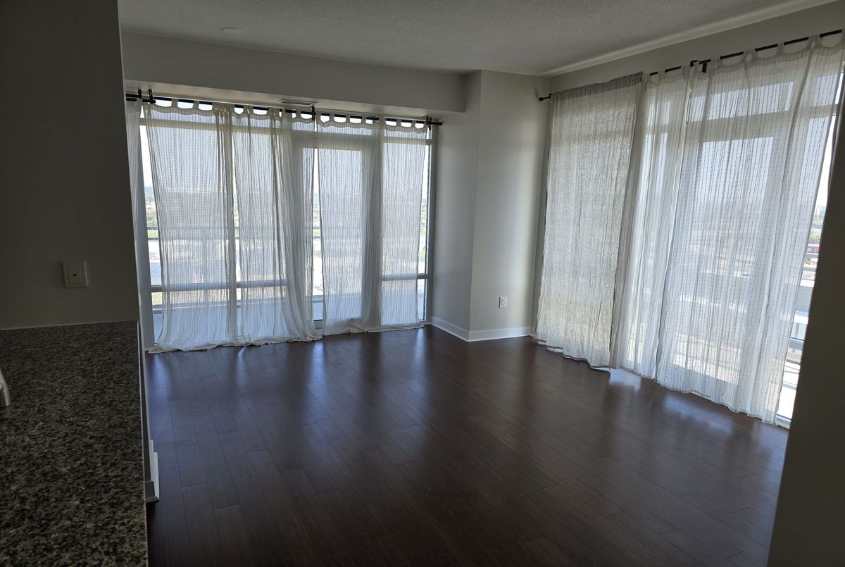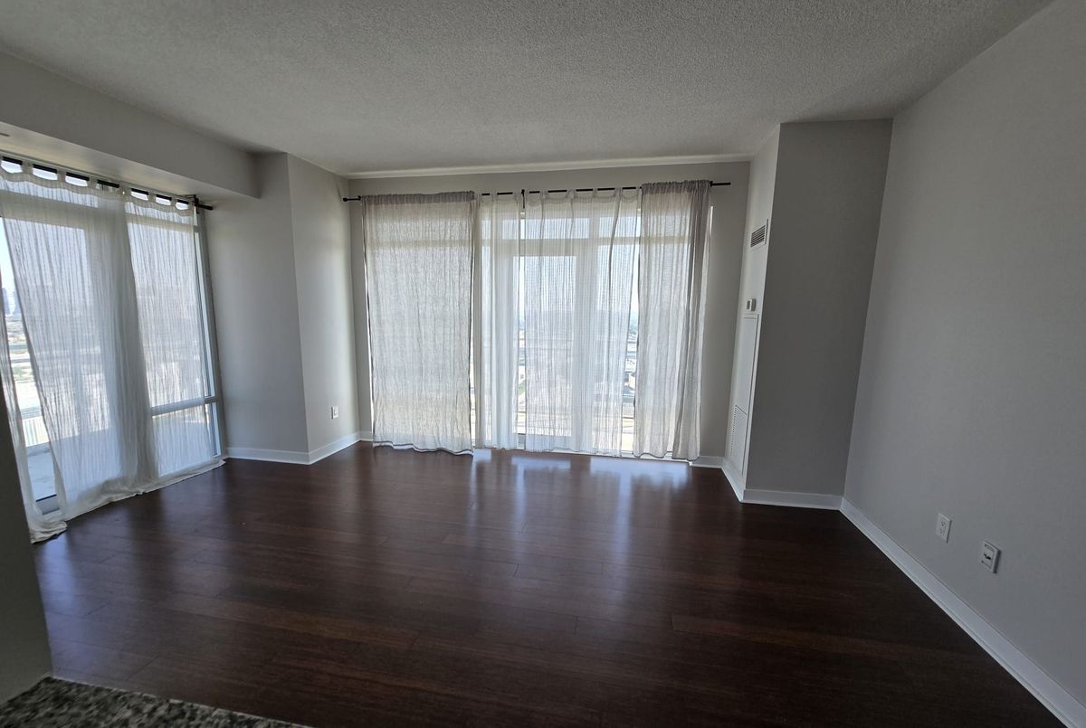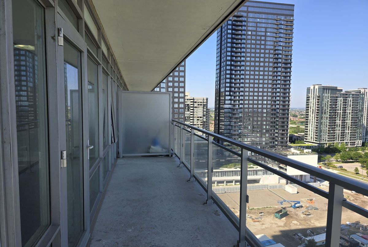 Immaculate and elegant 1 Bed + Den with 2 Baths, 716 square feet of living space + over 300 sq ft. Balcony, Corner Unit nestled on the 17th. Floor. of an Excellent building located in the Downtown Mississauga (the City Centre). Built in 2012. ***A great investment property or for enjoying yourself***. ***Located just across Sheridan College Campus***. Comes with immense wrap around balcony offering stunning panoramic unobstructed North/ Easterly view. Enjoy both the sunrise and the sunset. This Beauty is bright like crystal complemented with 9 ft. Ceiling. Floor to ceiling windows all over. Great Open concept Layout. Generous sized Master Bed is appointed with its own private 4 Pc Bath. Large Den can be put to a number of uses. Modern Kitchen features stainless Steel Appliances and a lot of closets. Hardwood Floors add texture and luxury to this elegant place. 2 Pc Bath in the foyer is also a great feature. Ensuite Front Loader Laundry. Comes with one underground parking and one owned locker. Freshly Painted in a beautiful Neutral color. Updated Light fixtures. Unbeatable city centre Location. Close to all amenities. Just across from Sheridan College. steps to Public Transit. A few minutes walk to Square One Mall, Library, celebration square, Restaurants and much much more. Shows A+++. Please do yourself a favor by visiting it asap. This place offers an unmatched clear view from the entire apartment. A great home for fresh starters, students, professionals, retirees and all. Priced to Sell. Freshly painted.