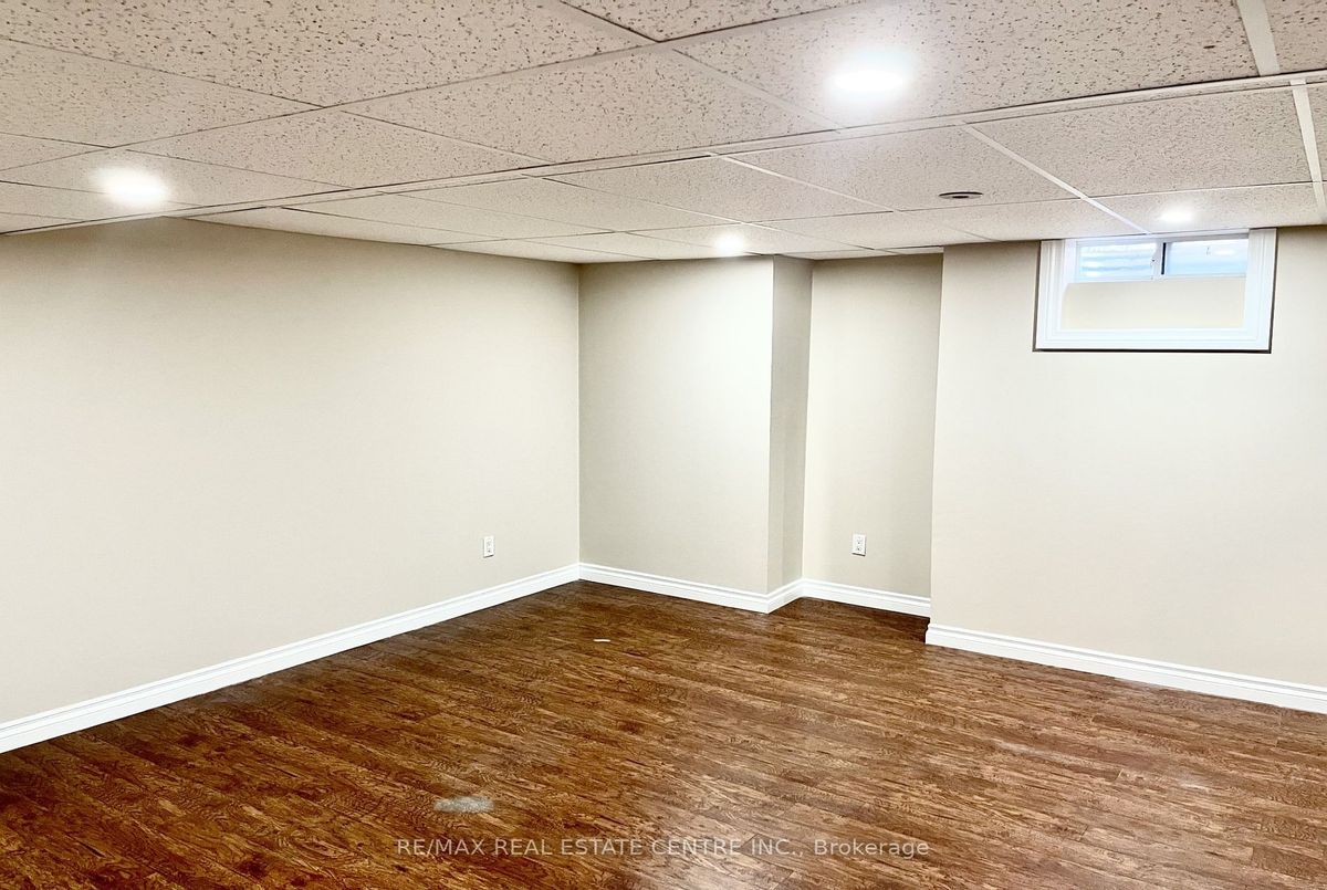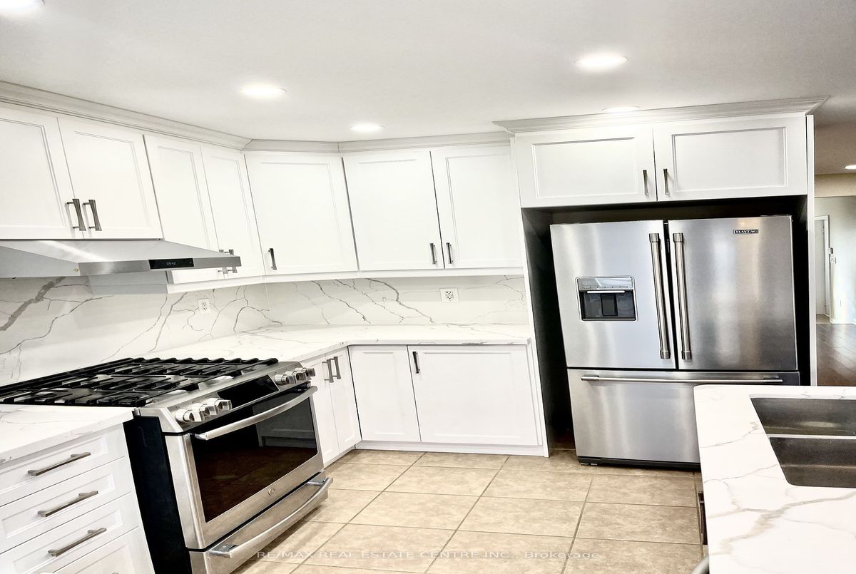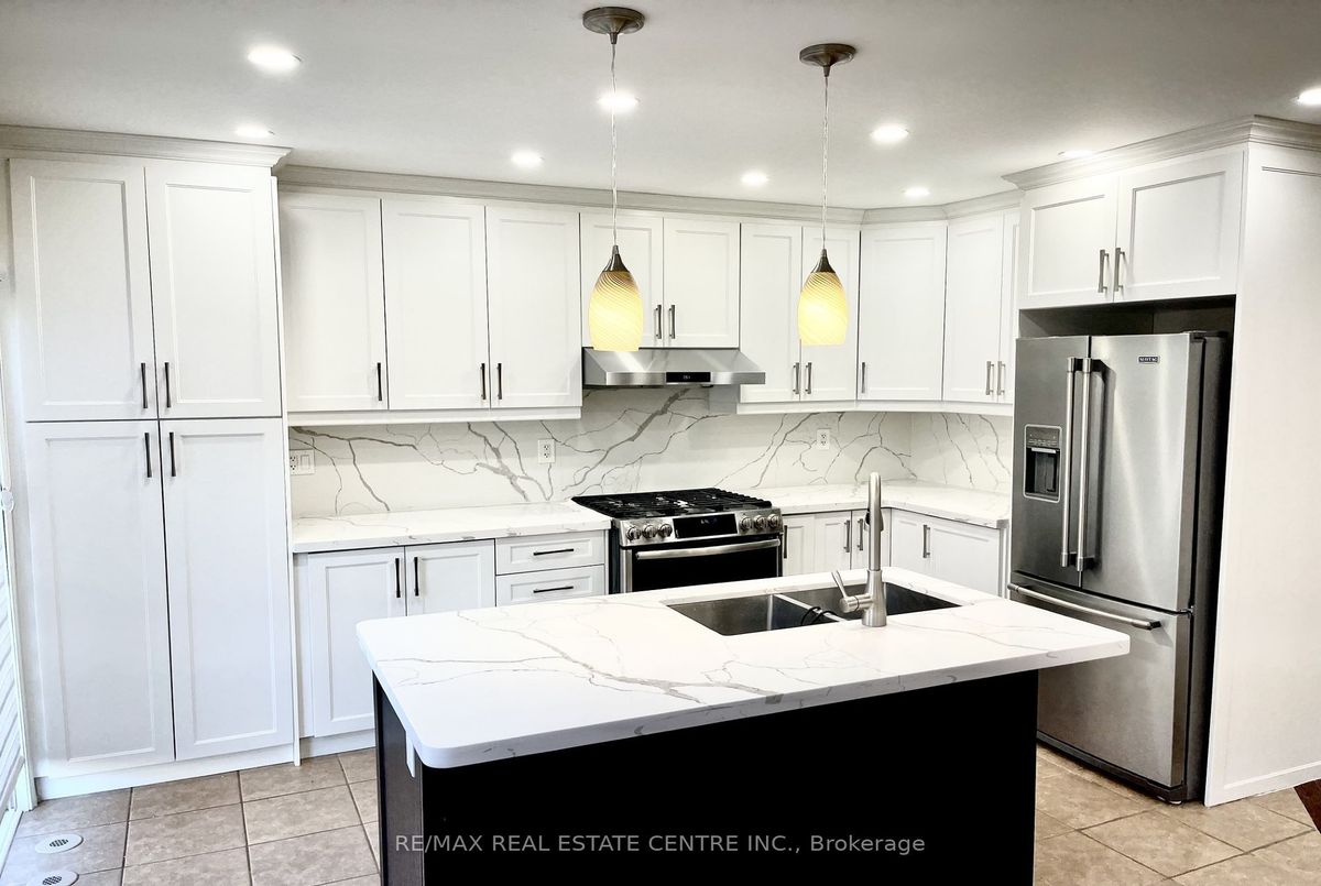 Impeccable newly painted end unit townhome with private drive and great layout. Over 1500sqft of designer living. Main level hardwood floors. Newly built modern gourmet kitchen with quartz counters, backsplash and white cabinets. 2nd level laundry, finished basement with laminate floors, potlights & kitchen. Interlocking stone on side and backyard. Great location; walk to school, parks, No Frills grocery, Rexall pharmacy and walk in clinic.