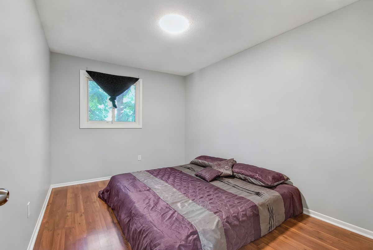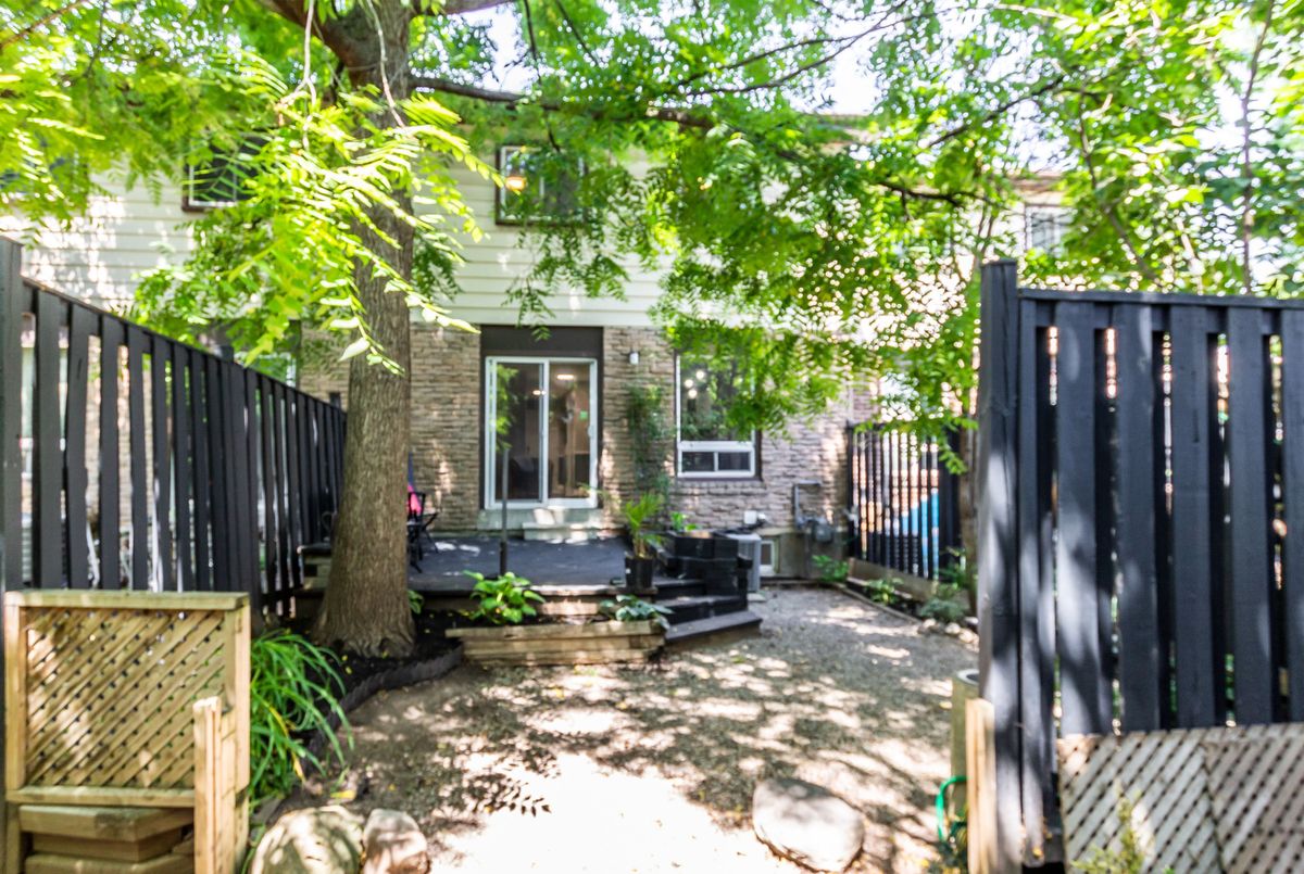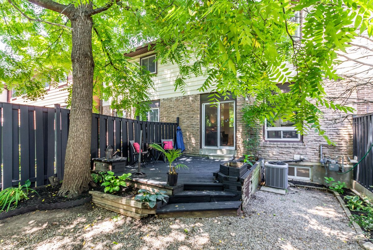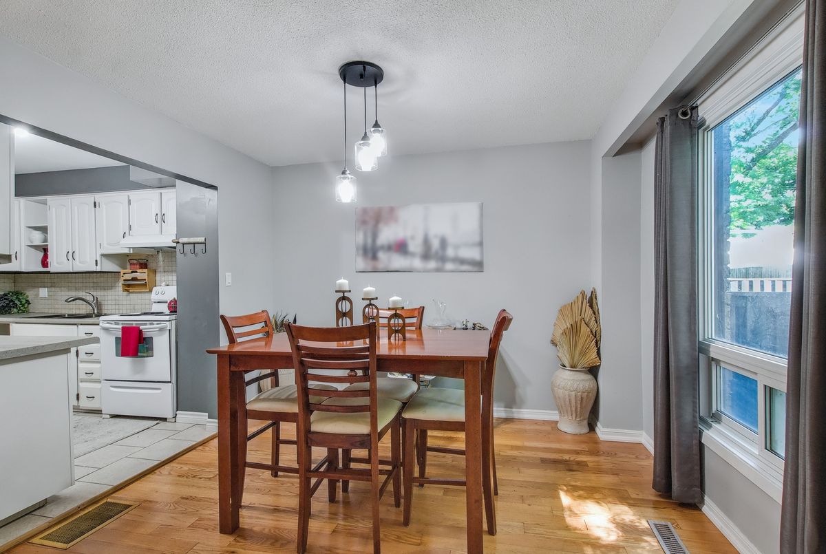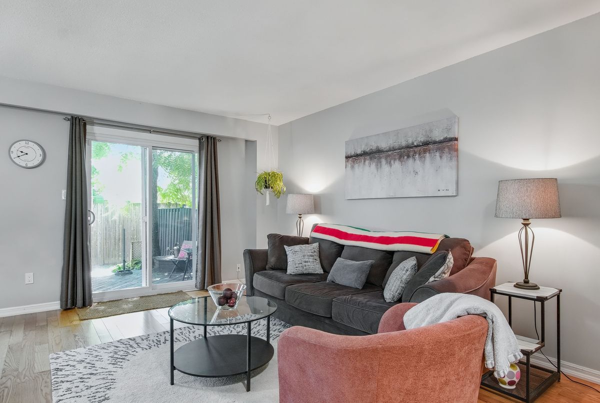 This spacious 4+1 bedroom townhome nestled at the back of a quiet, well-maintained and conveniently located complex with its own park. The bright and open living/dining area features hardwood flooring and sliding patio doors leading to a private deck and patio surrounded by mature trees. The main floor has an updated powder room and convenient direct garage entry. Upstairs, you'll find four generously sized, freshly painted bedrooms with laminate flooring and an updated 4-piece bathroom. The finished basement adds extra living space with a large rec room and a versatile bonus room - perfect for a home office or 5th bedroom. Furnace and central air replaced in 2016. Ample visitor parking available. Condo fees include cable TV, high-speed internet, and water. Roof reshingled by the condo corporation in 2022. Ideally located close to downtown Milton, shopping, the GO station, and with quick access to Highway 401. A rare 4-bedroom home - perfect for first-time buyers or growing families!