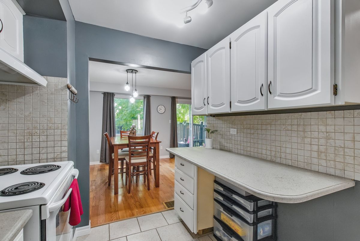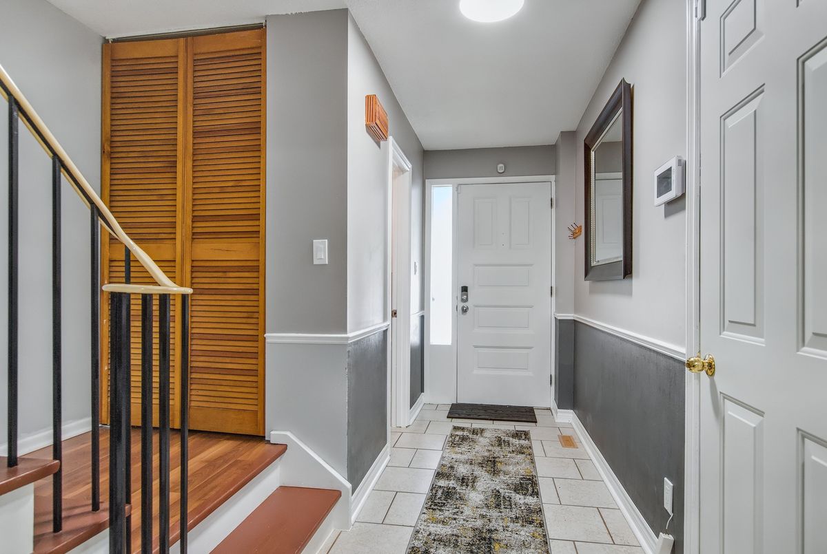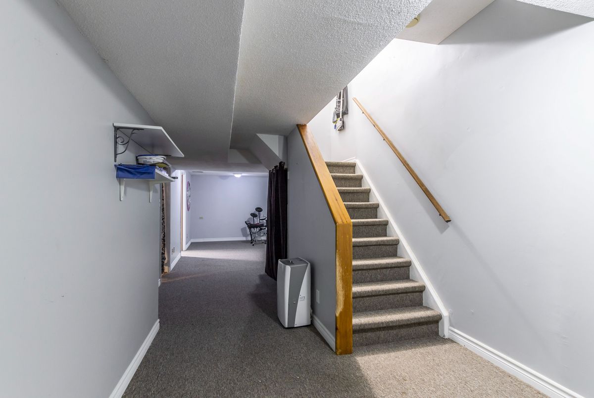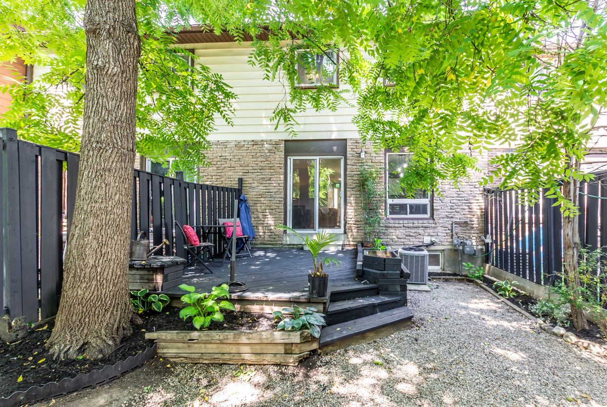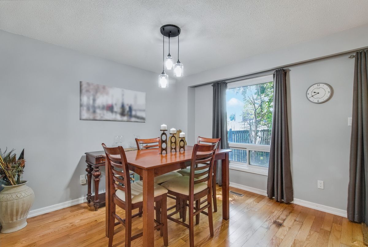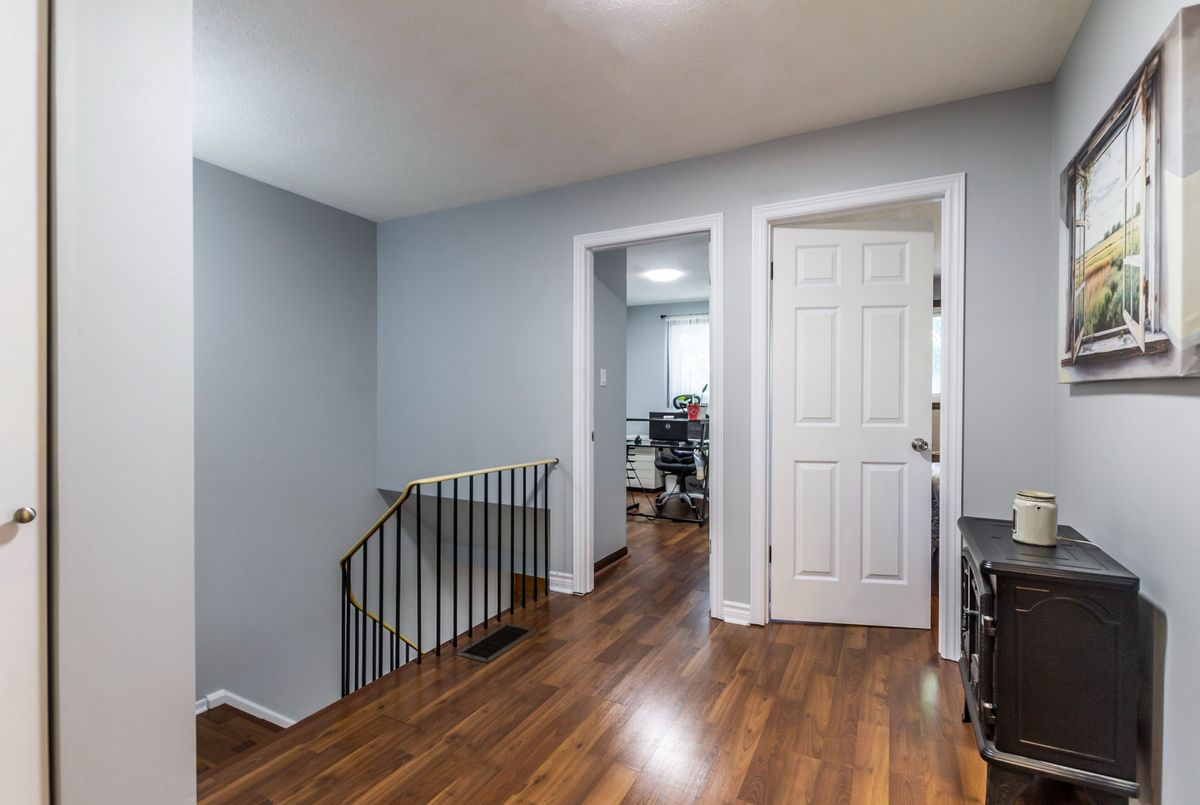 This spacious 4+1 bedroom townhome nestled at the back of a quiet, well-maintained and conveniently located complex with its own park. The bright and open living/dining area features hardwood flooring and sliding patio doors leading to a private deck and patio surrounded by mature trees. The main floor has an updated powder room and convenient direct garage entry. Upstairs, you'll find four generously sized, freshly painted bedrooms with laminate flooring and an updated 4-piece bathroom. The finished basement adds extra living space with a large rec room and a versatile bonus room - perfect for a home office or 5th bedroom. Furnace and central air replaced in 2016. Ample visitor parking available. Condo fees include cable TV, high-speed internet, and water. Roof reshingled by the condo corporation in 2022. Ideally located close to downtown Milton, shopping, the GO station, and with quick access to Highway 401. A rare 4-bedroom home - perfect for first-time buyers or growing families!