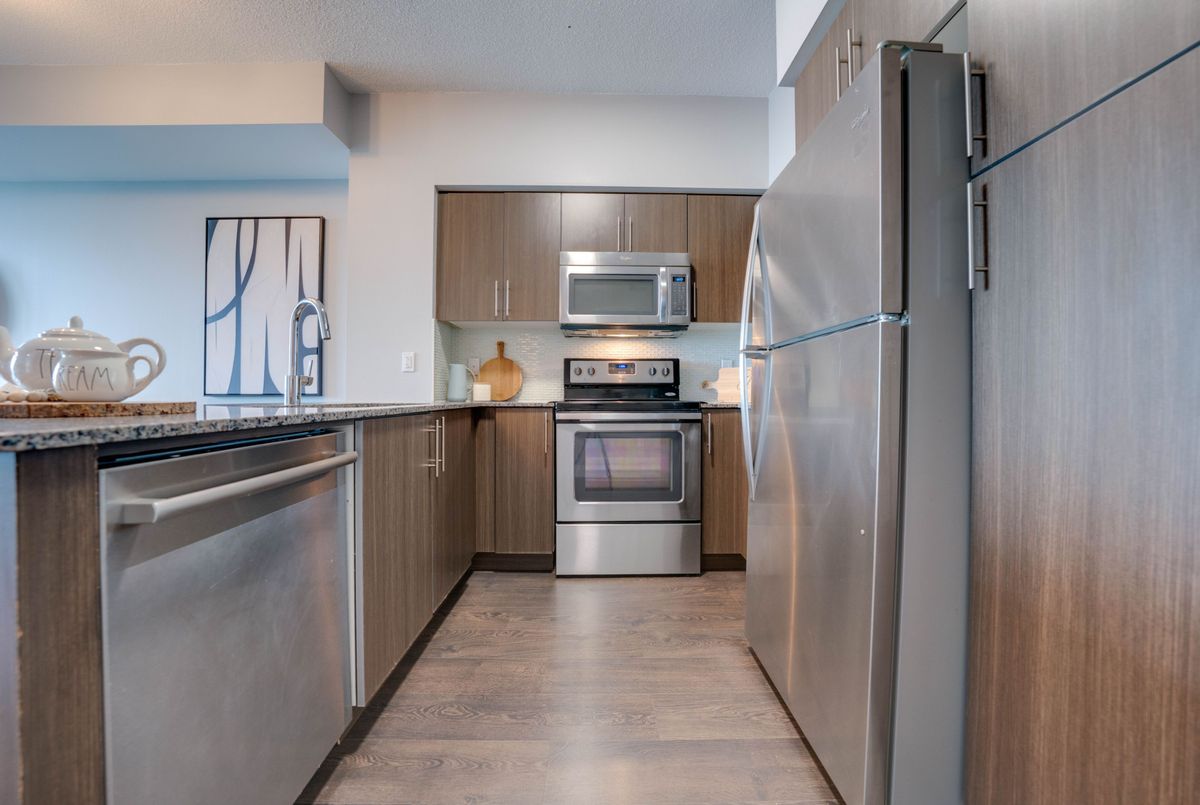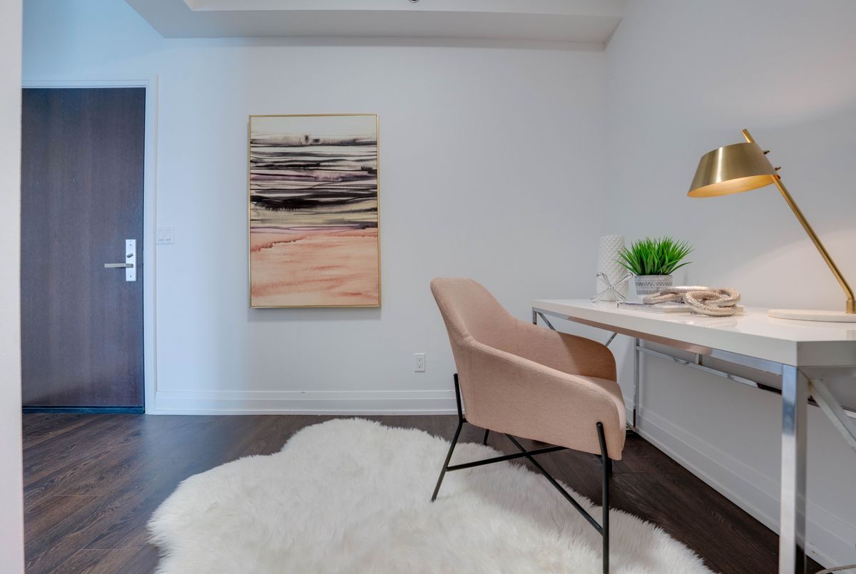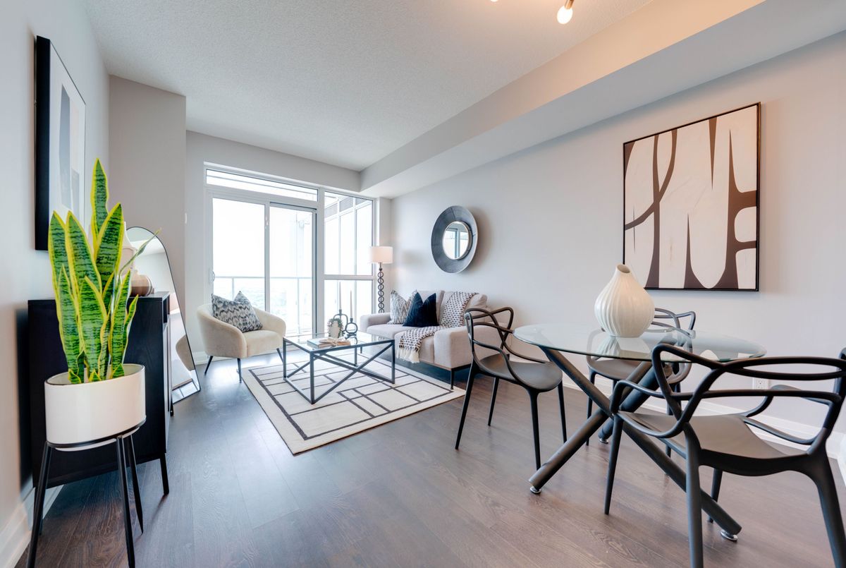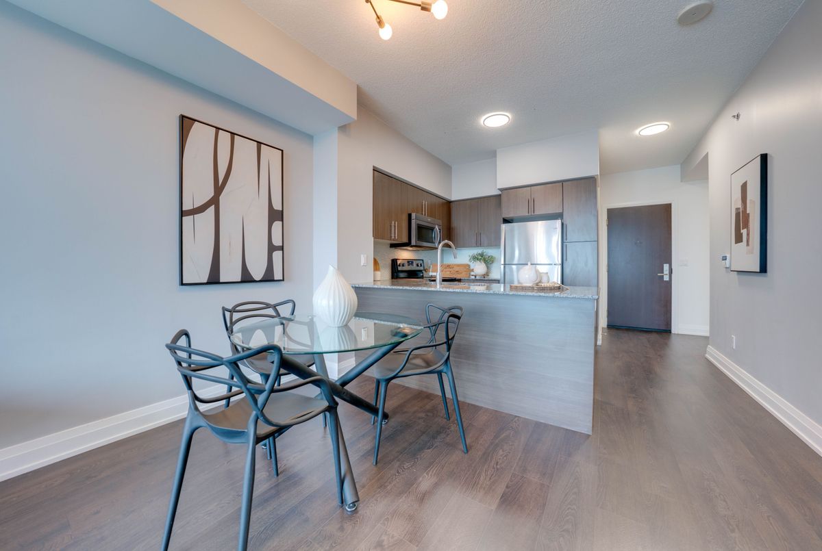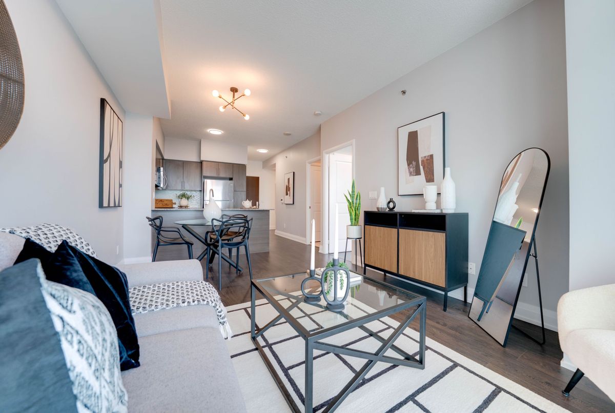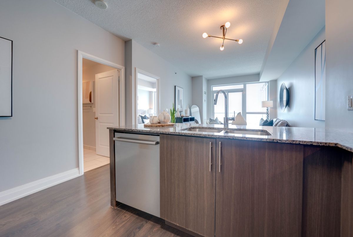 Modern Condo with Sunset Views in the Heart of Kerr Village! Welcome to this stylish, high-floor unit in the sought-after Empire Rain building where modern design meets unbeatable views. Enjoy panoramic sights of Lake Ontario and the Escarpment right from your oversized balcony, perfect for unwinding after a busy day. Inside, the space is open, airy, and full of natural light, thanks to 9-foot ceilings, floor-to-ceiling windows, and hardwood floors throughout. The upgraded kitchen features granite counters, stainless steel appliances, a chic tiled backsplash, and an extended breakfast bar ideal for casual meals or entertaining. The layout flows beautifully with dedicated space for both living and dining. The spacious bedroom includes a walk-in closet and semi-ensuite access, while the separate den offers the perfect work-from-home setup or reading nook. Modern lighting adds a polished, contemporary feel. Live in the heart of Kerr Village, just steps to transit, the GO Station, trendy restaurants, Whole Foods, and scenic trails along Sixteen Mile Creek. You're also minutes to Lake Ontario, the QEW, Sheridan College, and an 8-stall Tesla Supercharger. This is a rare opportunity to own a beautifully maintained unit in one of Oakville's most in-demand buildings. Spotless & Clean!1 Parking,1 Locker.Indoor Pool,Whirlpool W/Cold Plunge,Gym,Dry Sauna,Yoga & Pilates,Party Room,Bbq Stns+Terrace Lounge,Guest Suites,Media/Library Rm,Pet Wash.Dont miss it!