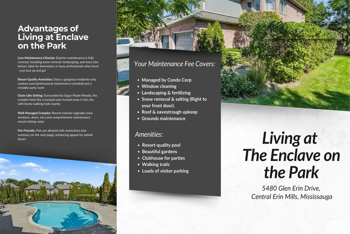 Transformed with over $130,000 in renovations over the last 3 years, this stunning home boasts an open, airy kitchen that features custom cabinets, quartz countertops, a marble backsplash, and new high-end appliances, including a Bosch fridge, a built-in GE Café stovetop, oven, and microwave. Enjoy elegant new flooring throughout, which includes coordinating hardwood & laminate, stunning porcelain, and luxurious Berber broadloom with premium underpadding in the basement, along with matching renovated staircases. The master bathroom and powder room have been updated, there are California shutters throughout, and almost every room has been freshly painted for a bright, elegant look. Experience a truly turnkey lifestyle, as the condo corporation handles all exterior maintenance, including window cleaning, landscaping with fertilizing and grass cutting, snow removal and salting right to your door, roof and eavestrough upkeep, and grounds maintenance. Step into your private back and side yard, an end-unit gem where the entrance faces the sideyard and windows overlook it, creating the illusion of expansive space. The tucked-away back deck feels like a detached home, perfect for summer BBQs (gas) or quiet moments, while the Sugar Maple Woods Trail wraps around the complex, with its trailhead just steps from the entrance. Indulge in luxurious, tucked-away complex amenities, such as a resort-quality pool / crystal-clear water, beautiful gardens, and a clubhouse ideal for private parties, all impeccably maintained, & enhanced by loads of visitor parking. This pet-friendly community is ideal for downsizers, professionals, or families. Located just a quick walk from the sought-after John Fraser Secondary School, ranked 20th provincially with a 9.0 out of 10 score, Longos Glen Erin, Erin Mills Town Centre, public transit, pharmacies, restaurants, parks, Erin Meadows Community Centre & Library. A quick drive to highways 410, 407, and 403, Credit Valley Hospital and ALL amenities.