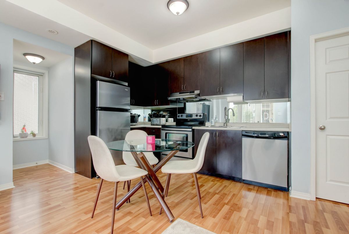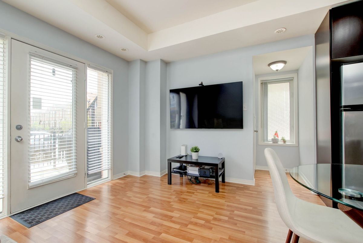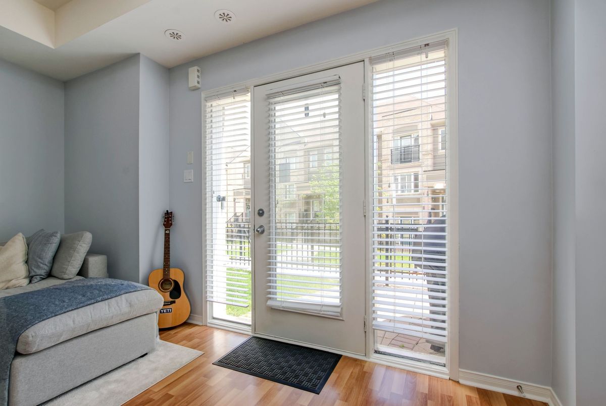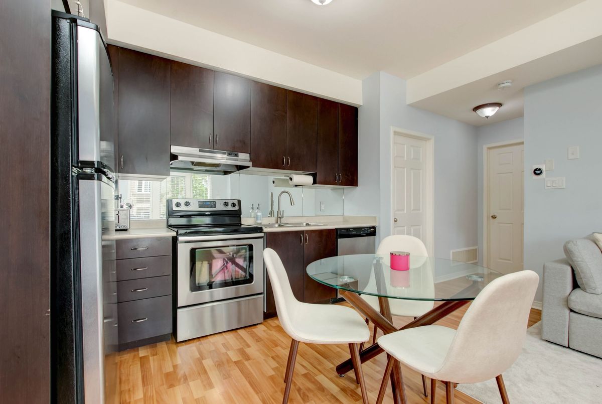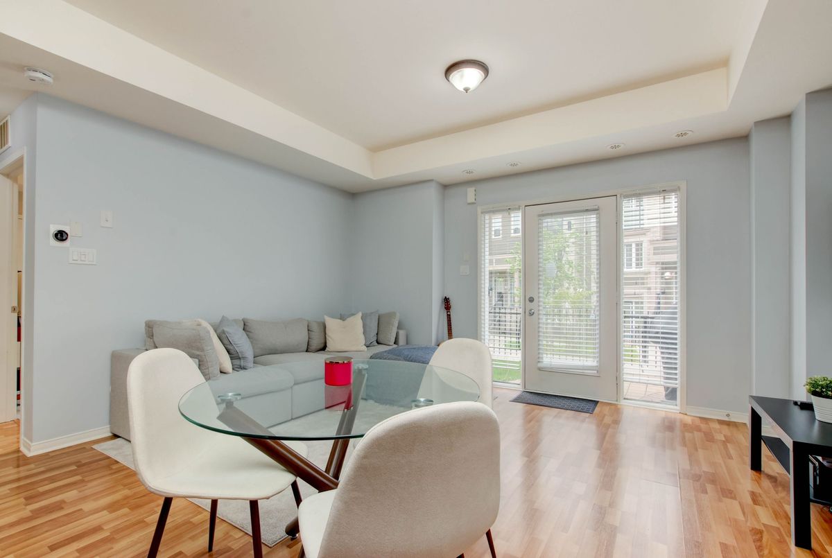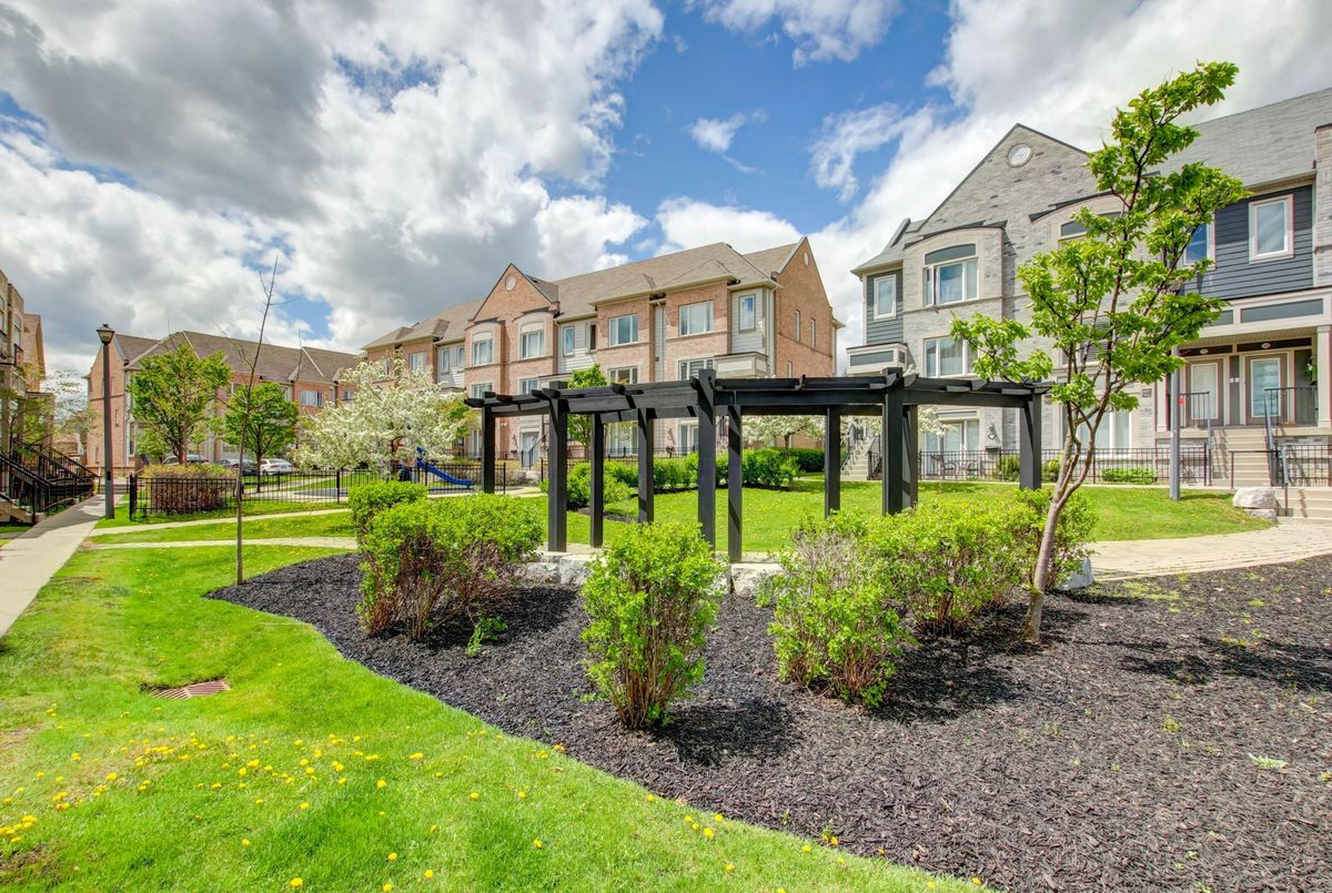 Welcome to this lovely 1-bedroom end-unit, stacked condo townhome in a nicely maintained community. Convenient (and rare) 2-car parking right outside your unit including your own personal garage space with lots of extra room for storage, plus your own private front terrace overlooking the park. No waiting for elevators or hauling groceries up to your unit, just walk out of your door, get into your car and go. Freshly painted, clean and well-kept, this South facing unit is filled with of natural light. Walk into a lovely open-concept living space with a kitchen and eat-in area that overlooks the living room. A nice size primary bedroom with new laminate floors, a bright window overlooking the park, and an oversized closet. Ensuite laundry with full size machines (not little condo machines), plenty of storage inside the unit and direct access to the garage with plenty of extra storage space. The generous outdoor terrace is a perfect space to entertain and relax. An excellent location for commuters, conveniently located between Highways 401, 407, 403 and QEW. A short walk to nearby restaurants, shopping, Erin Mills Town Centre, schools and parks. Just minutes to the Churchill Meadows Community Centre with sports facilities, playgrounds, trails, indoor pool and dog park.