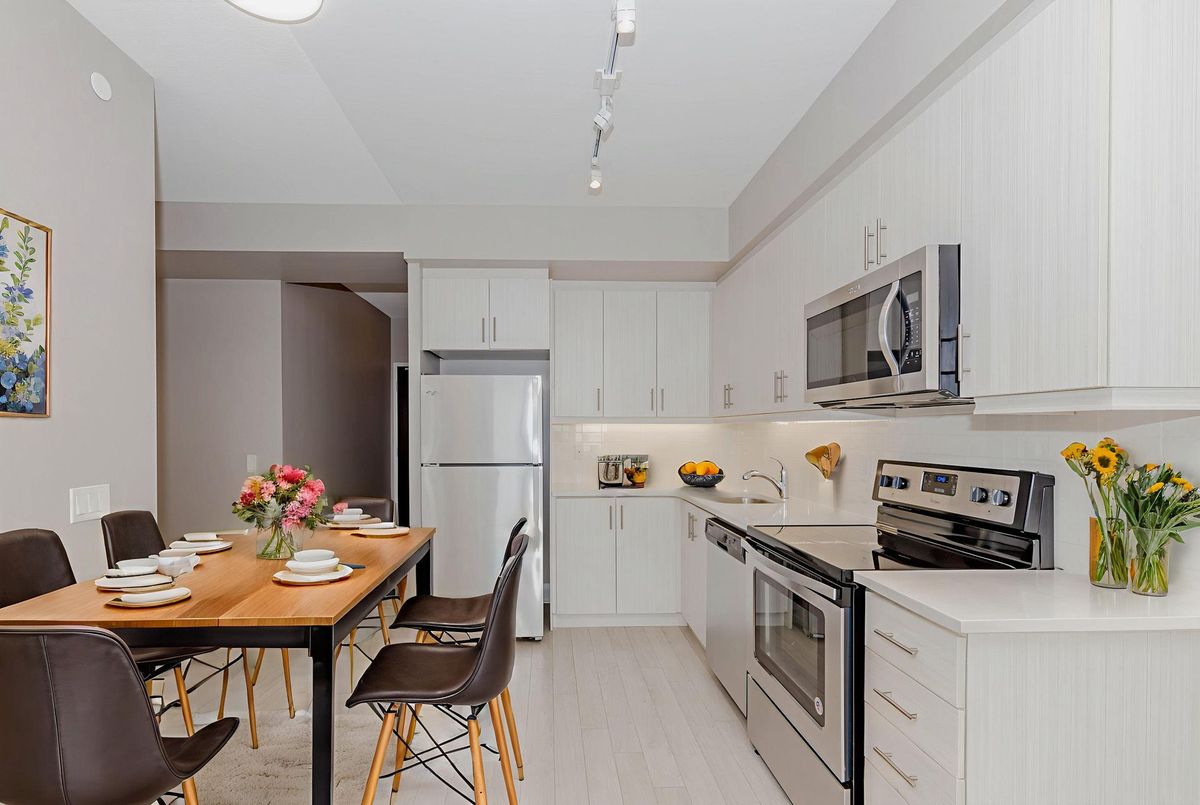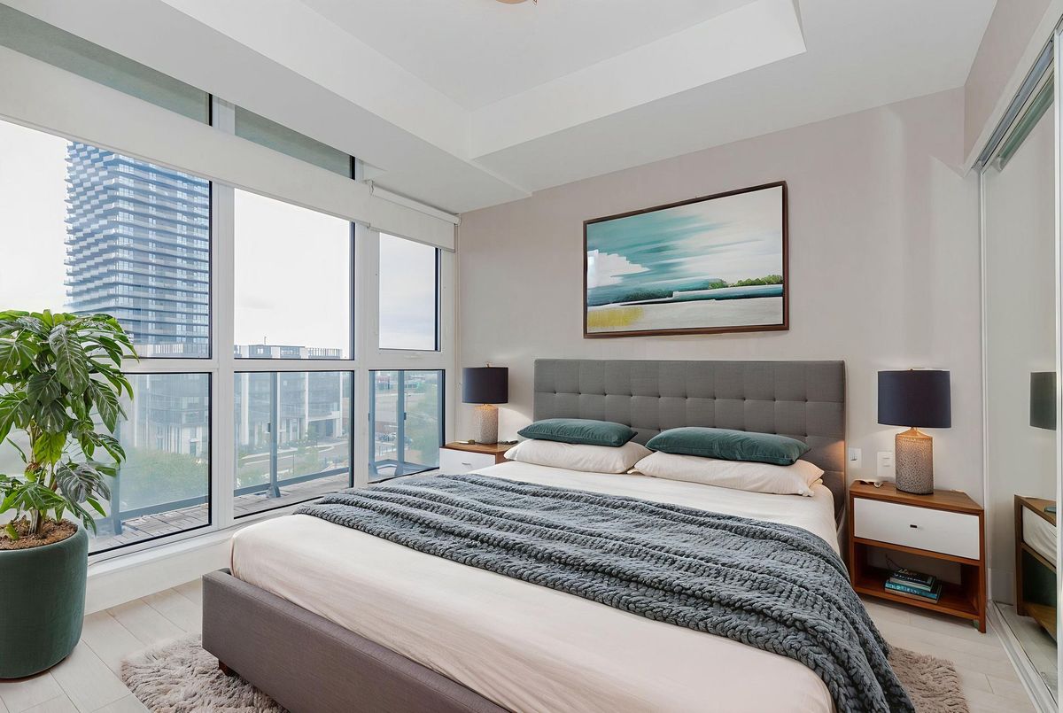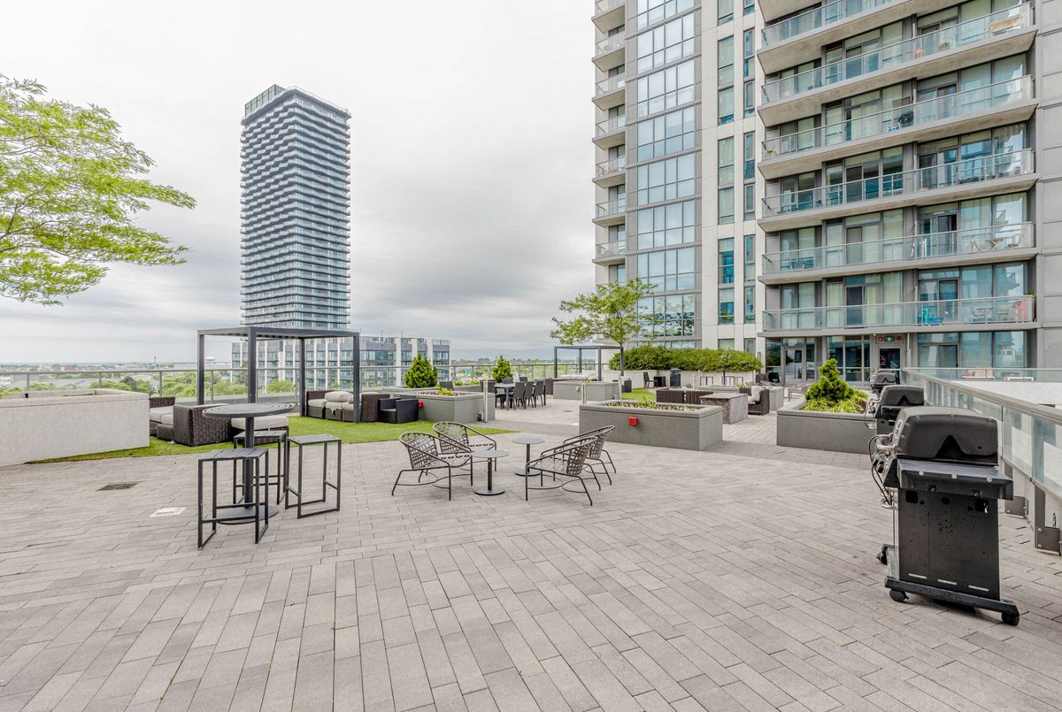 Meticulously Maintained And Freshly Painted 1+Den South-Facing Suite With Park Views In The Heart Of Etobicoke. This Bright Contemporary Condo Features 9-Ft Ceilings, Trendy Laminate Floors Throughout And Floor-To-Ceiling Windows That Fill The Space With Natural Light. The Open-Concept Living And Dining Area Leads To A Large South-Facing Balcony With Serene Park Views, Perfect For Relaxing Or Entertaining. The Stunning, Functional Kitchen Boasts Modern Cabinets With Under-Cabinet Lighting, Stainless Steel Appliances, And A Clean, Modern Design. Enjoy A Super Clean, Modern Bathroom With A Stylish Floating Vanity. The Versatile, Spacious Den Easily Serves As A Second Bedroom, Dedicated Home Office, Or Dining Space. The Sun-Filled Primary Bedroom Boasts A Double-Sized Closet, With Roller Shades Installed Throughout For Style And Privacy. Includes 1 Parking Space And 1 Locker. Enjoy Exceptional Building Amenities Including 24-Hour Concierge And Security, Fully Equipped Gym, Indoor Pool, Hot Tub, Sauna, Steam Room, Games Room, Lounge, Party/Meeting Rooms, Outdoor Terrace With BBQs, Rooftop Patio, And Visitor Parking. Prime Location Steps To Parks, With Easy Access To Bloor Subway, TTC, GO Train, Highways, Pearson Airport, Great Schools, Shops, Restaurants, Theatres, And Sherway Gardens Mall.