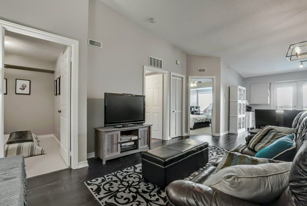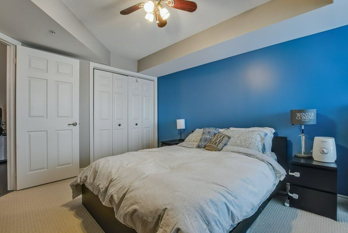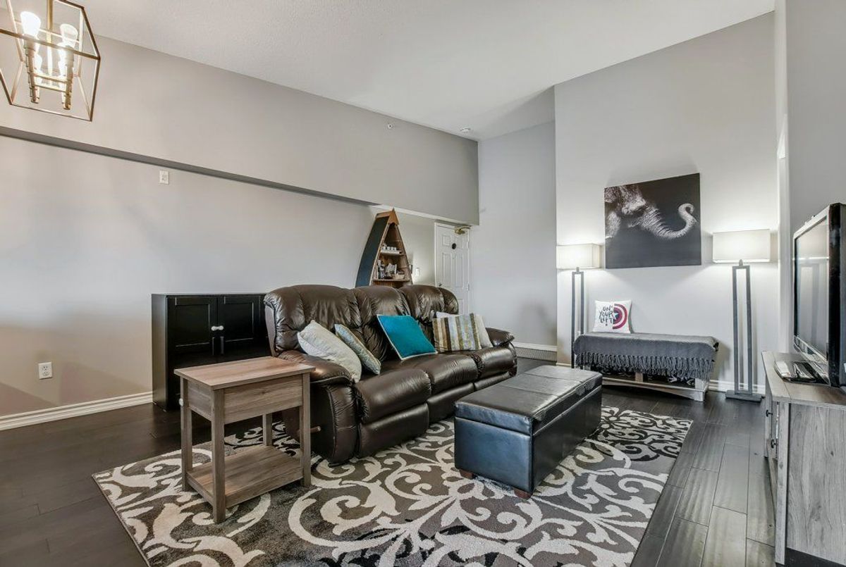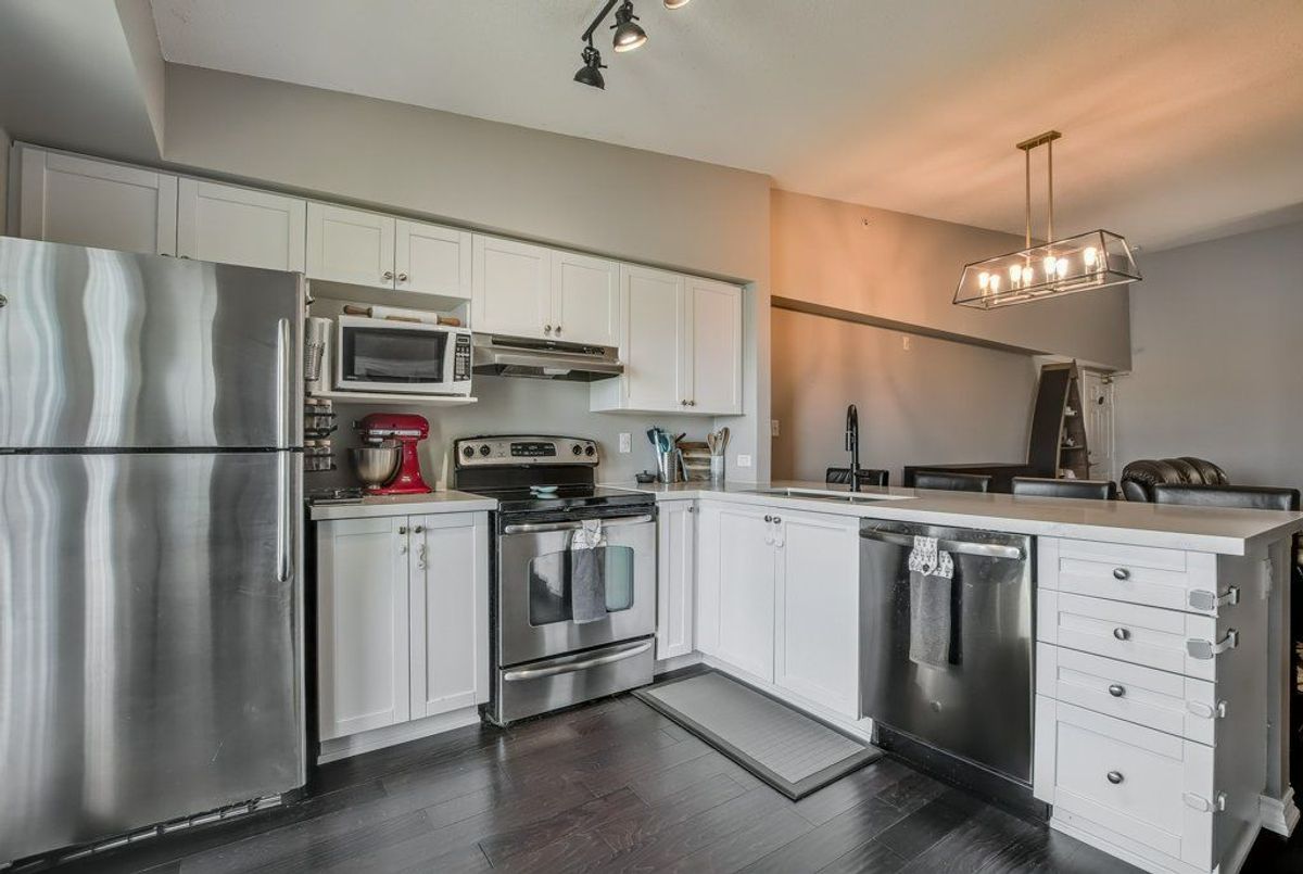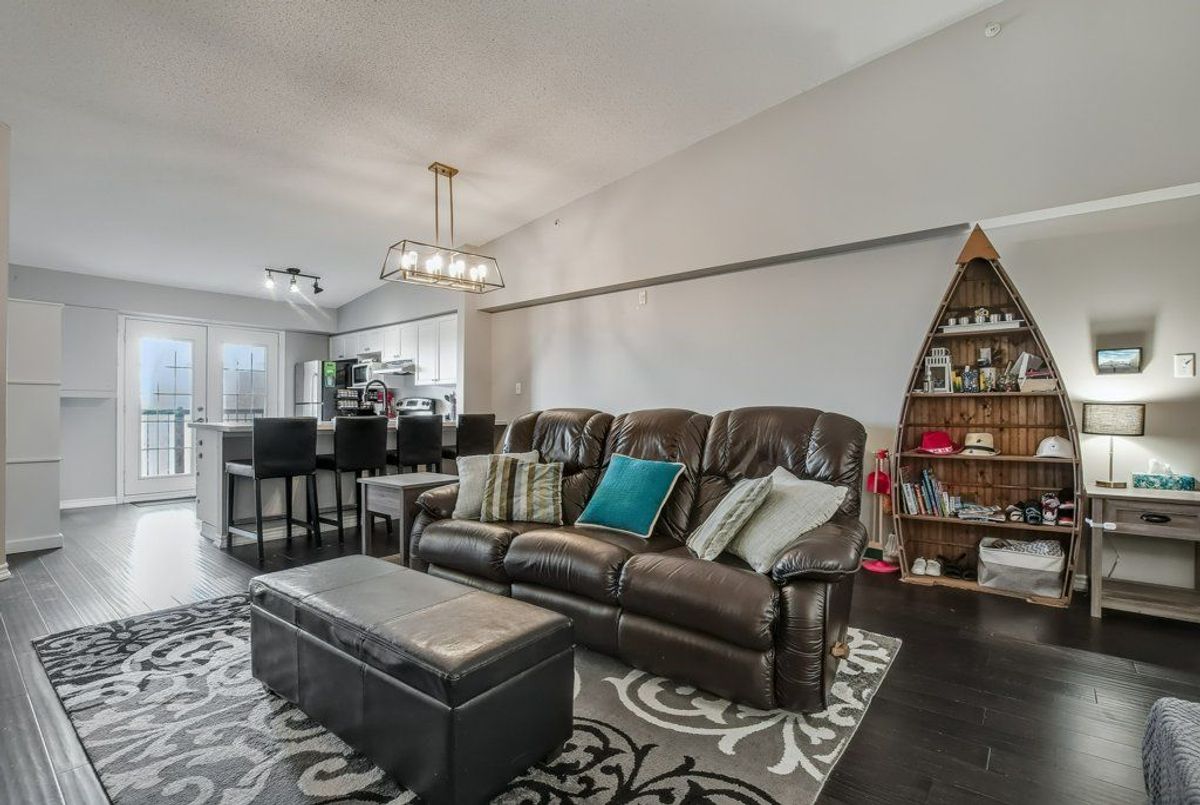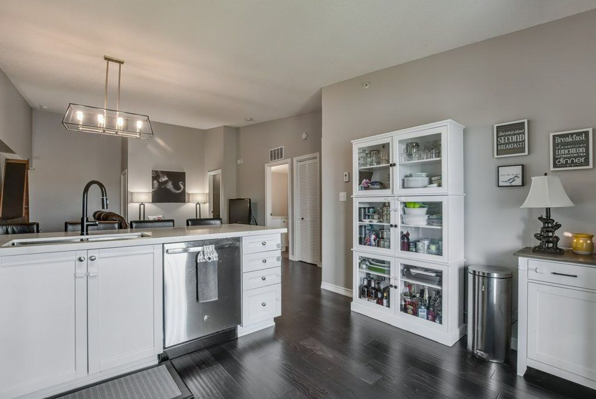 Beautiful, bright 1 bedroom + den unit boasting 893 square feet on the top floor in a highly desired complex. The gorgeous renovated kitchen boasts of upgraded counter top with expansive breakfast bar attractive sink and faucet, lighting and stainless steel appliances overlooking the spacious living room accented by the rich, hand-scraped hardwood floors. Double French doors provide convenient access to the balcony. Two spacious bedrooms and inviting four piece bathroom. Very comfortable living with laundry ensuite. One underground parking space plus available surface parking plus a storage locker. Stunning party room available with a bright, well equipped gym. Lots of visitor parking available. Highly preferred location with quick access to highways, shopping and close to schools. Don't miss out.