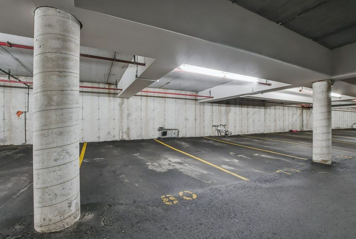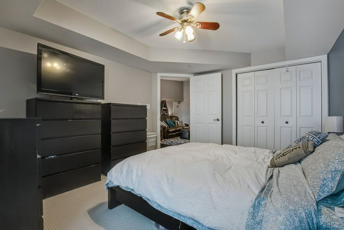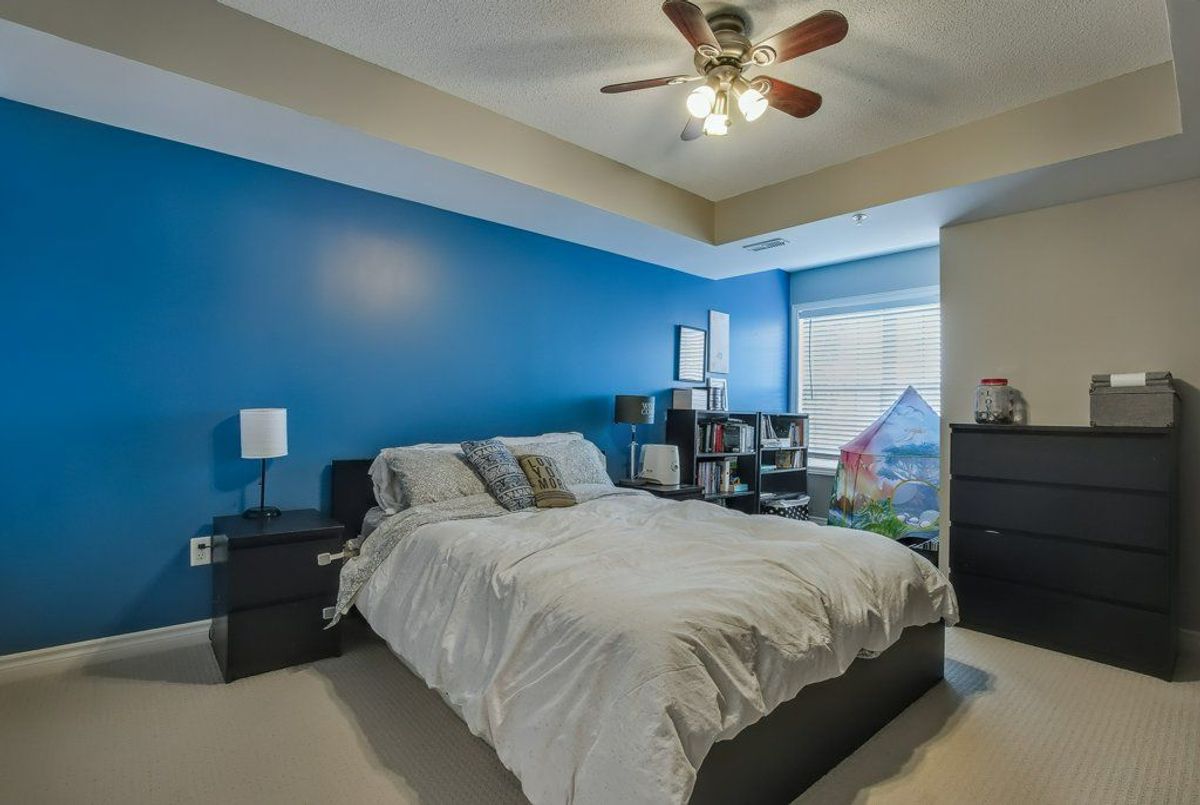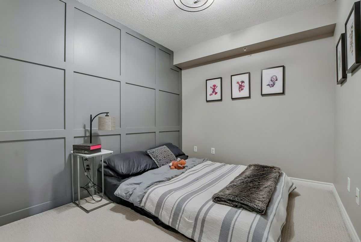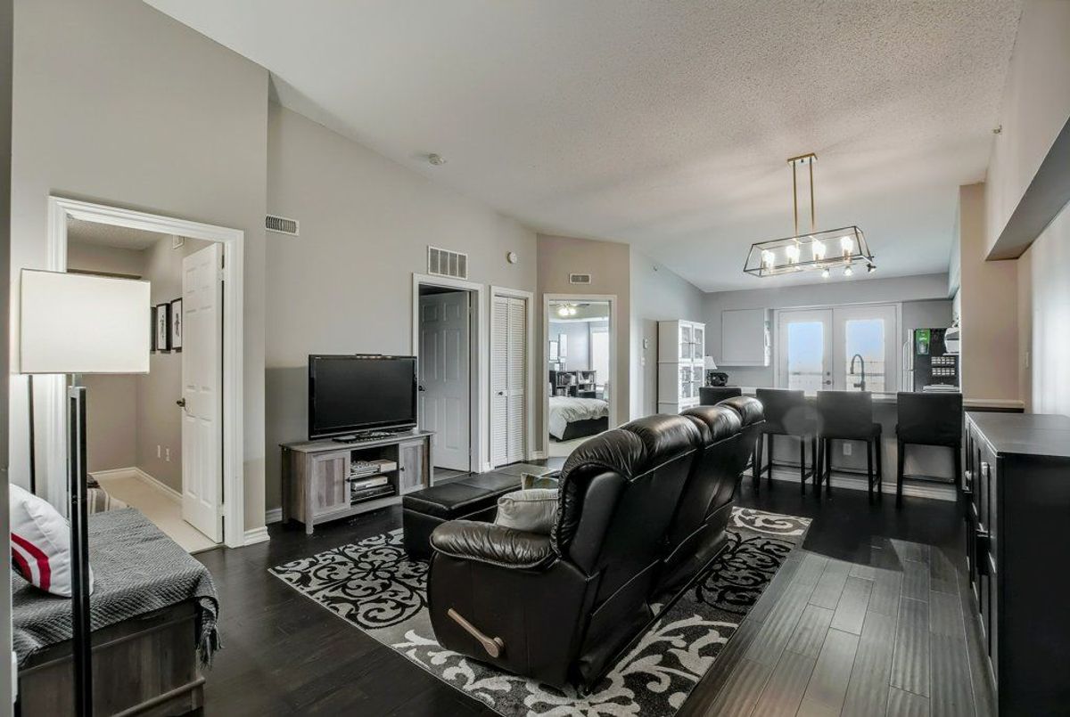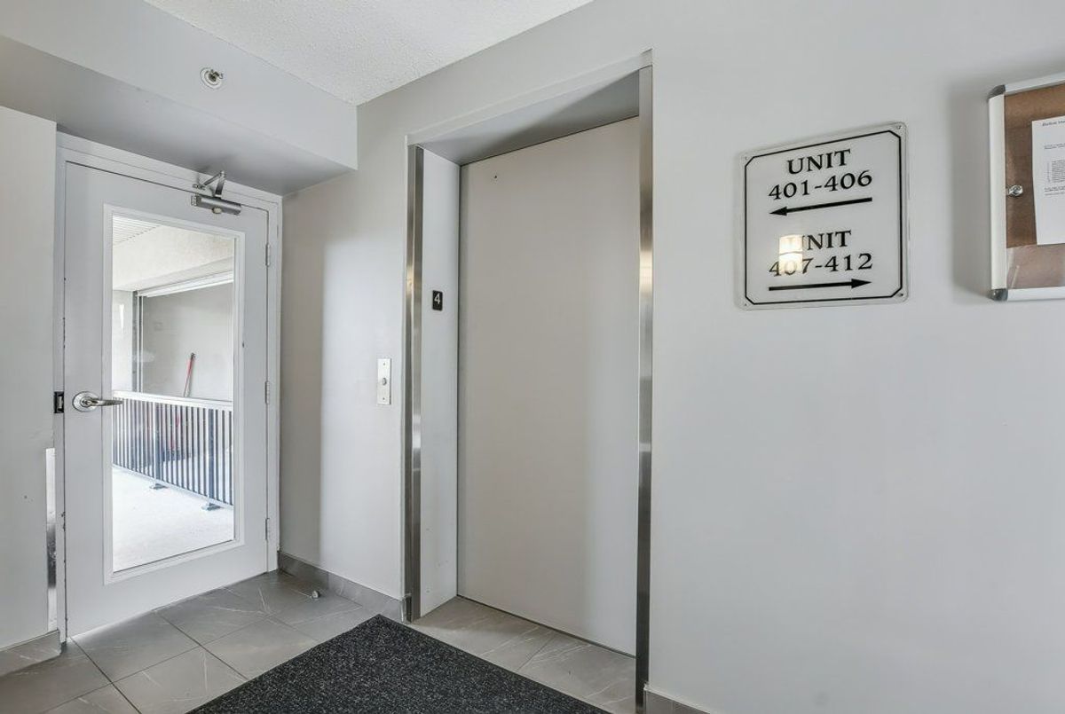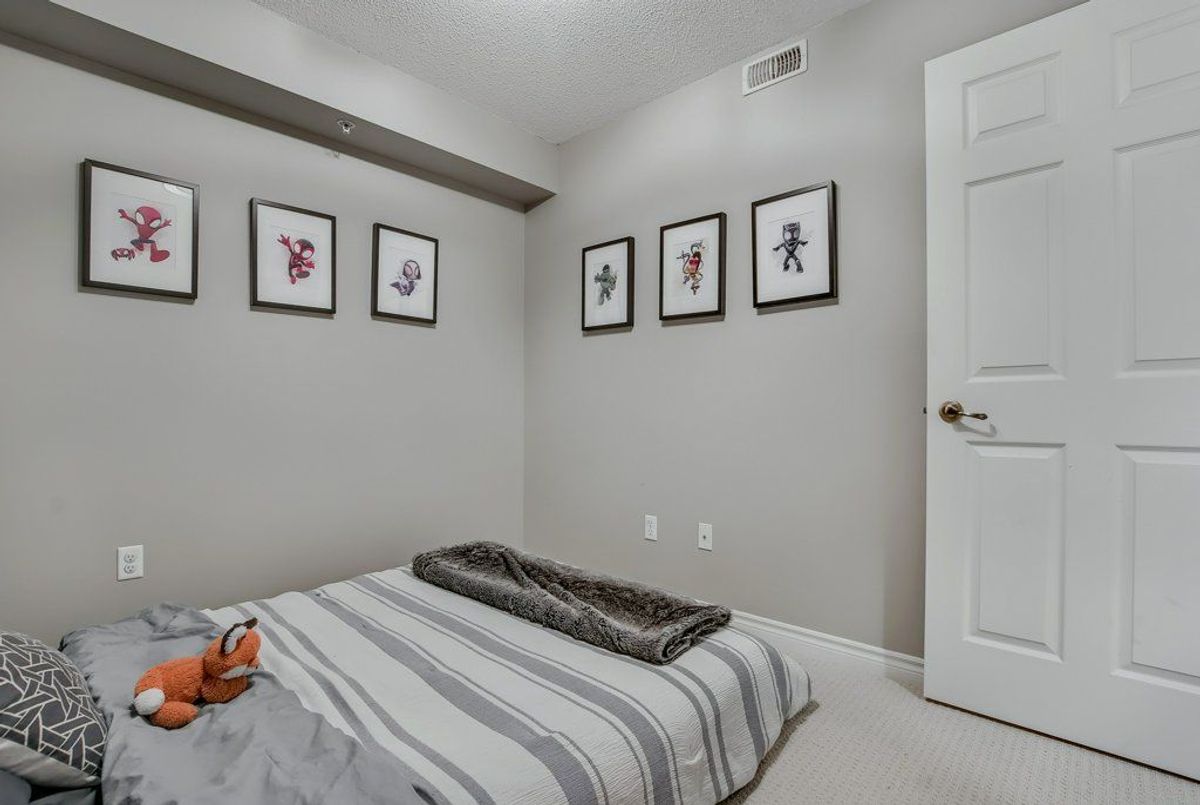 Beautiful, bright 1 bedroom + den unit boasting 893 square feet on the top floor in a highly desired complex. The gorgeous renovated kitchen boasts of upgraded counter top with expansive breakfast bar attractive sink and faucet, lighting and stainless steel appliances overlooking the spacious living room accented by the rich, hand-scraped hardwood floors. Double French doors provide convenient access to the balcony. Two spacious bedrooms and inviting four piece bathroom. Very comfortable living with laundry ensuite. One underground parking space plus available surface parking plus a storage locker. Stunning party room available with a bright, well equipped gym. Lots of visitor parking available. Highly preferred location with quick access to highways, shopping and close to schools. Don't miss out.