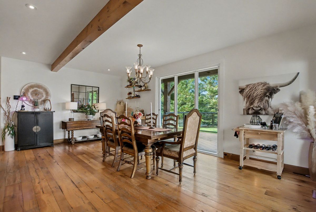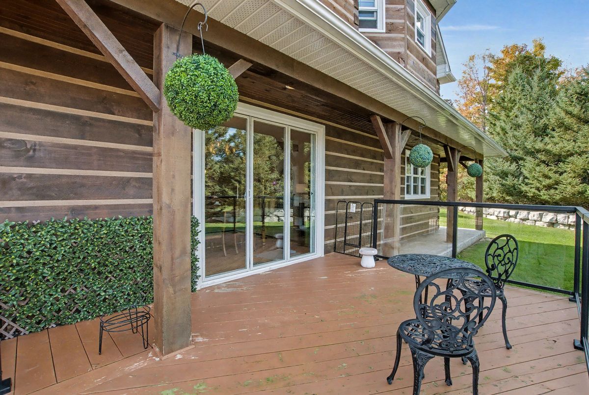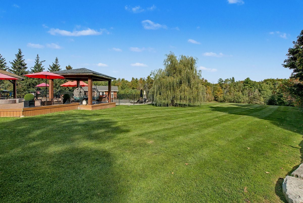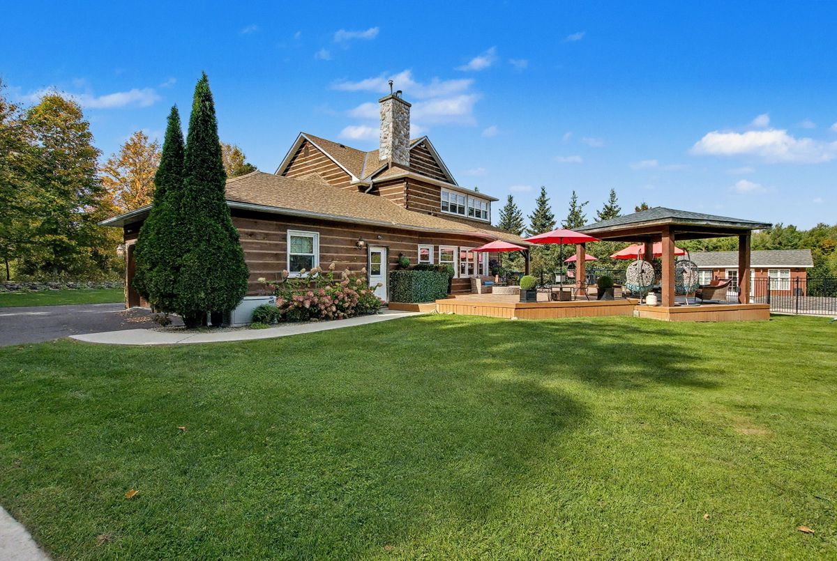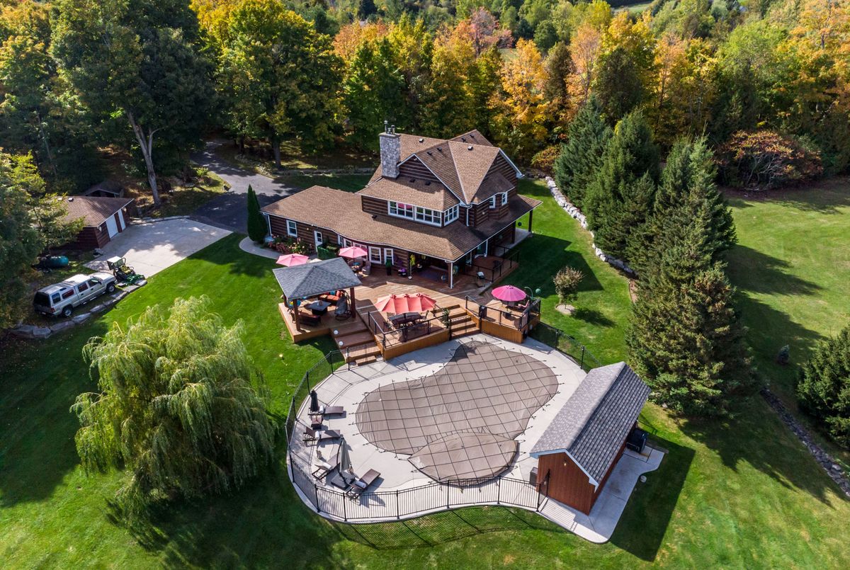 Nested away in a very secluded and quiet rural estate subdivision of just 20 homes. Barely visible from the road , the long paved drive winds through the trees to the open professionally landscaped gardens and home site. This Unique character wood sided home has the appearance of Log Home . Custom designed with large open rooms ideal to take advantage of the beautiful views from all windows.Features Central Custom Kitchen with Stainless Steel Appliances and Granite Counters with Breakfast Bar overlooks the Dining Rm with Magic Window walkout to decks , spacious Living Room with Floor to Ceiling Fireplace and Multiple Windows, Primary Bedroom with floor to ceiling Fireplace and gorgeous Ensuite and Views over Meadow, Builtins galore,Basement mostly finished just waiting for your choice of flooring, Covered Porches , Decks ,Cabana, in-ground free form 20 x 40 Heated Saltwater Pool , Pool house , Attached 2 car and separate single car garage, invisible fencing, 12 + acre lot with approx. 6 acres open .A very private character home that is secluded but not isolated.Located just 15 Minutes north of the HWY 401 and 25 . Cogeco Internet Available .All measurements and floor plans , Virtual tours are from interactive I-Guide Attached. **Pool liner has a tear close to coping, photo to follow.**