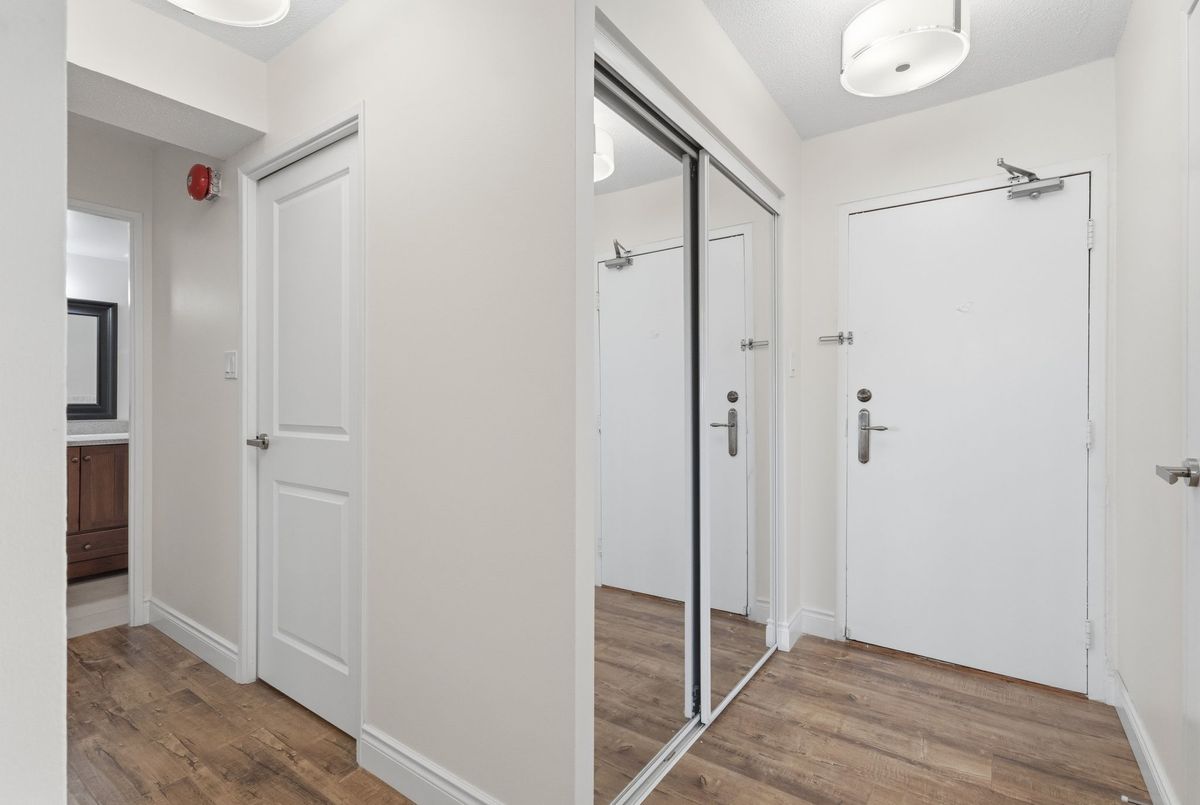 Beautifully maintained one-bedroom suite in central Burlington's Empress Condominium. This bright and spacious unit is ideally located in the heart of Burlington, just a short walk to the Burlington Centre, with easy access to shopping, dining, and many amenities. The L-shaped living room leads to a large private balcony - perfect for enjoying spectacular sunsets. The dining area is conveniently positioned off the eat-in kitchen, which features stainless steel appliances, granite countertops, and white shaker-style cabinetry. The generous bedroom includes a large double closet with mirrored doors. Updated four-piece bathroom. Convenient in-suite locker and laundry room with full-sized washer and dryer. This carpet-free suite has been freshly painted and is move-in ready. Includes one underground parking space. Residents enjoy 24-hour concierge service and an impressive range of amenities, including an outdoor pool, party room, library, fitness room, car wash bay, and ample visitor parking. Enjoy comfort, security and convenience in this well-managed condominium building.