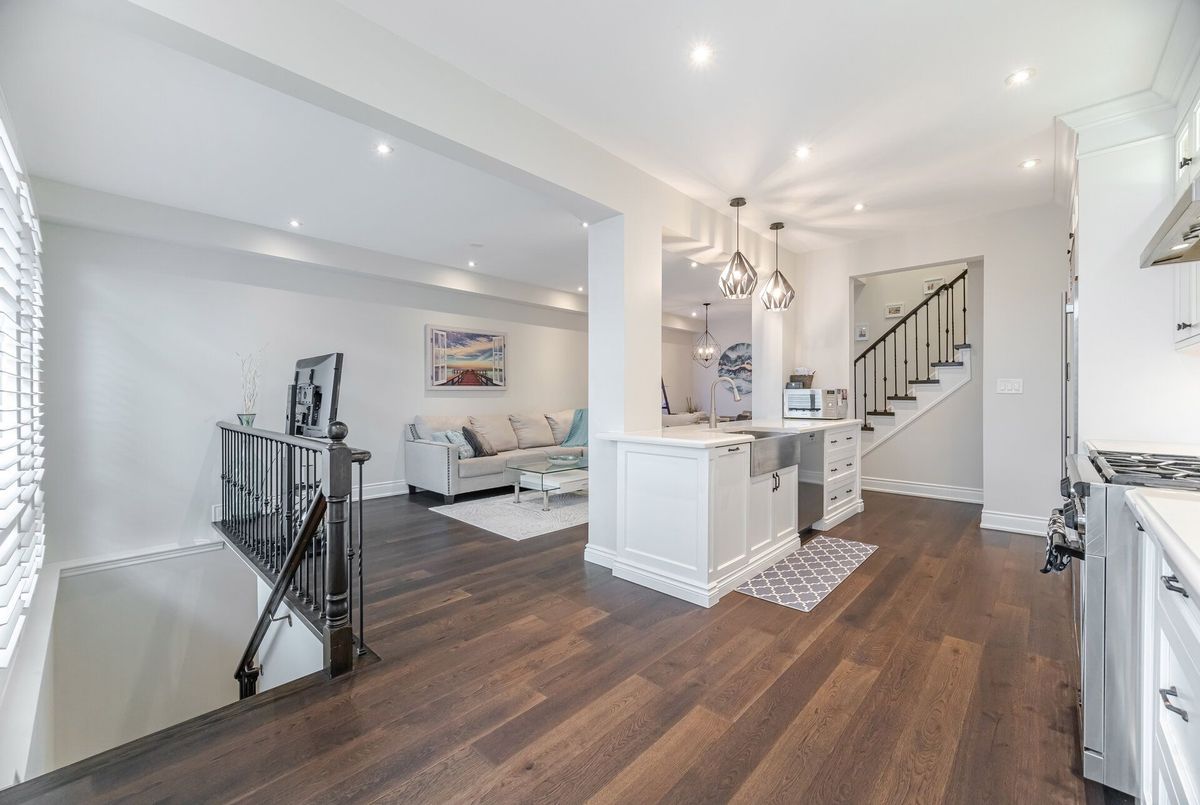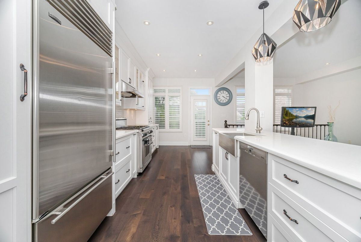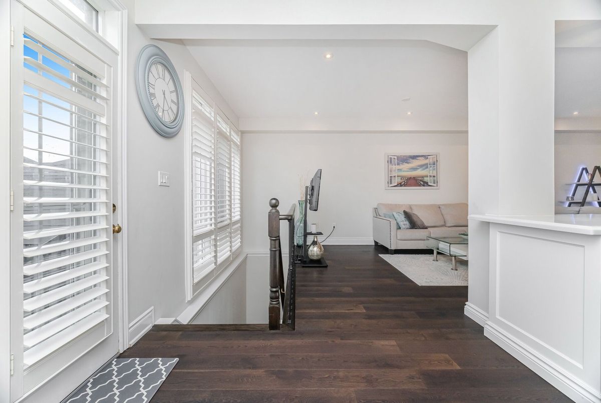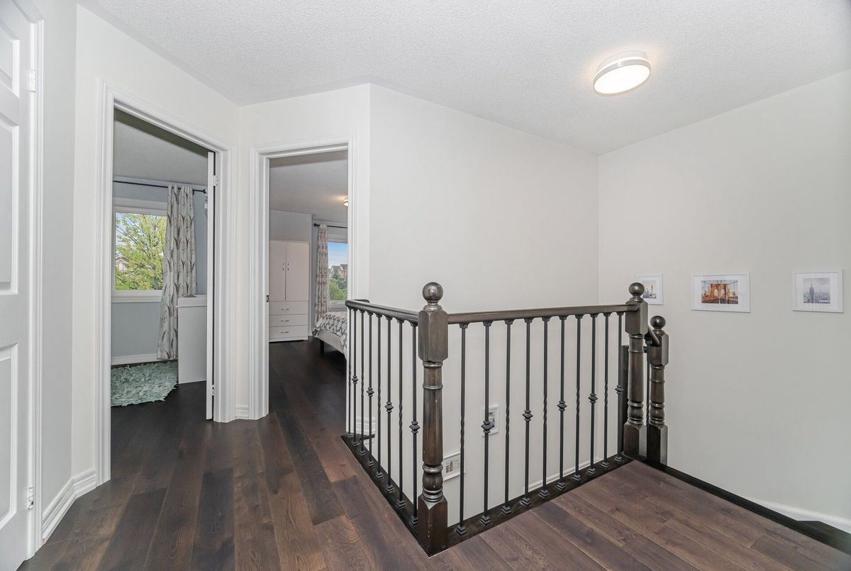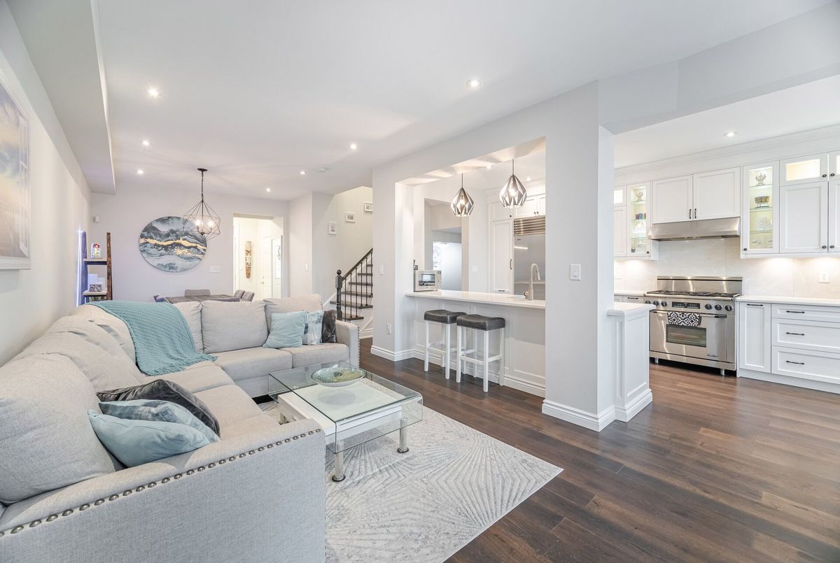 One-of-a-kind designer showpiece in prestigious Bronte Creek! This exceptional executive townhouse redefines luxury living, thoughtfully renovated from top to bottom with high-end, custom finishes that set it apart from the rest. A bright and welcoming foyer with direct garage access offers a stylish and functional entryway, setting the tone for the elegant interior. Enjoy carpet-free living with engineered hardwood flooring throughout the main and second floors as well as the 9ft high ceilings, paired with an open-concept layout that's perfect for both everyday living and entertaining. The chef-inspired kitchen features Caesarstone quartz countertops, solid wood cabinetry, and high-end stainless steel appliances all designed with a sharp eye for quality and style. Upstairs, the solid wood staircase leads to a serene primary suite complete with a walk-in closet and a spa-like ensuite boasting a standalone tub, frameless glass shower, Hansgrohe shower head, and Toto toilet. All bathrooms throughout the home have been tastefully updated to maintain a cohesive, upscale look. Two additional sun-filled spacious bedrooms offer comfort and versatility, convenient 2nd floor laundry room, while the fully finished basement expands your living space with a fourth bedroom, a modern full bathroom, a cozy rec room, plenty of storage space and a dedicated office nook ideal for working from home. Step outside to your own private, professionally landscaped backyard oasis perfect for entertaining or unwinding at the end of the day. Extended driveway fits 2 vehicles. Located in the highly sought-after Bronte Creek community, this rare gem is surrounded by nature, scenic trails, top-rated schools, and every amenity you need.