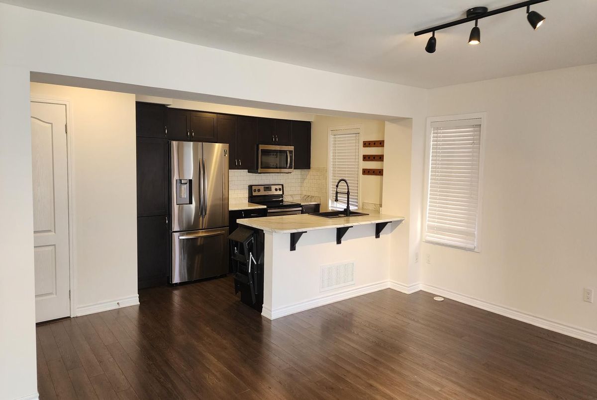 Beautiful, Mattamy-built, 2 bedroom, 3 storey townhouse w/ 3 car parking in heart of quiet, family-friendly pocket of Milton's popular Clarke district that's close to amenities such as plazas, Super Centre, banks, restaurants, boutique Shops, Milton Mall, schools, rec. & arts centres, Milton GO, pub. transit, trails, community parks, mins. to historic Milton Downtown core, Conestoga College, Milton Sports Centre, Milton District Hospital and the list truly goes on and on. The townhome itself boasts a recently update galley-style kitchen w/ pull up breakfast bar, chestnut stained extended kitchen cabinets, quartz countertops, backsplash, newer SS appliances, laminate throughout (carpet-free), a large family room that walks out to sizeable balcony, combined w/ large dining that includes b/i bench and bay window, 2 large bedrooms that includes a large primary room w/ b/i walk-in closet & 3 pc ensuite bath. The home also features a main floor den, extended garage w/ opener & remote + 3 total car parking. There's no grass to cut and this gem of a find rather turn-key w/ very accessible and hands on Landlord. This unit simply won't last at this price and is available immediately. Reserve your private showing today before it's simply too late.