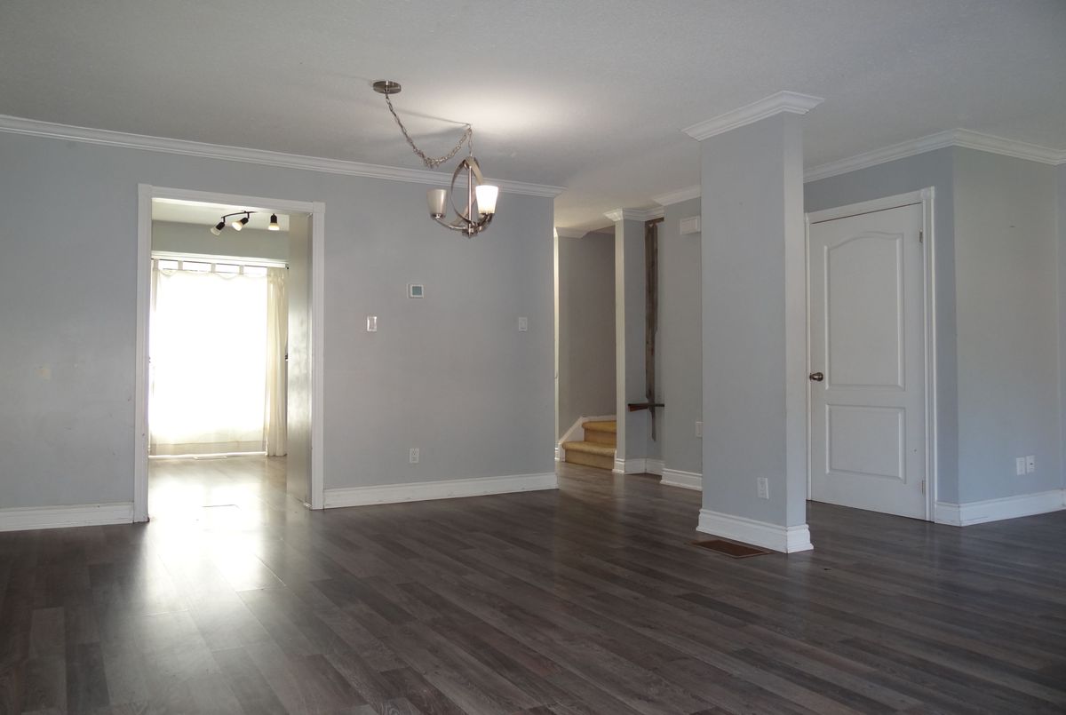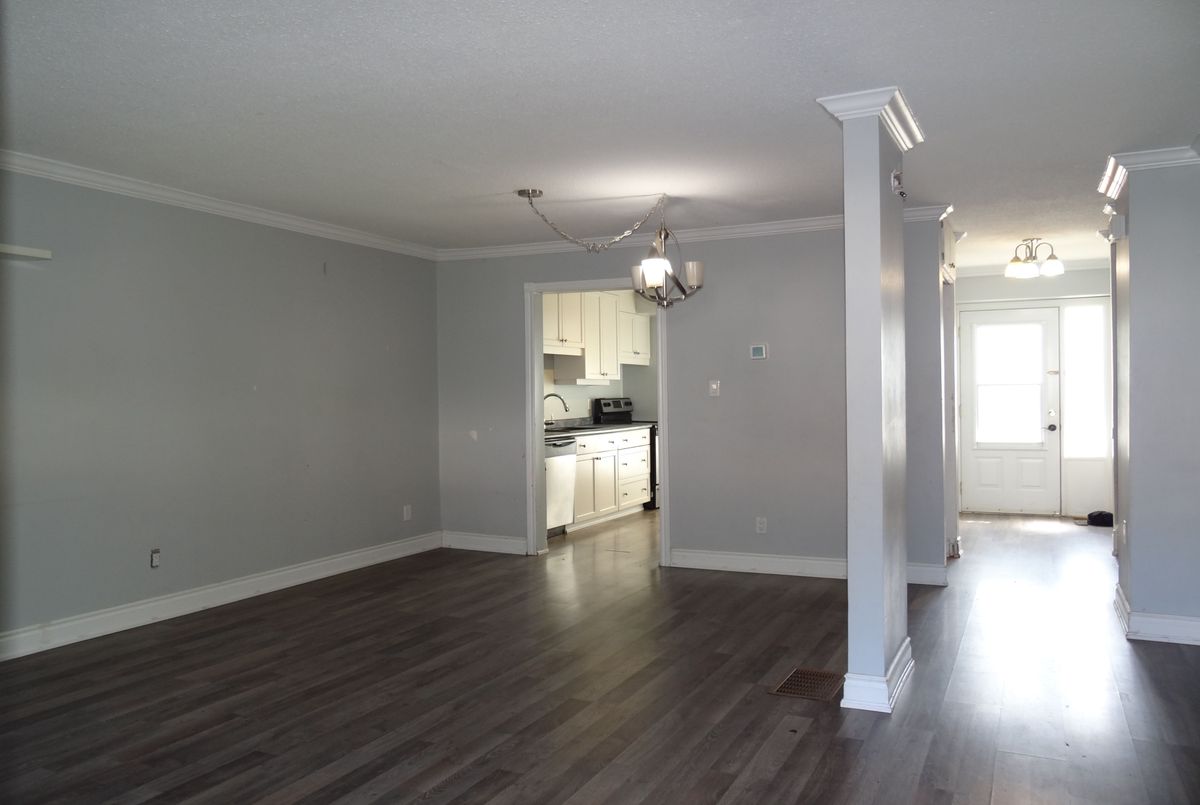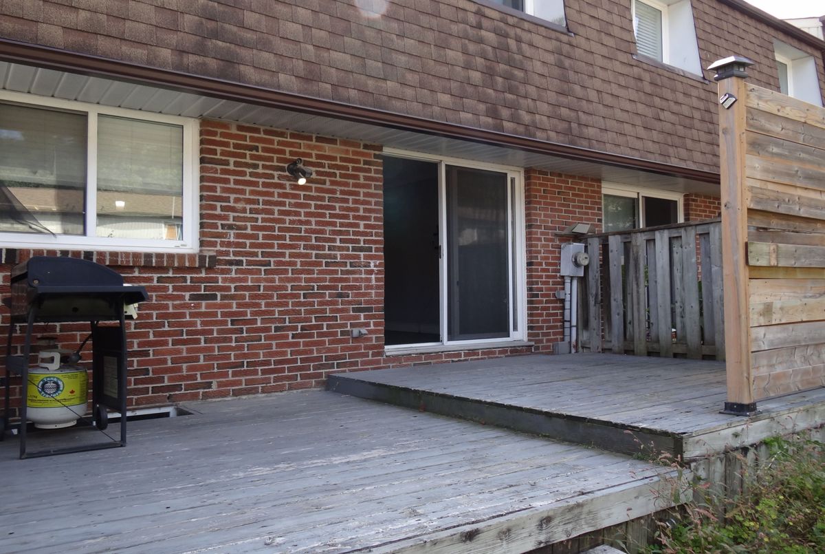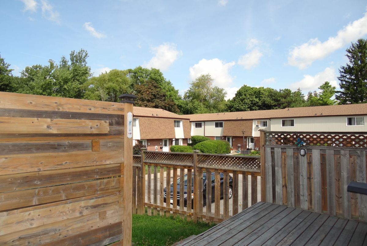 Great end unit Townhome with larger yard, private parking in front of Unit. Foyer has 2pc washroom, crown moldings and higher baseboards. Living Room/Dining Rm is a large open concept room that walks out to deck & fenced yard. Spacious bedrooms, windows replaced, forced air gas furnace and central air. Walk to park, schools, shopping & lake.