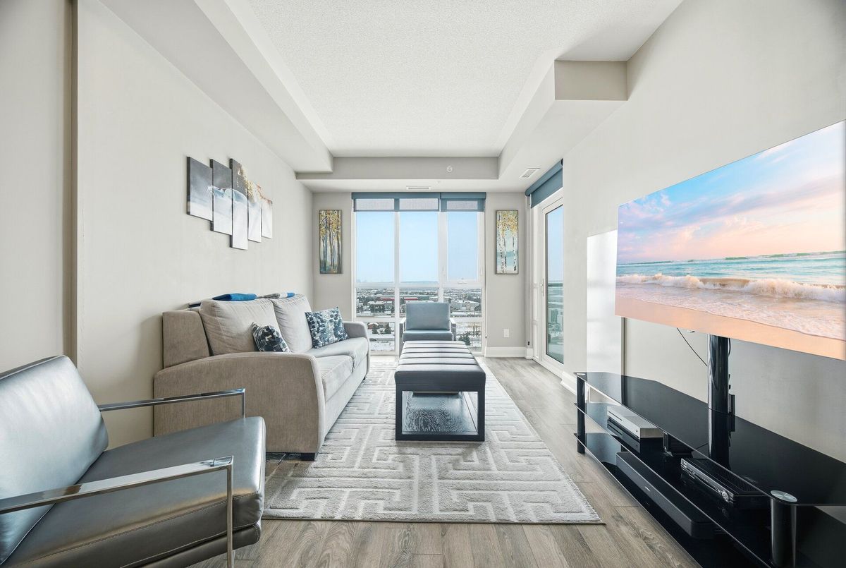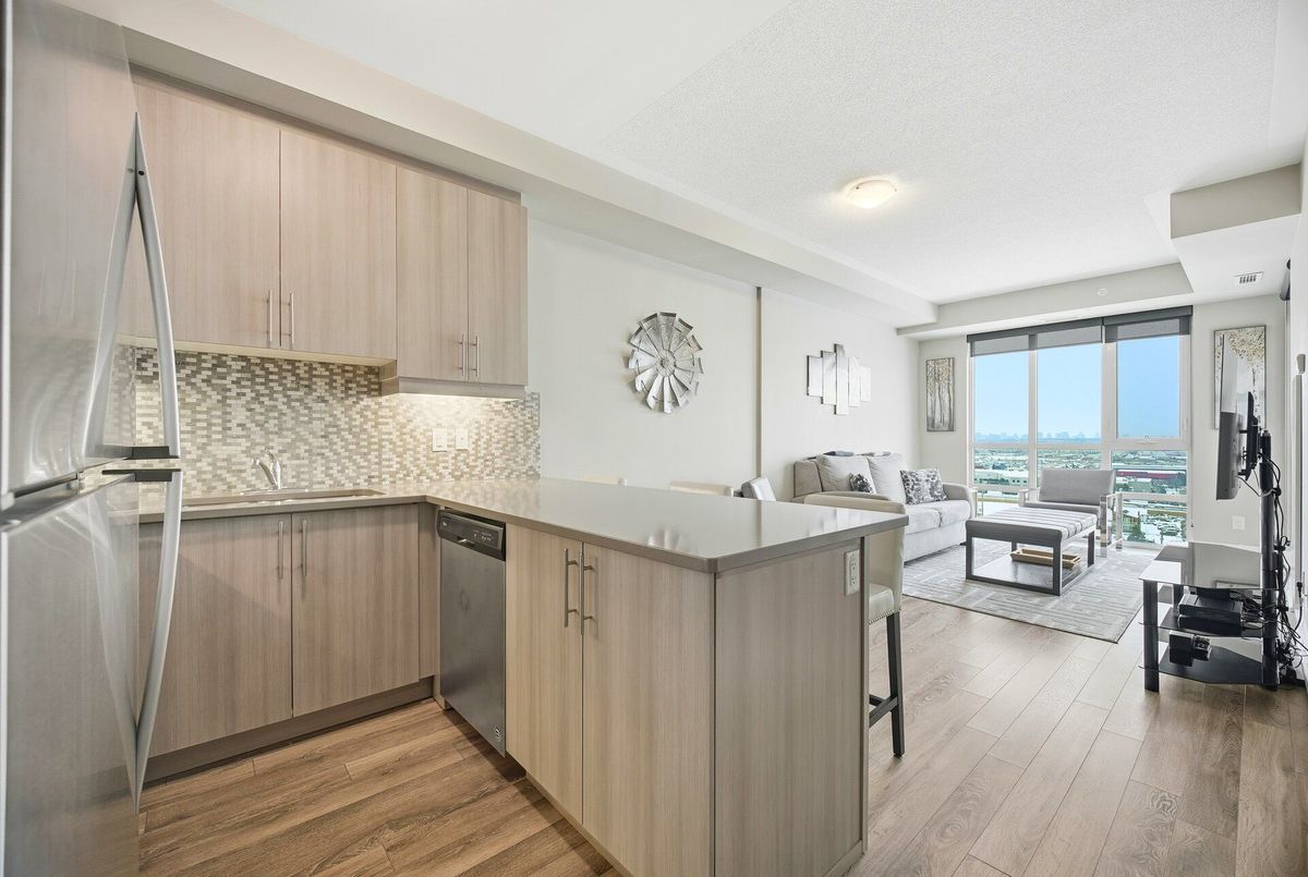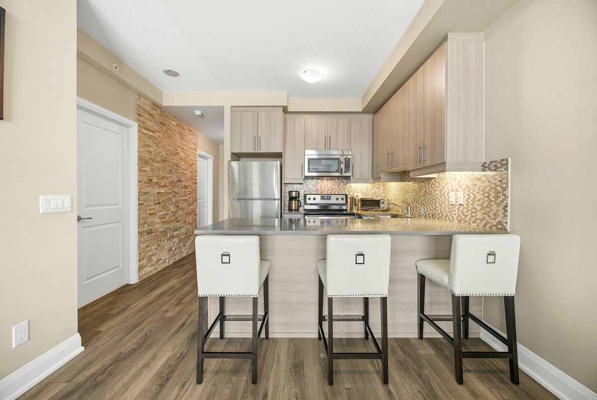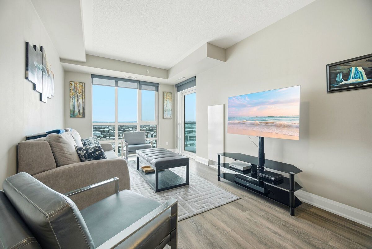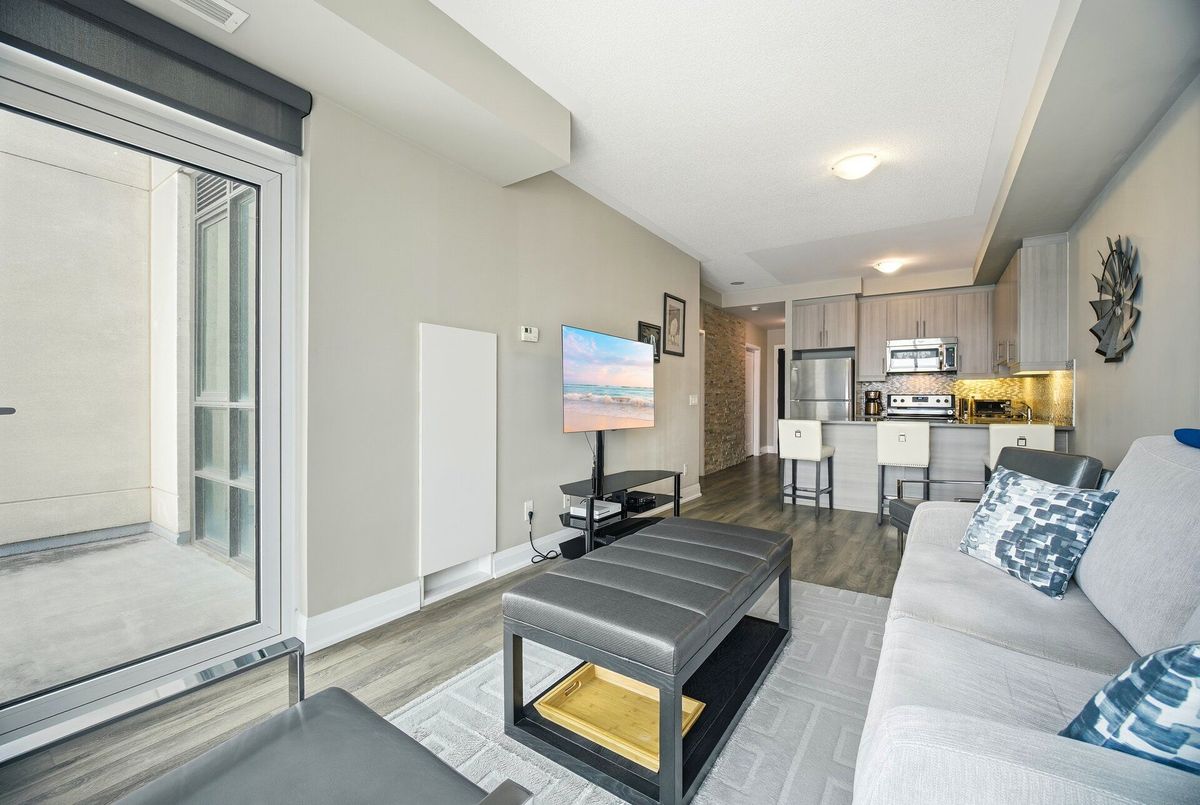 Absolutely stunning condo backing onto the Clairville Conservation Area with 800 acres of protected green space. This contemporary 1 bedroom + den, 2 bathroom residence features a walk-out to a large balcony with unobstructed views. The open-concept living and dining area is enhanced by floor-to-ceiling windows, allowing an abundance of natural light to fill the space. The entertainment-sized kitchen is equipped with stainless steel appliances and quartz countertops, perfect for both everyday living and hosting guests. The spacious primary bedroom offers a large walk-in closet and a 3-piece ensuite with a glass-enclosed shower. A generously sized den can be used as a home office or potential second bedroom, complemented by a main 3-piece bathroom. Residents are treated to an impressive collection of amenities, featuring two fitness centers, two elegant party rooms, two guest suites, and a dedicated pet spa. Set in a highly sought-after location, the building offers quick access to major highways, essential conveniences, and picturesque conservation trails. Additional features include no carpeting throughout, 1 underground parking space with direct access, and 1 storage locker. Don't miss your opportunity to call this beautiful condo home.