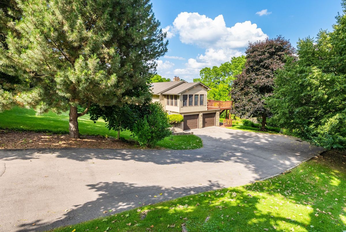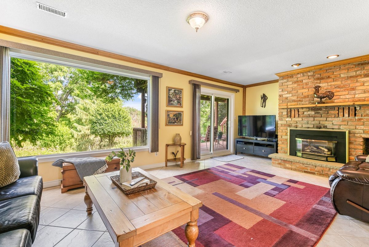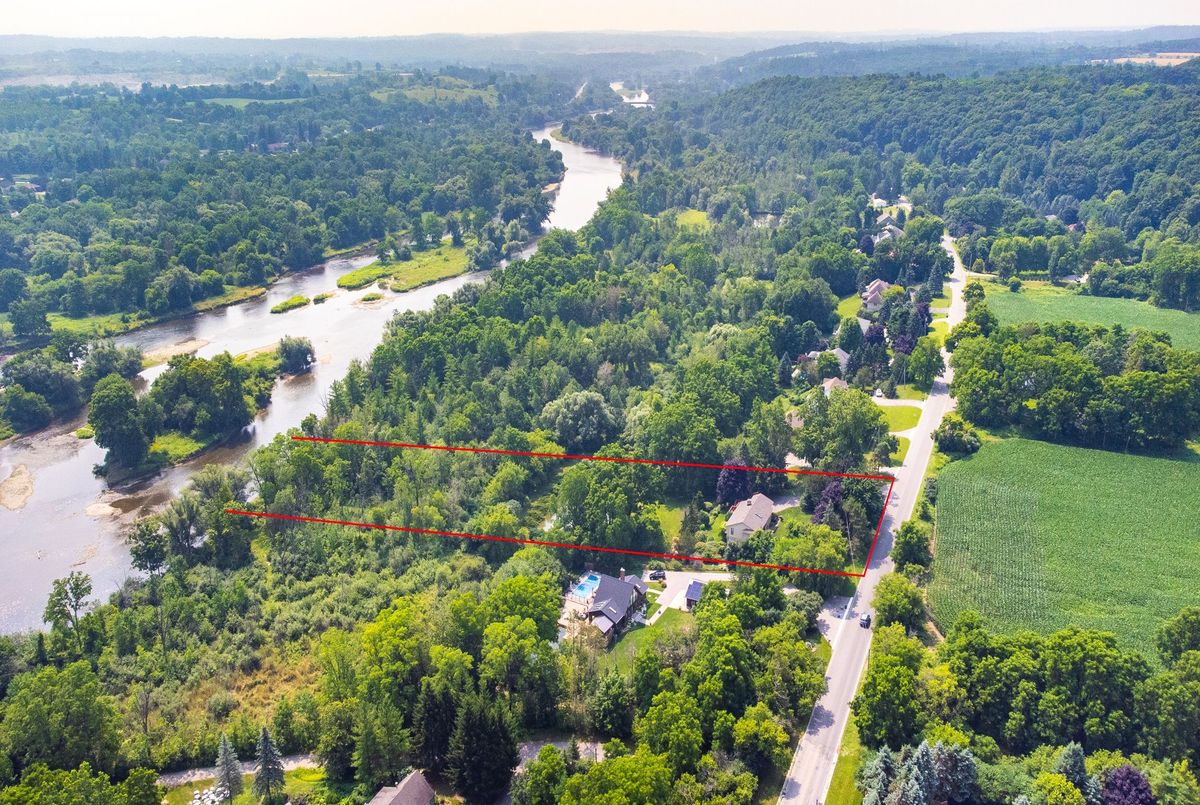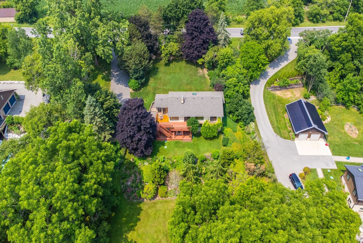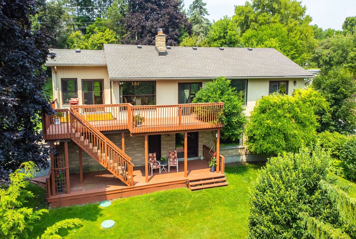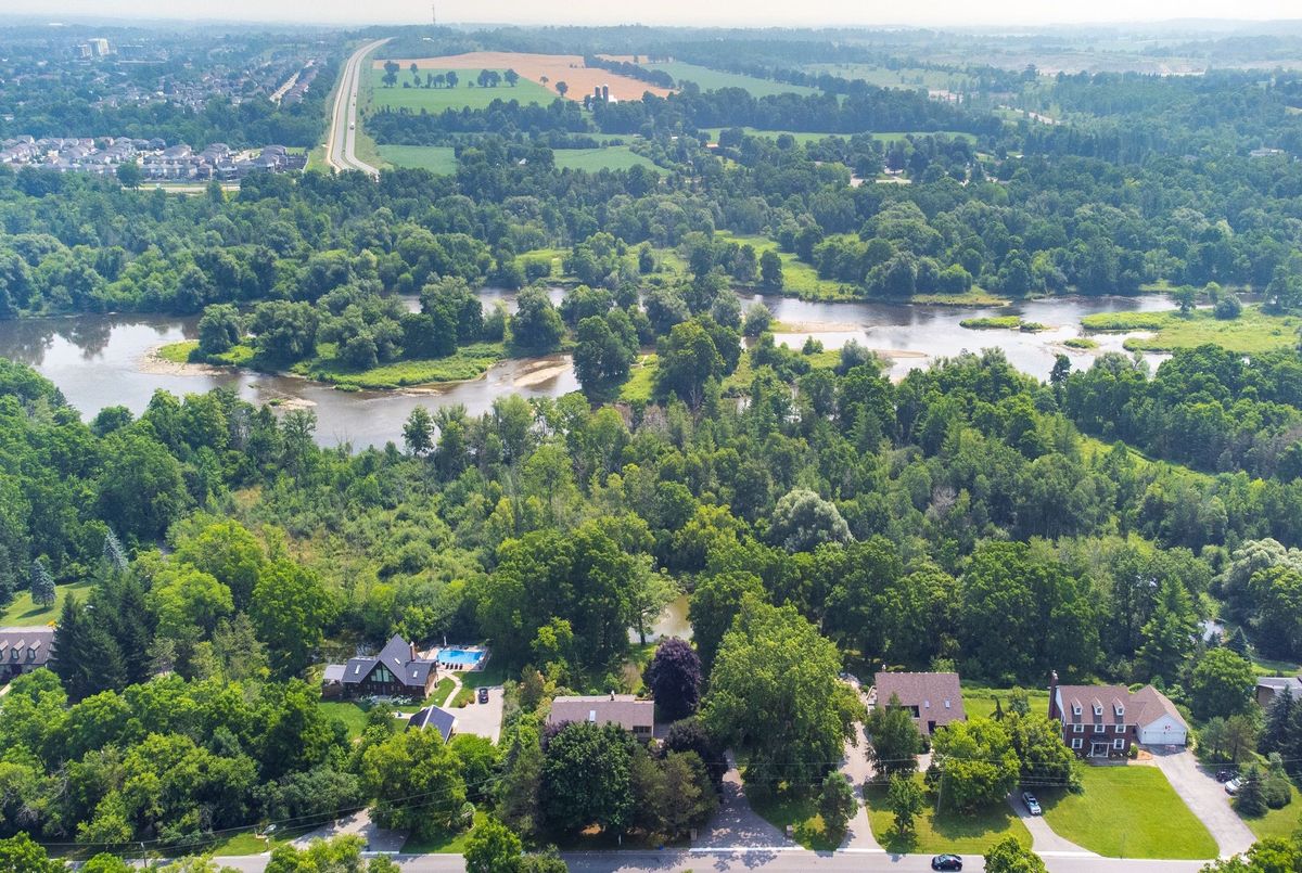 LOCATION...LOCATION...LOCATION This lovely home is situated on 1.2 acres of gorgeous land, backing onto greenspace that has direct access to the Grand River. Immerse yourself in the tranquil beauty of nature while just moments from shops, restaurants and schools. Outdoor enthusiasts will love the forested trails and access along the river, ideal for fishing & kayaking. This lovely home has a great unique layout and design with spacious rooms and wall to wall windows capturing spectacular views of the property of lush greenery and the river (in the Winter). An amazing spring fed pond that has koi fish. Its perfect for playing hockey & ice skating. The grounds are beautiful with mature trees and easy to maintain perennials. This raised bungalow is designed for adult living and entertaining with primary bedroom suite separate from the other bedrooms. The living room/great room features vaulted ceilings, hardwood floors and floor to ceiling stone fireplace. The large dining room also has vaulted ceilings and massive windows capturing the stunning views. The sunroom off the eat-in kitchens is a great space and can be used all year. The primary bedroom has a nice sized walk in closet, sliders to a small private deck and a newly renovated 5 piece ensuite, that features double sinks, soaker tub and separate walk-in shower. The lower level is a walk-out basement, so its nice and bright. Sliders to a deck from the rec. room, which has a gas fireplace. There are 2 spacious bedroom (ideal for teenagers and or guests) both with large windows and nice sized closets. Updated lower level 3 piece bathroom. The garage is an oversized 2 car garage with inside entry. Lots of parking too. Updates: roof shingles 2020, siding 2020, eaves troughs 2020, front door 2020; Gas forced air furnace & A/C 2020; water heater (2020); water softener (1 year), most windows have been replaced. Homes on this kind of land don't come around very often. Book your showing and check out the beauty.