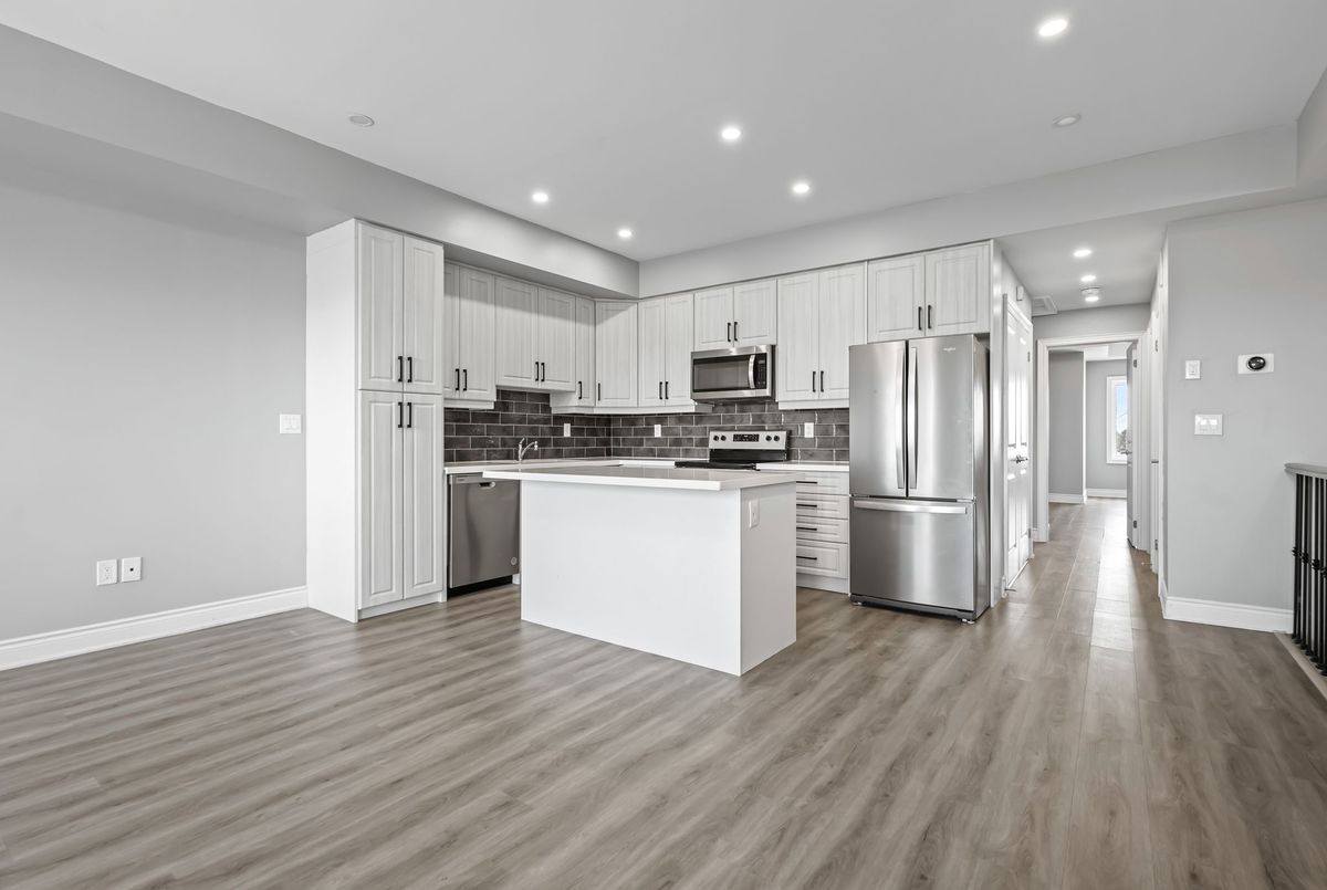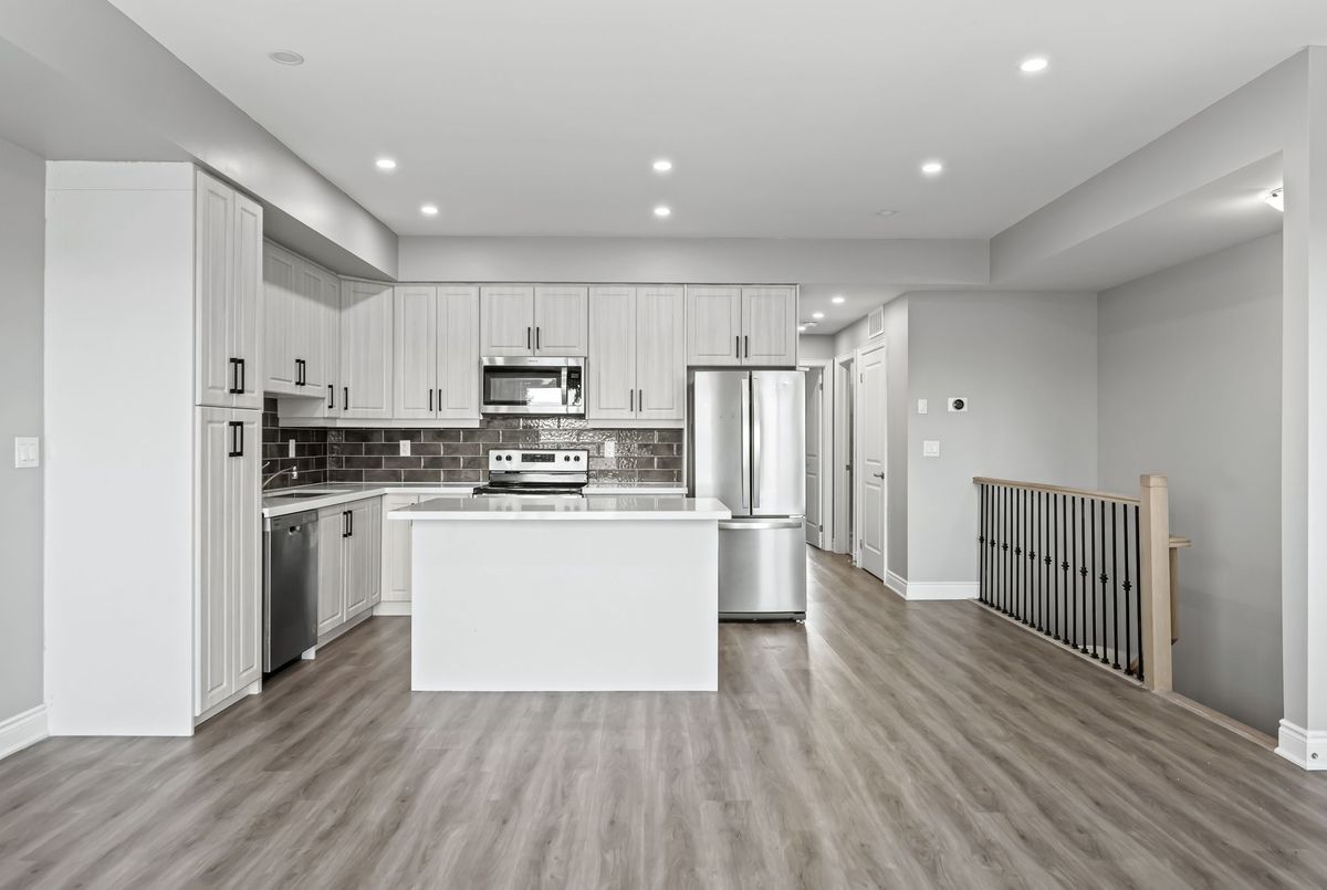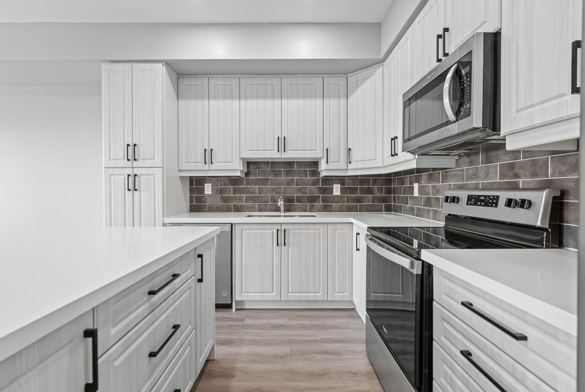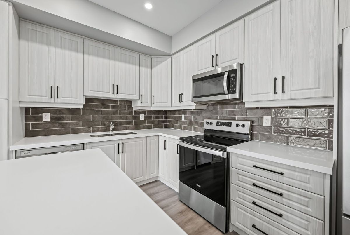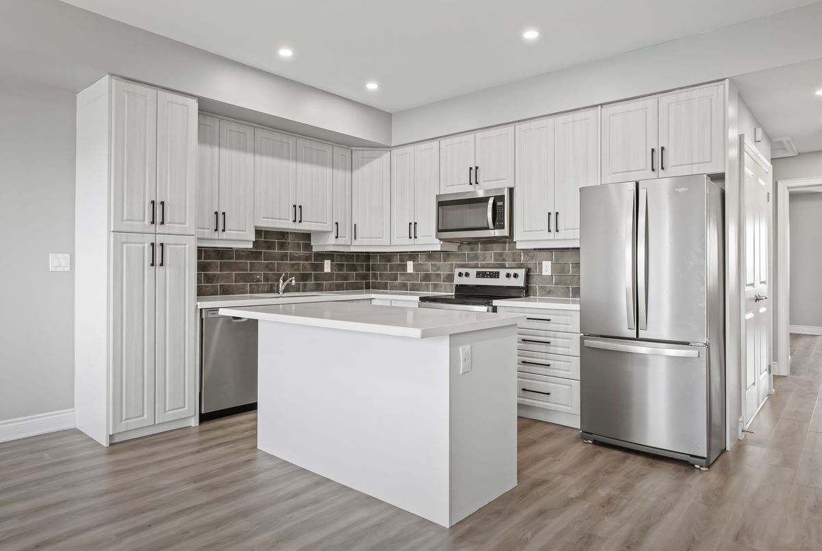 Available immediately! 2 Bedroom 2 Bathroom Stacked townhouse ideally situated within walking distance of various amenities including shops, bus stops, schools and more. As you step into this modern living space, you'll immediately notice the attention to detail and contemporary design. The kitchen boasts elegant quartz countertops, a convenient central island, stylish backsplash, and all-new appliances, making it a chef's delight. The spacious living room is illuminated by natural light streaming through two large windows, creating a bright and inviting atmosphere. Step out onto the balcony to soak in the fresh air and enjoy your morning coffee or tea. The primary bedroom offers a retreat-like ambiance with a walk-in closet, an ensuite washroom for added privacy, and its own balcony, perfect for unwinding after a long day. The second bedroom is generously sized and features a substantial closet, providing ample storage space for your belongings. Convenience is key with an in-unit laundry, allowing you to take care of chores with ease.