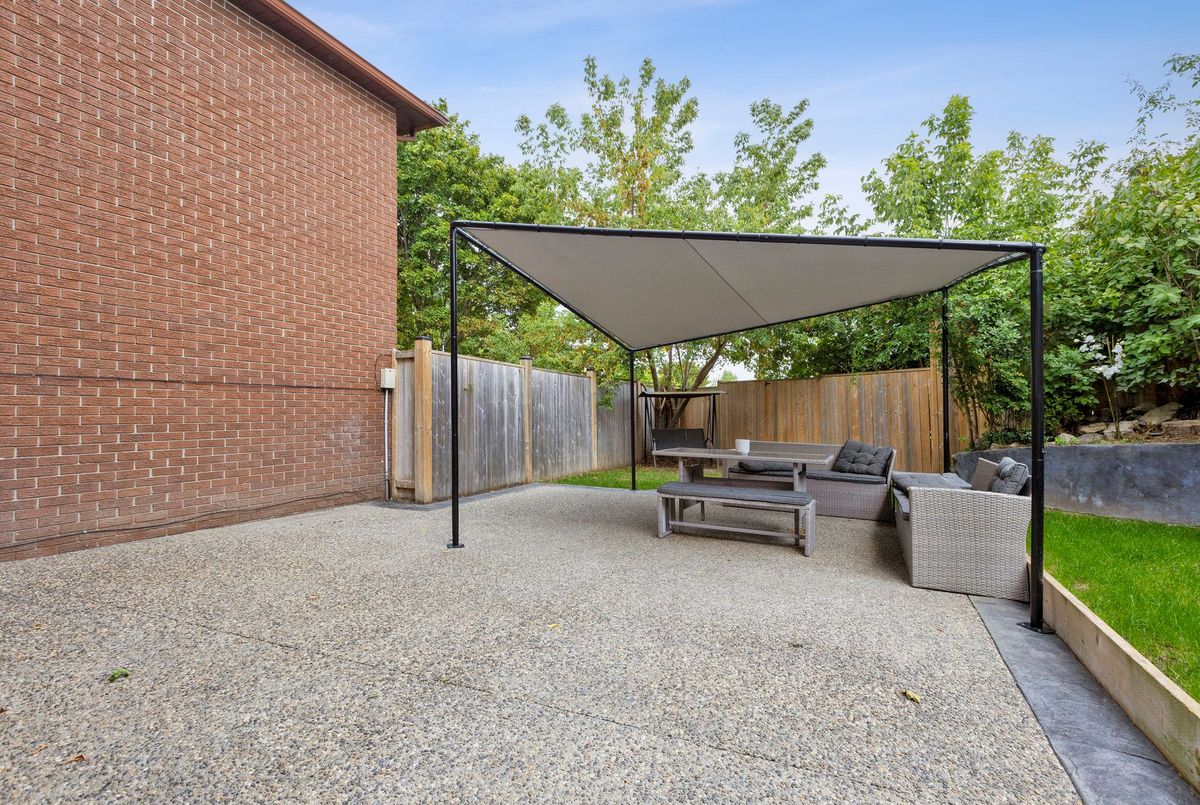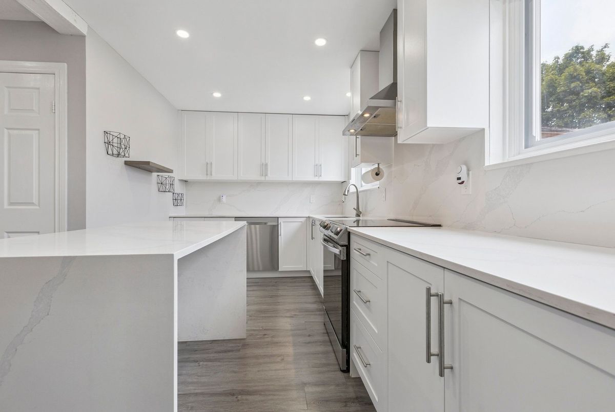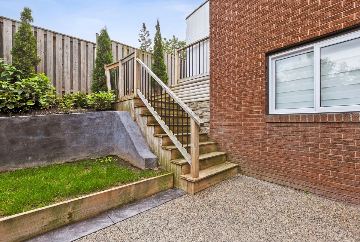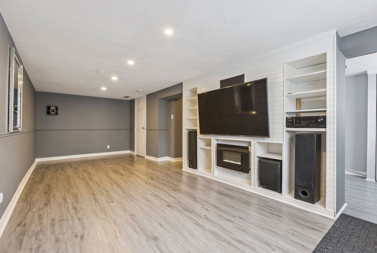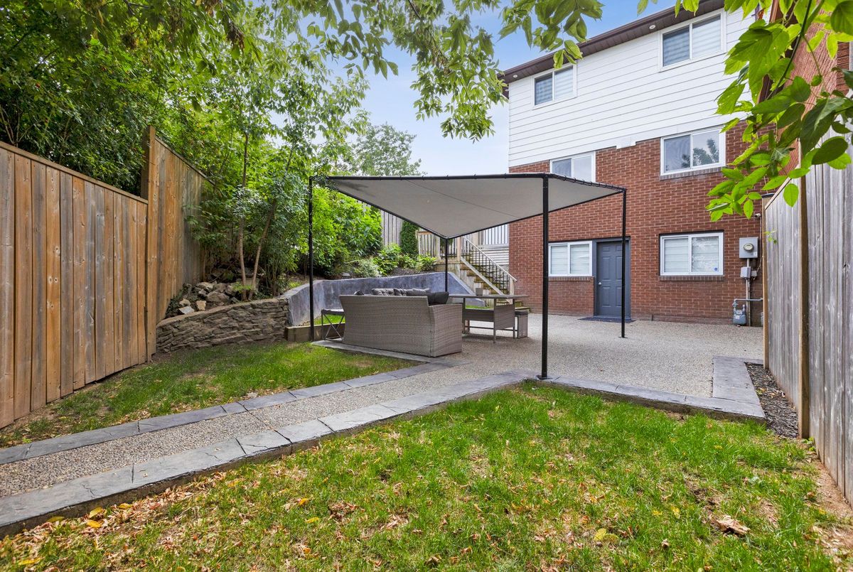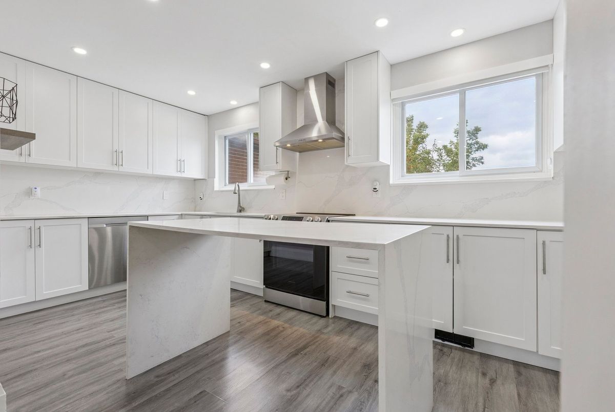 Must See: Welcome to 122 Mooregate Crescent! A fully renovated 4+1 bedroom semi-detached home with a walk-out basement.The home features a custom exposed aggregate concrete driveway with parking for 4 vehicles. Inside, you'll find a bright, open-concept main floor with premium SPC luxury vinyl flooring, pot lights throughout, a fireplace, and zebra blinds. The modern kitchen offers sleek cabinetry, quartz countertops and backsplash, stainless steel appliances, and a waterfall island ideal for both daily use and entertaining. Upstairs includes 4 generous bedrooms and a renovated 4-piece bathroom (2025).The finished walk-out basement includes a spacious rec room with a custom wall unit(entertainment system included), bedroom/den/office area, and a laundry/utility area with plenty of space. Can be easily converted to an in-law suite or a separate rental unit.Step outside to a private backyard featuring a concrete patio with shade cover (patio furniture included), two storage sheds, and outdoor lighting.Additional updates include: Furnace (2019) + Central A/C (2023)Located just steps from Victoria HillsCommunity Centre, steps from Hillside Public School, close to shopping, parks, and other amenities. This is a perfect family home, book your showing today! Some rooms have been virtually staged to help you visualize the space's potential.
