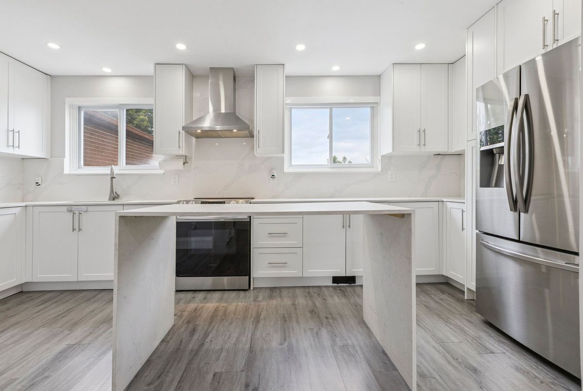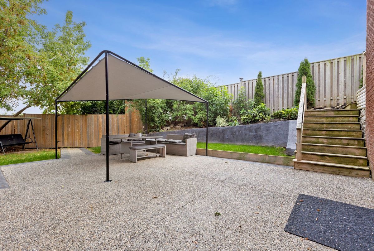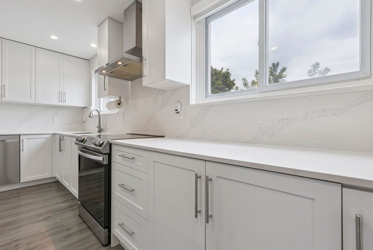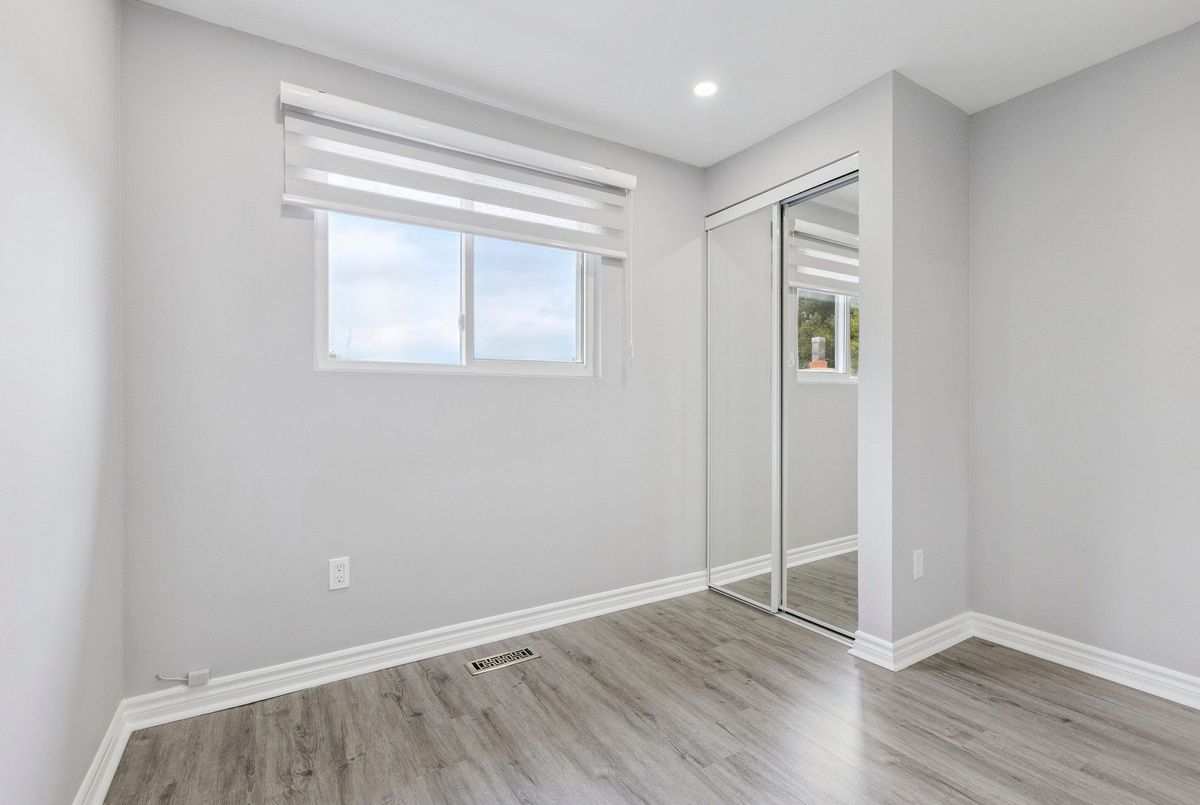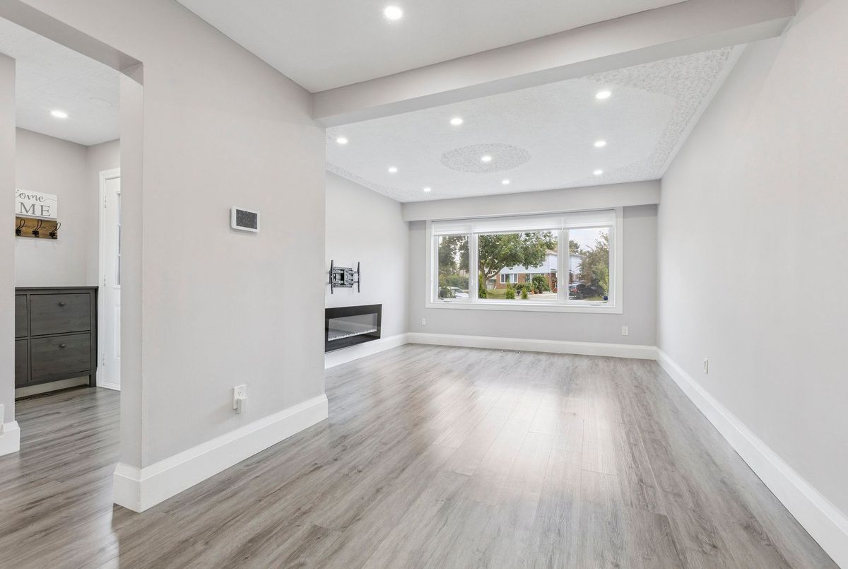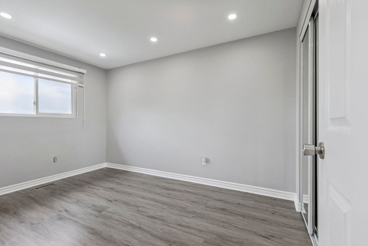 Must See: Welcome to 122 Mooregate Crescent! A fully renovated 4+1 bedroom semi-detached home with a walk-out basement.The home features a custom exposed aggregate concrete driveway with parking for 4 vehicles. Inside, you'll find a bright, open-concept main floor with premium SPC luxury vinyl flooring, pot lights throughout, a fireplace, and zebra blinds. The modern kitchen offers sleek cabinetry, quartz countertops and backsplash, stainless steel appliances, and a waterfall island ideal for both daily use and entertaining. Upstairs includes 4 generous bedrooms and a renovated 4-piece bathroom (2025).The finished walk-out basement includes a spacious rec room with a custom wall unit(entertainment system included), bedroom/den/office area, and a laundry/utility area with plenty of space. Can be easily converted to an in-law suite or a separate rental unit.Step outside to a private backyard featuring a concrete patio with shade cover (patio furniture included), two storage sheds, and outdoor lighting.Additional updates include: Furnace (2019) + Central A/C (2023)Located just steps from Victoria HillsCommunity Centre, steps from Hillside Public School, close to shopping, parks, and other amenities. This is a perfect family home, book your showing today! Some rooms have been virtually staged to help you visualize the space's potential.