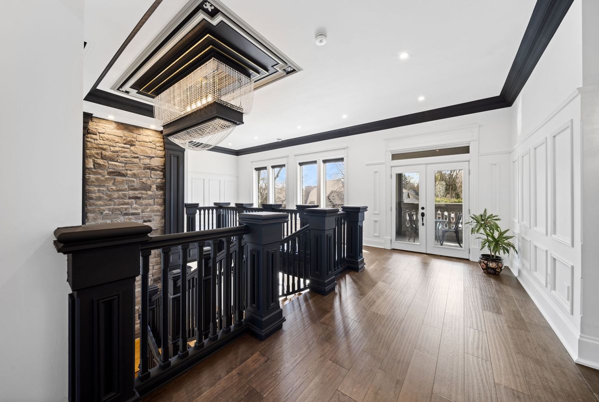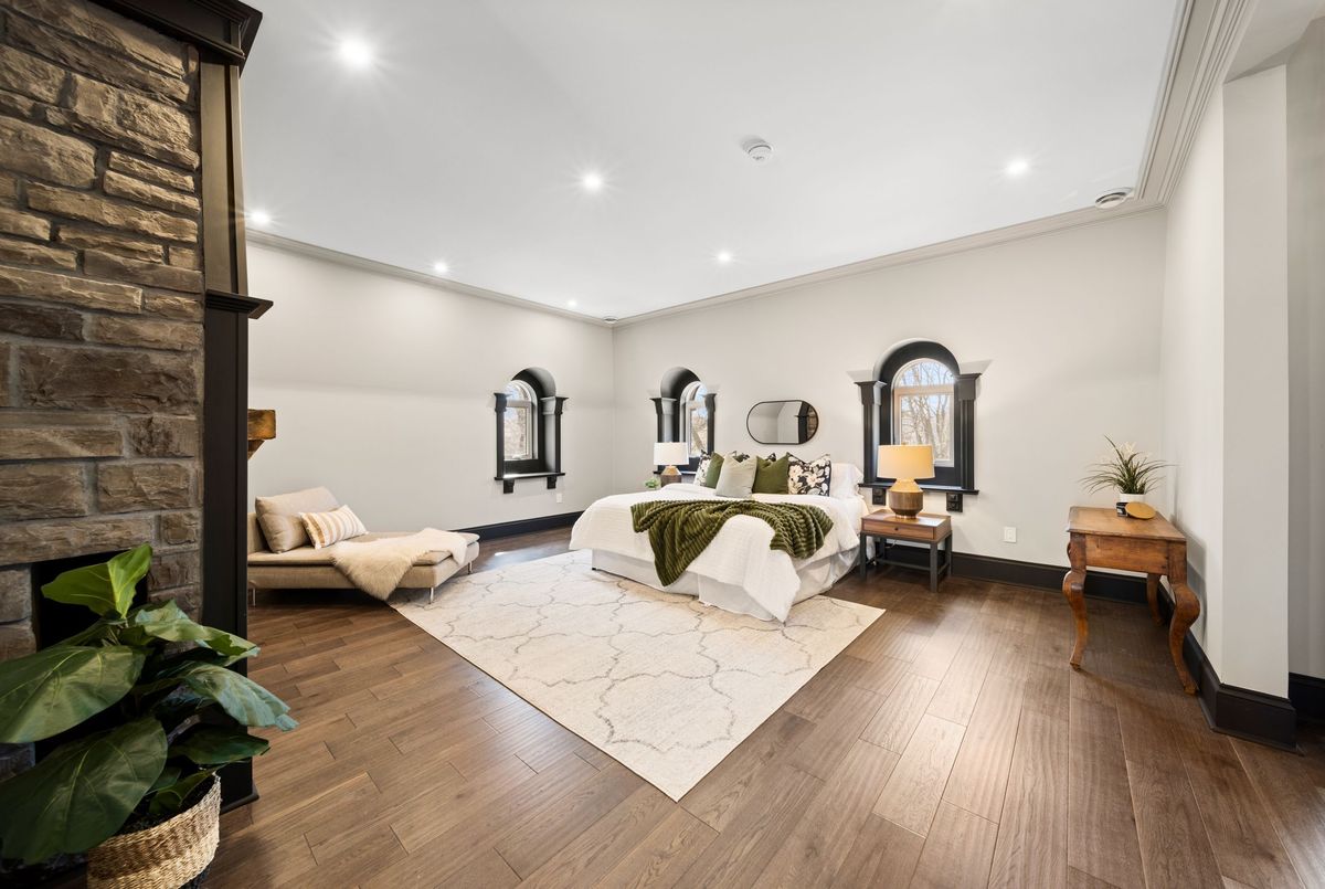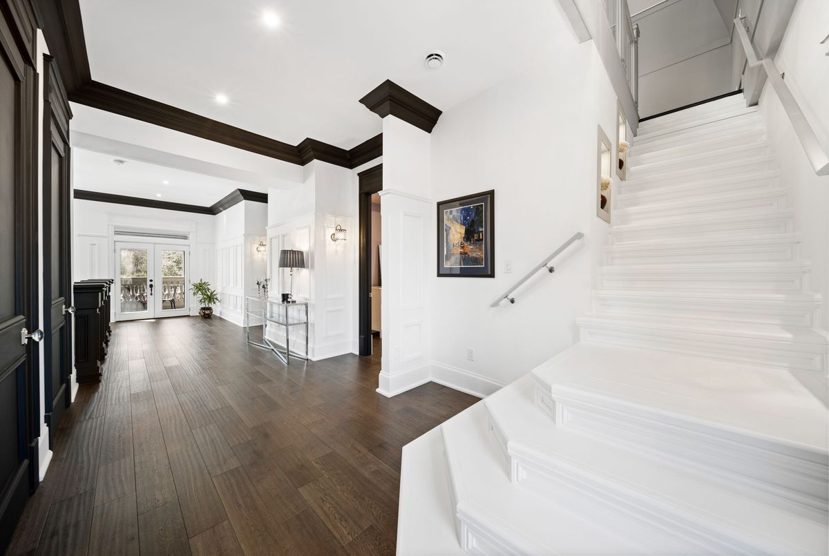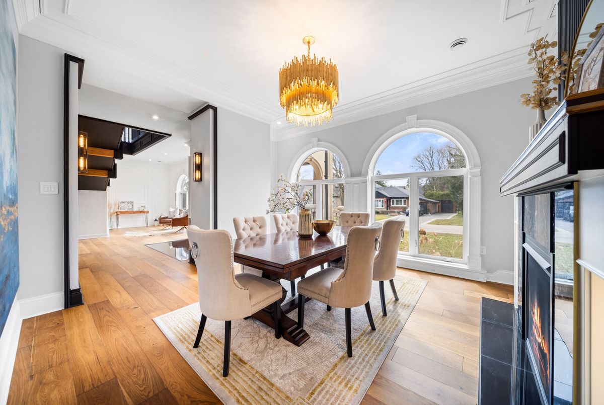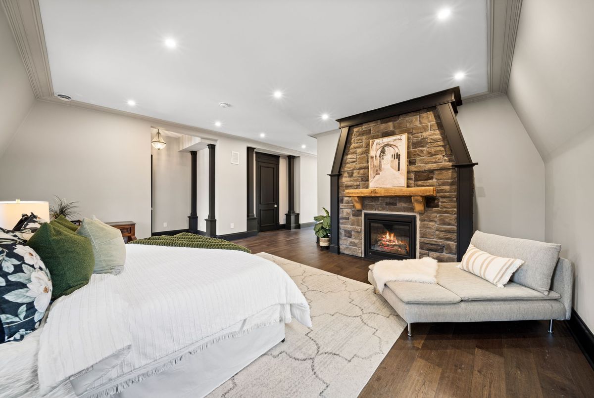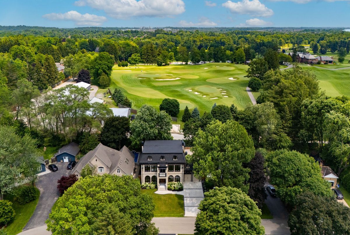 Nestled in scenic Ancaster Village, this French Chateau-inspired residence offers over 7,000 sqft of luxury backing onto the iconic Hamilton Golf Club, with sweeping views of one of Canada's premier courses. This 3-storey masterpiece features 4 beds, 7 baths, 10.5' soaring ceilings, custom millwork, and refined European design. The main floor is designed for entertaining, showcasing a gourmet kitchen with high-end appliances, quartz counters, custom cabinetry and a large island. Three sets of double doors open to a covered outdoor dining area. A formal dining room with chandelier, fireplace and wet bar adds elegance, while the family room with built-ins and fireplace connects seamlessly to the landscaped yard. Second level is dedicated to ultimate comfort, 3 spacious bedrooms each with private baths & walk-in closets. Primary suite boasts gorgeous stone fireplace, custom walk-in closet & spa-like ensuite with freestanding tub, rainfall shower, glass shower, and private terrace overlooking the golf course. Third level serves as a secluded refuge with spacious living room, large bedroom, full bath & kitchenette. A walk-out portico terrace offers panoramic views of the golf course. Lower level features 9' ceilings, a recroom, fitness room, family room with another fireplace, full bathroom, heated floors & a kitchenette. A wine cellar completes your chateau experience. The property boasts a cedar-ceiling covered deck, outdoor gas fireplace, mature trees for privacy, 5 fireplaces, 3 dishwashers, Terrazzo concrete driveway & large tandem garage with 4-post car lift for the car enthusiast. Crafted with an ICF foundation and whole-home hydronic in-floor heating across all four levels, the residence delivers year-round comfort, remarkably low operating costs, and a reduced carbon footprint-luxury that's as smart as it is beautiful. Close to fine dining, shopping, trails, and conservation areas, this property is a rare haven of sophistication, luxury, and timeless elegance.