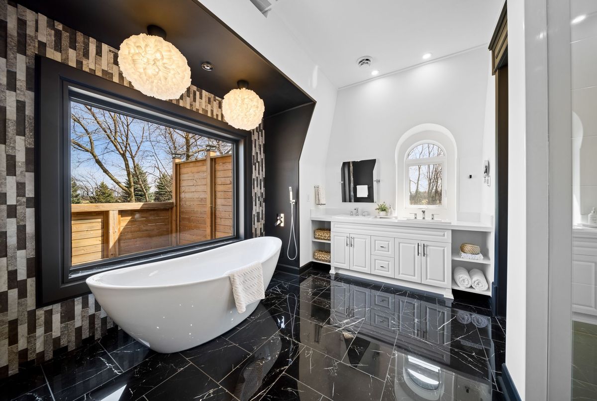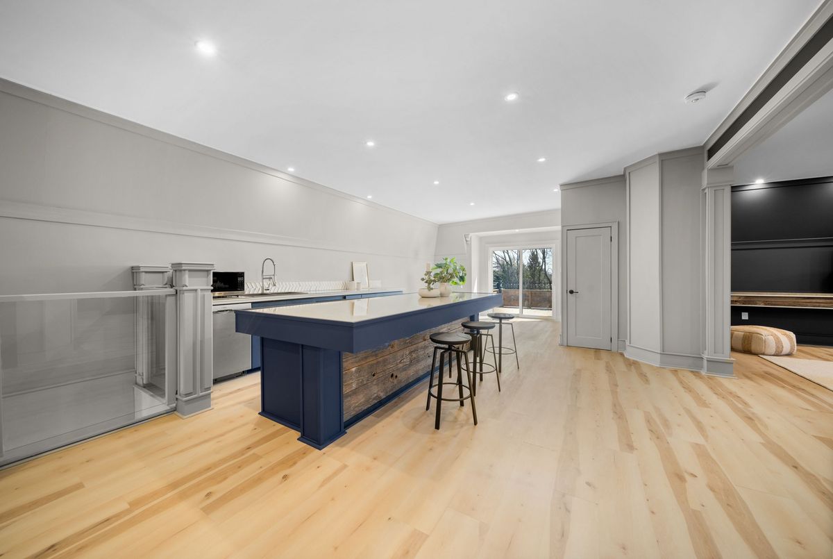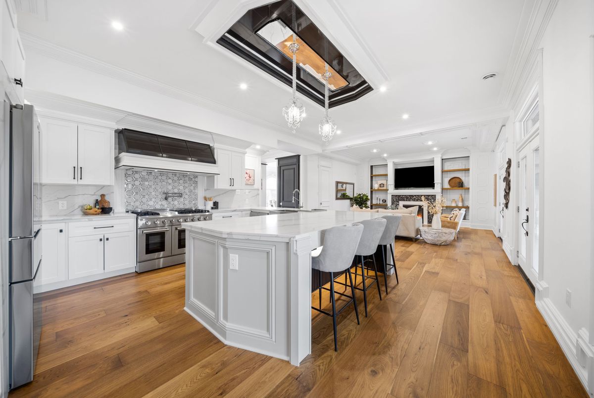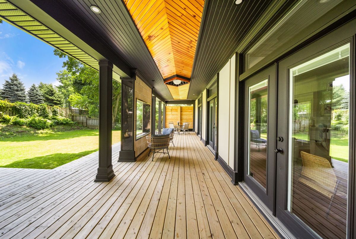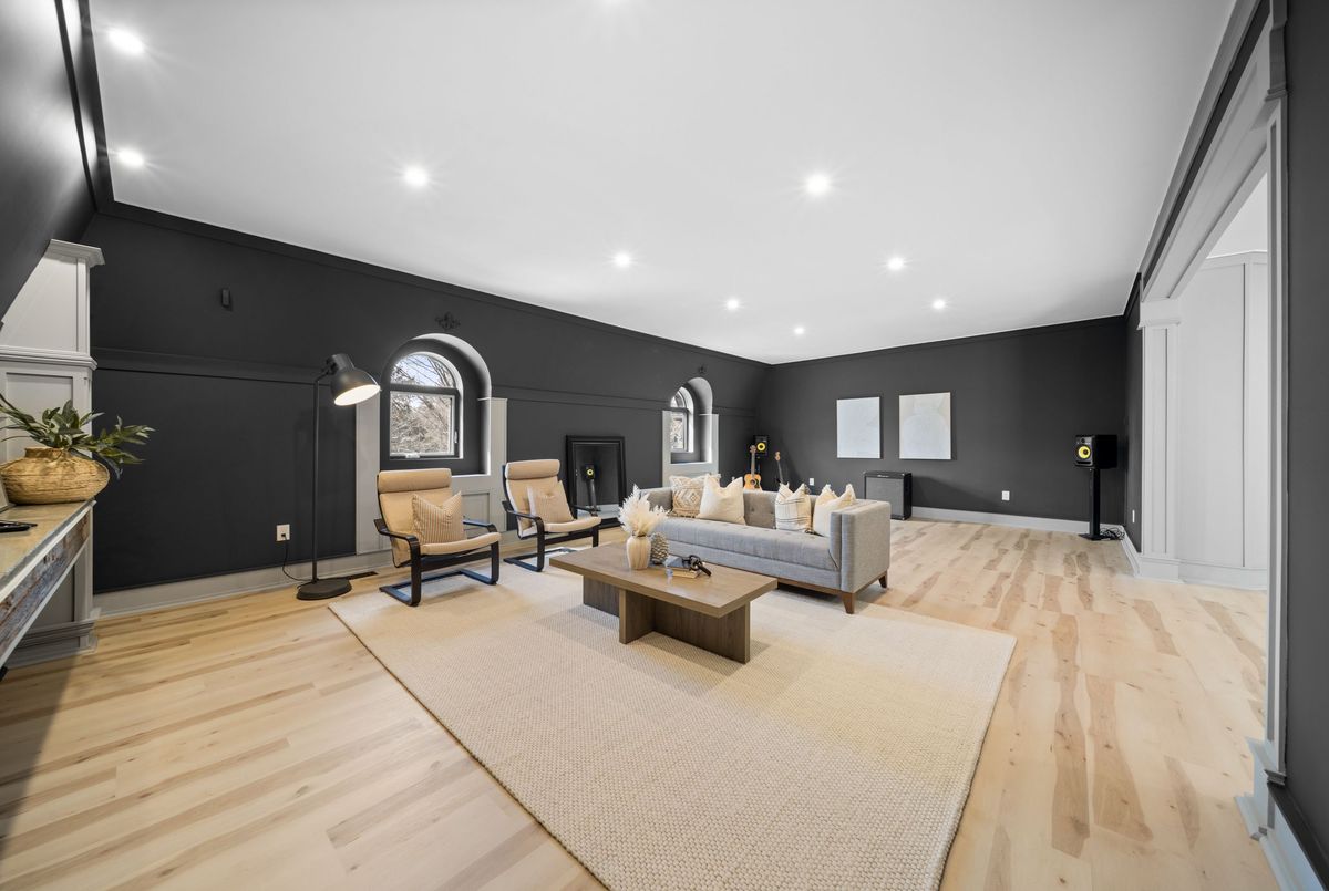 Nestled in scenic Ancaster Village, this French Chateau-inspired residence offers over 7,000 sqft of luxury backing onto the iconic Hamilton Golf Club, with sweeping views of one of Canada's premier courses. This 3-storey masterpiece features 4 beds, 7 baths, 10.5' soaring ceilings, custom millwork, and refined European design. The main floor is designed for entertaining, showcasing a gourmet kitchen with high-end appliances, quartz counters, custom cabinetry and a large island. Three sets of double doors open to a covered outdoor dining area. A formal dining room with chandelier, fireplace and wet bar adds elegance, while the family room with built-ins and fireplace connects seamlessly to the landscaped yard. Second level is dedicated to ultimate comfort, 3 spacious bedrooms each with private baths & walk-in closets. Primary suite boasts gorgeous stone fireplace, custom walk-in closet & spa-like ensuite with freestanding tub, rainfall shower, glass shower, and private terrace overlooking the golf course. Third level serves as a secluded refuge with spacious living room, large bedroom, full bath & kitchenette. A walk-out portico terrace offers panoramic views of the golf course. Lower level features 9' ceilings, a recroom, fitness room, family room with another fireplace, full bathroom, heated floors & a kitchenette. A wine cellar completes your chateau experience. The property boasts a cedar-ceiling covered deck, outdoor gas fireplace, mature trees for privacy, 5 fireplaces, 3 dishwashers, Terrazzo concrete driveway & large tandem garage with 4-post car lift for the car enthusiast. Crafted with an ICF foundation and whole-home hydronic in-floor heating across all four levels, the residence delivers year-round comfort, remarkably low operating costs, and a reduced carbon footprint-luxury that's as smart as it is beautiful. Close to fine dining, shopping, trails, and conservation areas, this property is a rare haven of sophistication, luxury, and timeless elegance.