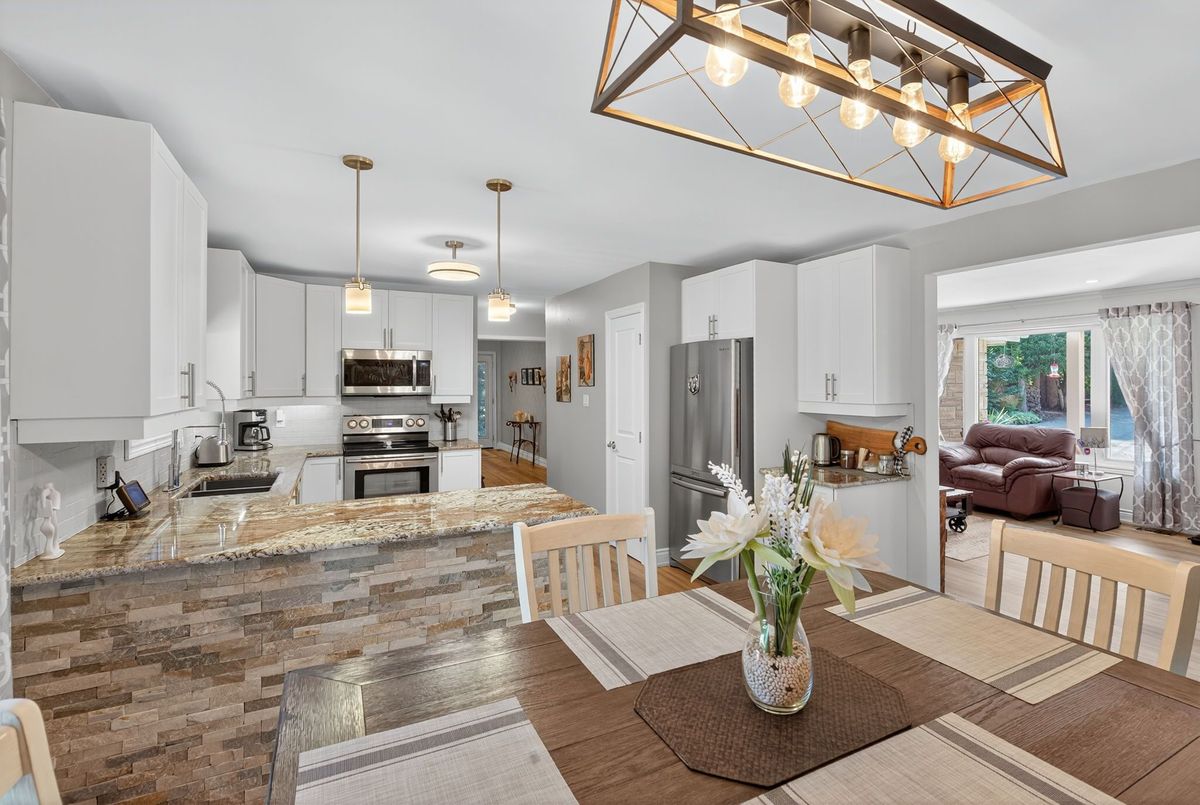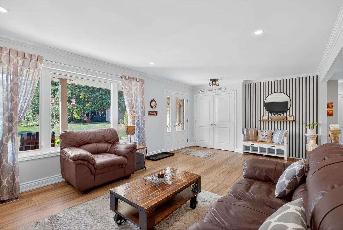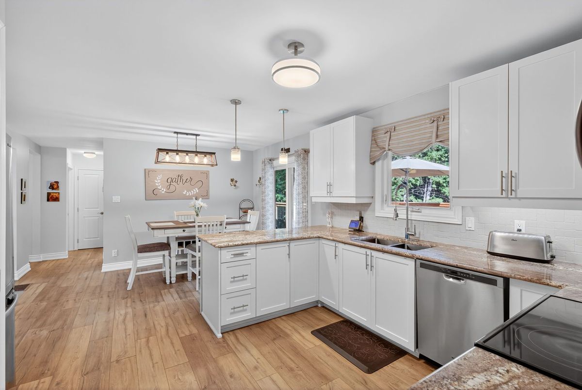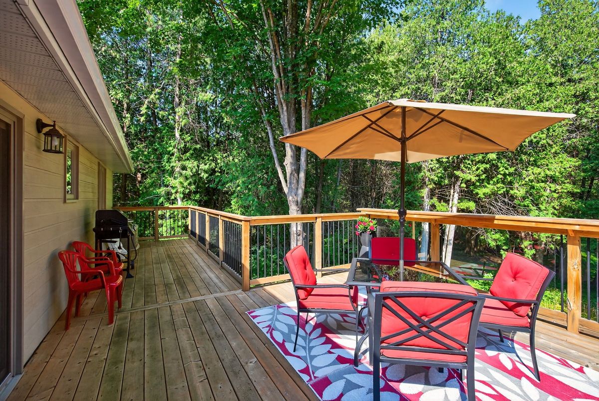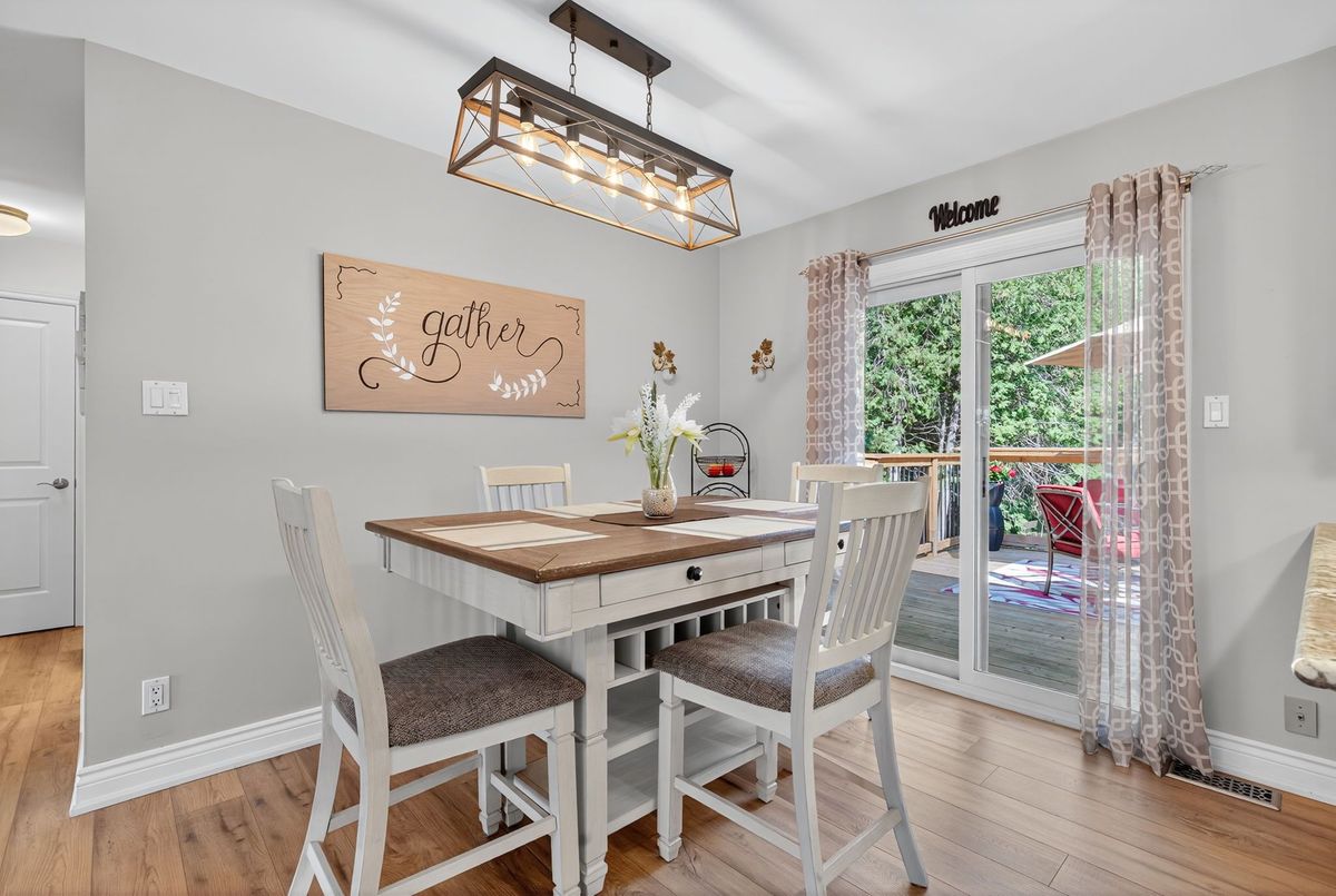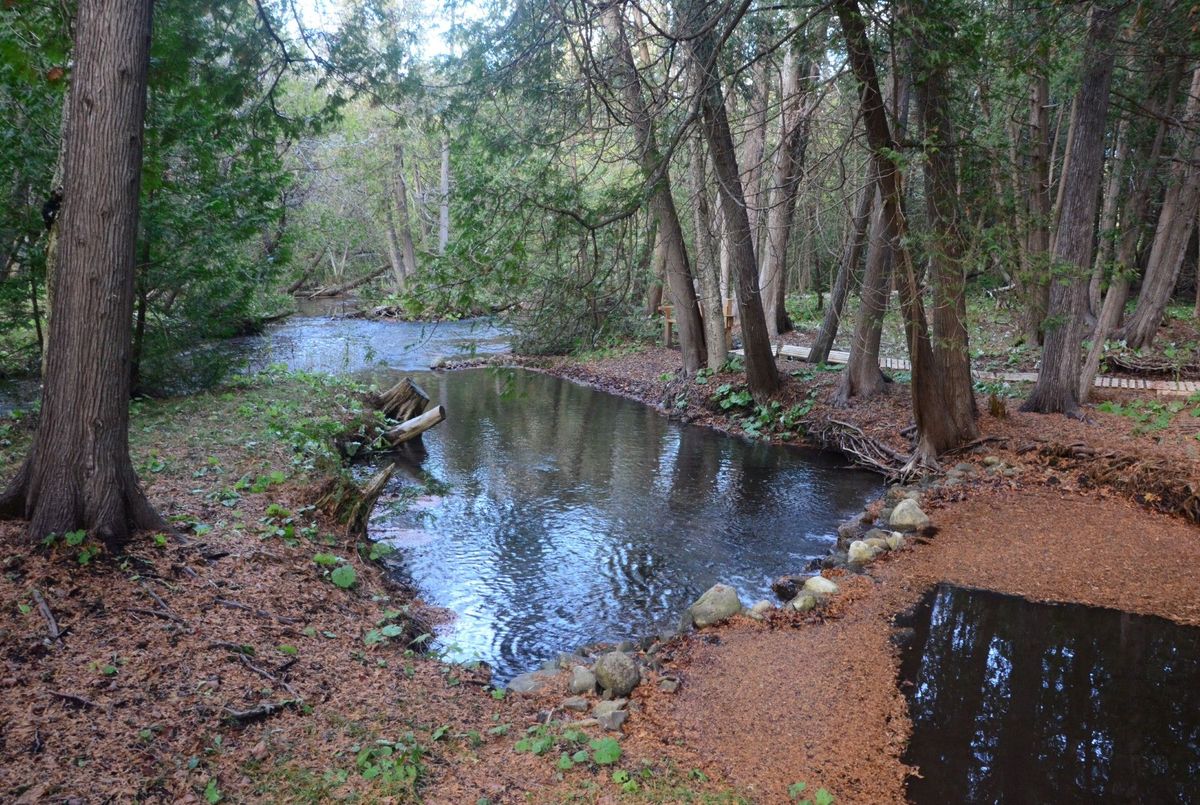 Discover this stunning bungalow nestled on a quiet dead-end country road, set on a breathtaking 1.2-acre lot with serene views and the peaceful sound of Sheldon Creek running behind the property. The main floor offers a spacious living room, formal dining room, and an updated kitchen featuring granite countertops and a walk-in pantry. Enjoy meals in the bright eat-in area, or step outside to the large 2022-built deck perfect for relaxing and entertaining. The home features 3 generously sized bedrooms, with the primary suite boasting a private 3-piece ensuite. Luxury vinyl flooring runs throughout the main level for a modern, low-maintenance finish. The lower level is ideal for both relaxing and entertaining, with a large recreation room, a walk-out to the patio and hot tub area (hot tub included as is), plus abundant storage. There is also a roughed-in sauna ready for your personal touch. Recent Updates & Features: Roof (2019)Windows (2010)Furnace & A/C (2015)Water Softener (2019)Ultra Violet System (2015)Hot Water Tank (Owned)Gas Stove & BBQ Line (2020)New Well Pump (2021)Whether you're looking to raise a family, downsize, or enjoy a peaceful retirement, this property offers the perfect blend of country charm and modern comfort. Enjoy evening walks on the Quiet Dead End Country Rd. Enjoy breakfast on an elevated deck surrounded by a canopy of trees and relax to the sound of the creek. Finished walk out basement has in-law potential. Side entrance from den to partially fenced back yard!