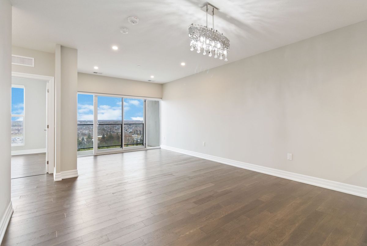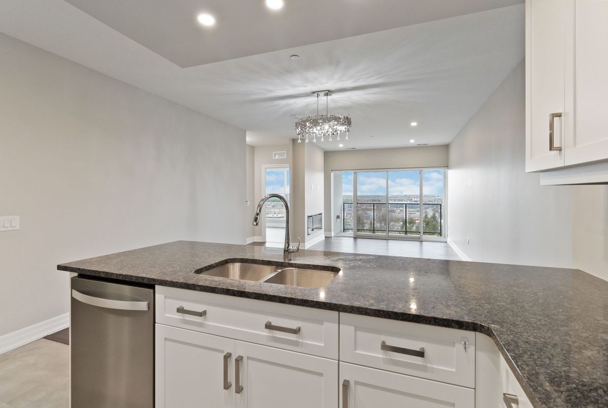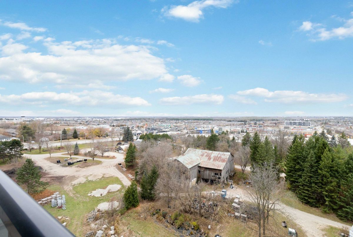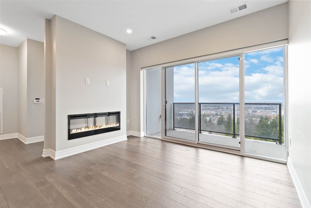Welcome to Gordon Square Condominiums in South Guelph. This stunning 7th Floor Large 1 Bedroom suite open concept layout combined with huge windows makes this suite feel even larger than the already impressive 894 sq. ft. and additional 69 sqft balcony. Deluxe contemporary stylings are throughout the suite beginning with the breathtaking kitchen complete with granite countertops, stainless steel appliances, valance lighting & a gorgeous backsplash and the entire suite is engineered hardwood flooring with porcelain in the kitchen, bathroom and laundry. Monthly condo fee includes heating, cooling, water and sewage. One secure underground parking space and storage locker is included. Amenities that Gordon Square has to offer, include guest suites for visiting friends and family, a cutting-edge golf simulator for the avid golfer, a lavish party room for hosting gatherings, and a fully equipped gym. Close proximity to all amenities and major highways. *For Additional Property Details Click The Brochure Icon Below*