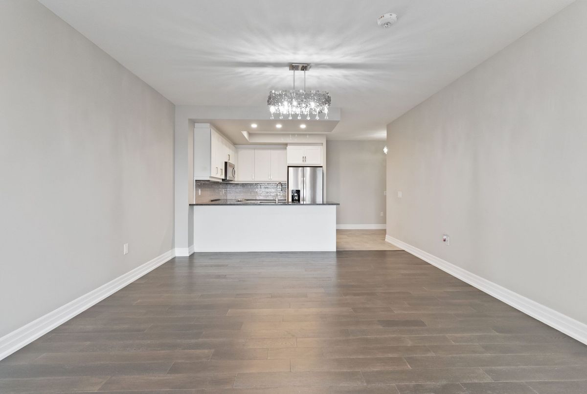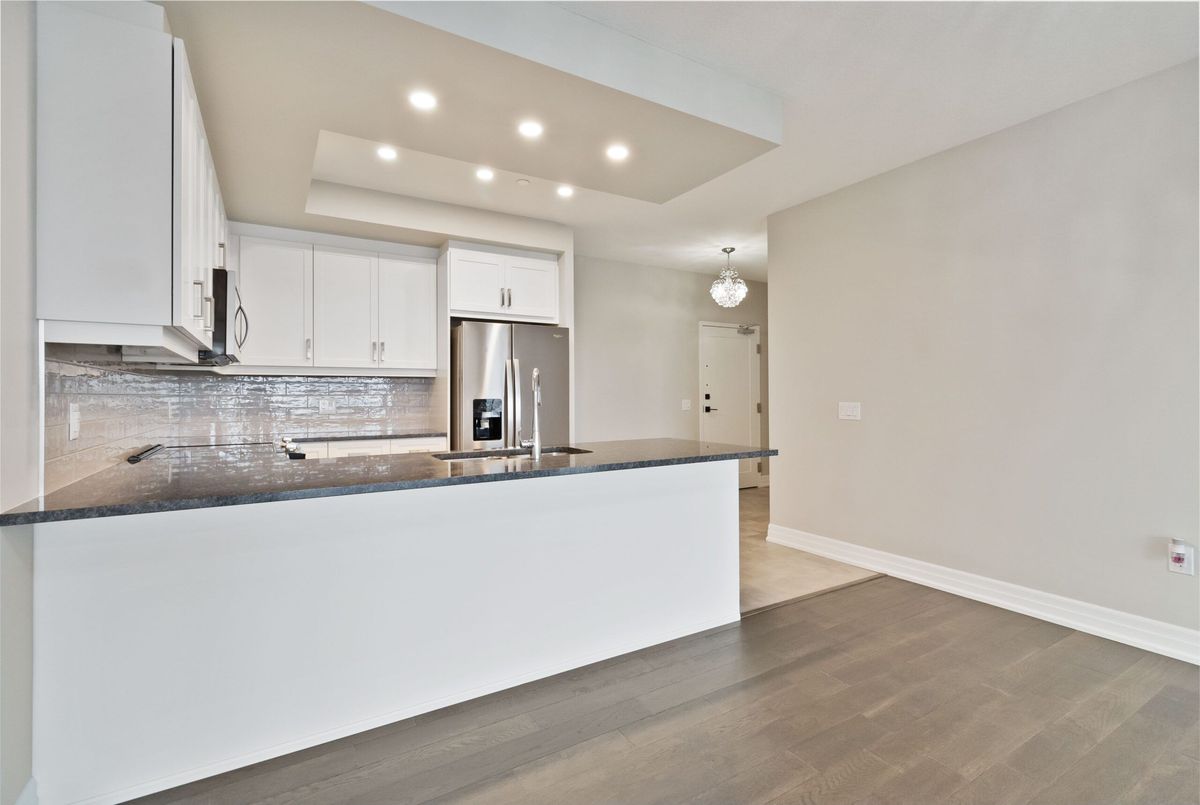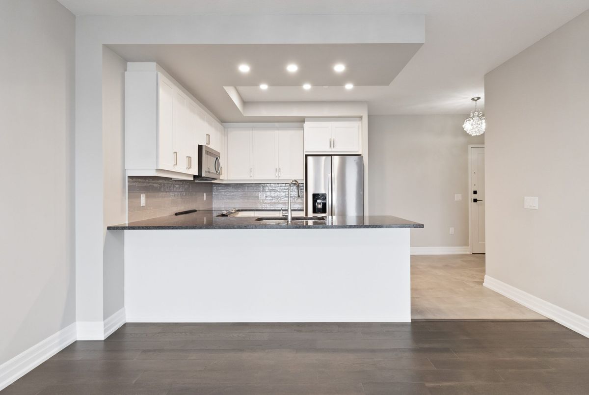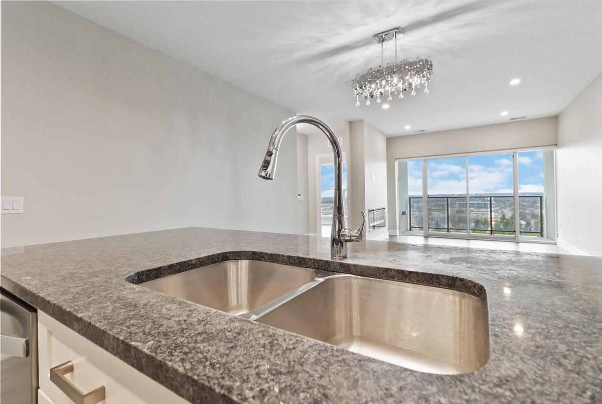 Welcome to Gordon Square Condominiums in South Guelph. This stunning 7th Floor Large 1 Bedroom suite open concept layout combined with huge windows makes this suite feel even larger than the already impressive 894 sq. ft. and additional 69 sqft balcony. Deluxe contemporary stylings are throughout the suite beginning with the breathtaking kitchen complete with granite countertops, stainless steel appliances, valance lighting & a gorgeous backsplash and the entire suite is engineered hardwood flooring with porcelain in the kitchen, bathroom and laundry. Monthly condo fee includes heating, cooling, water and sewage. One secure underground parking space and storage locker is included. Amenities that Gordon Square has to offer, include guest suites for visiting friends and family, a cutting-edge golf simulator for the avid golfer, a lavish party room for hosting gatherings, and a fully equipped gym. Close proximity to all amenities and major highways. *For Additional Property Details Click The Brochure Icon Below*