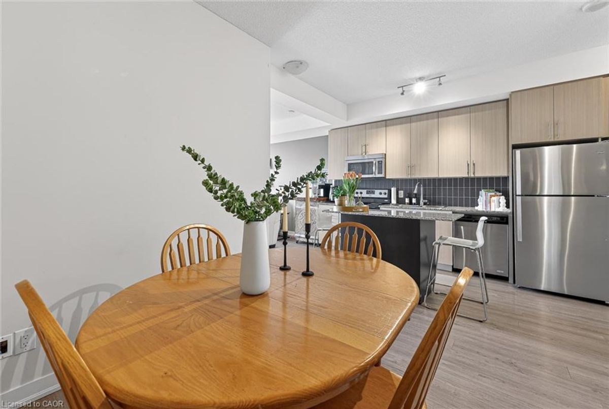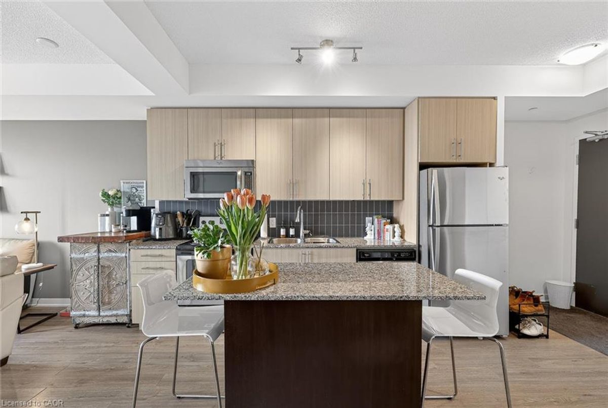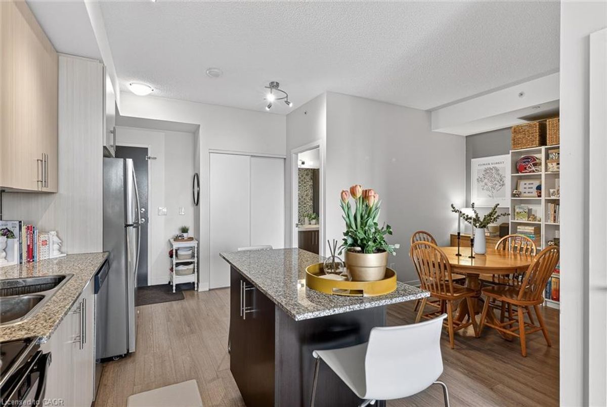 Located in the Heart of Downtown Kitchener! Enjoy the convenience of the ION transit right out front of the building, steps to restaurants, shopping, downtown nightlife, City Hall, the short walk to Victoria Park and all that downtown has to offer. This sophisticated condo building lets you entertain your guests in the fully furnished party room with walkout to the terrific outdoor terrace. This carpet-free unit offers a bright bedroom with walk in closet, a den or dining option, 4pc bathroom ,in-suite laundry, plus an open concept kitchen and living area complete with granite countertops, stainless appliances and a moveable island. The large balcony lets you enjoy all the city views. Your underground parking space and storage locker included. Condo fee includes heat and water. This is your chance to stop paying rent and call a place home.