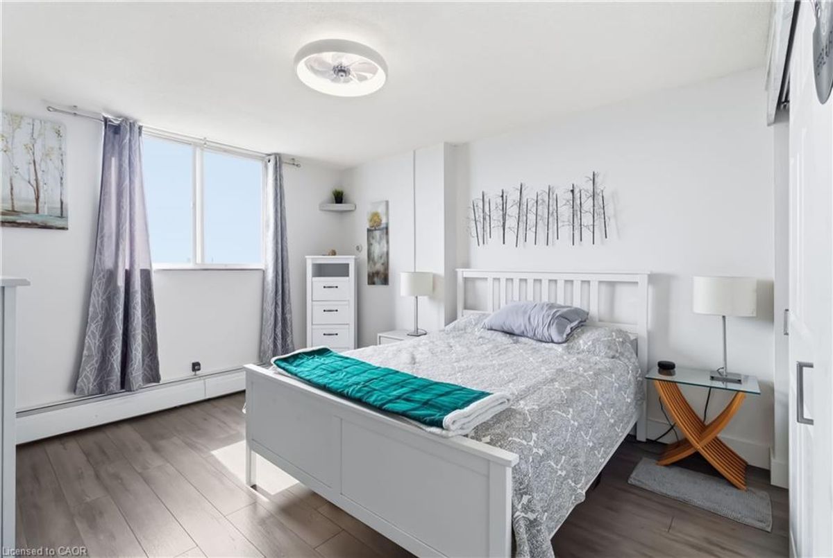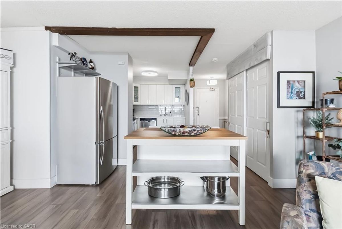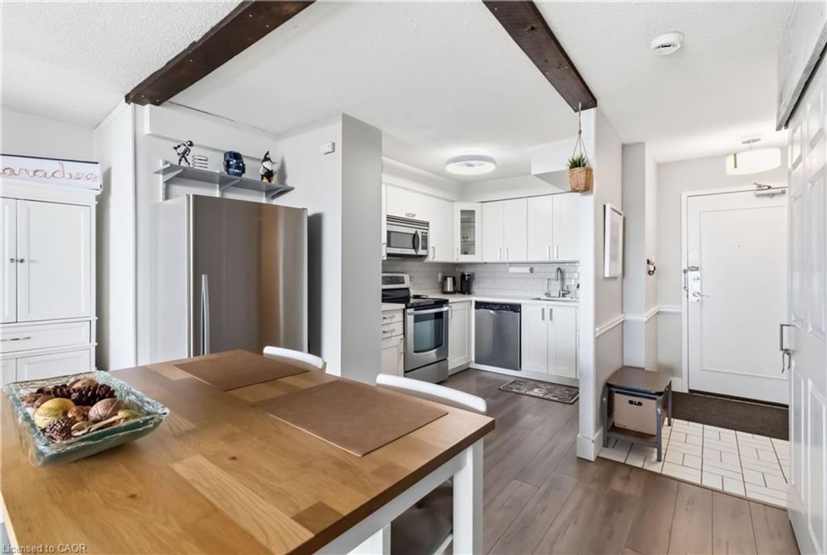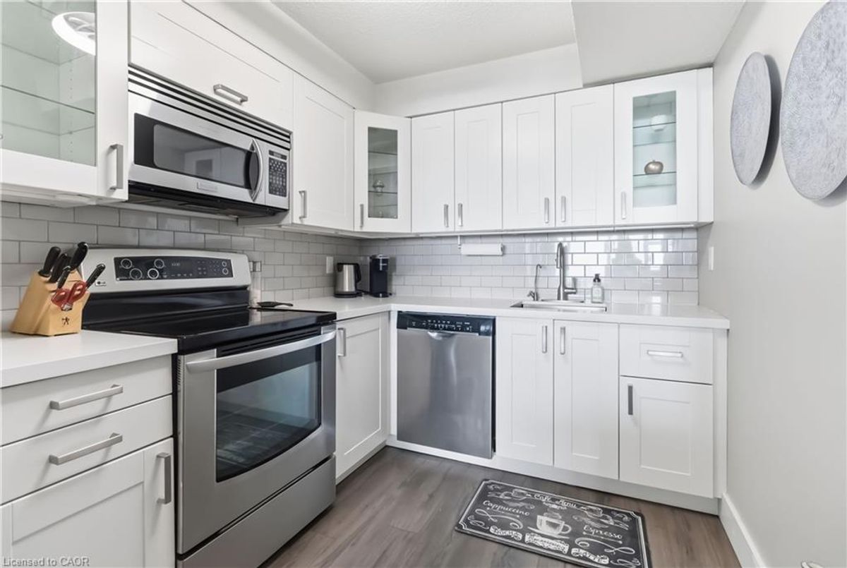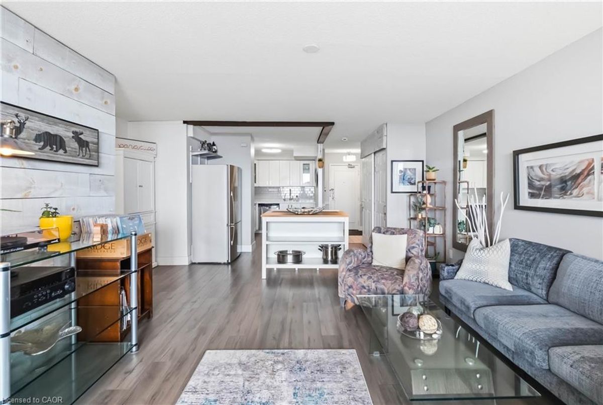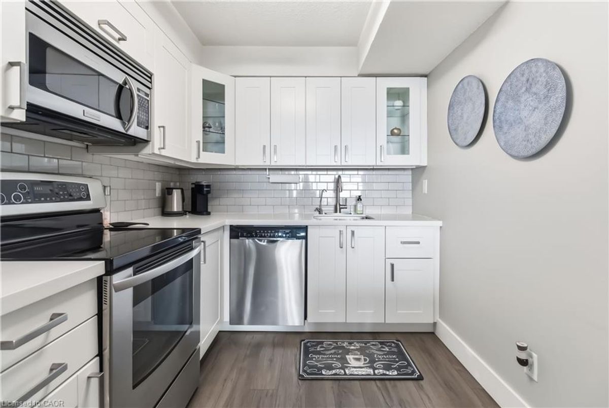 Experience breathtaking views of Lake Ontario from this beautifully maintained two-bedroom condo, offering a spacious, thoughtfully designed layout and a modern, carpet-free interior for effortless, low-maintenance living. The renovated kitchen is a standout, featuring sleek stainless steel appliances and seamless flow into the dining and living areas, making it perfect for both everyday living and entertaining. From the bright living room, step out onto your private, oversized balcony and take in sweeping lake views, an ideal setting to relax or host guests. Additional highlights include a convenient in-suite layout with access to a separate storage room located just across the hall, perfect for seasonal items, bicycles, or extra pantry space. Enjoy the ease of main-floor laundry with newer appliances. Residents have access to an exceptional range of amenities, including an indoor pool, fully equipped fitness centre, billiards and games rooms, a party room, and secure bike storage. Condo fees include all utilities; heat, hydro, water, internet, and cable, offering outstanding value and peace of mind. Perfectly located within walking distance to parks, trails, and everyday shopping, and just minutes from Mapleview Shopping Centre, Spencer Smith Park, vibrant downtown Burlington, and the waterfront. Commuters will appreciate quick access to the Burlington GO Station, QEW, and Highway 403. This exceptional condo offers the perfect blend of lifestyle, location, and value, an opportunity you don’t want to miss.
